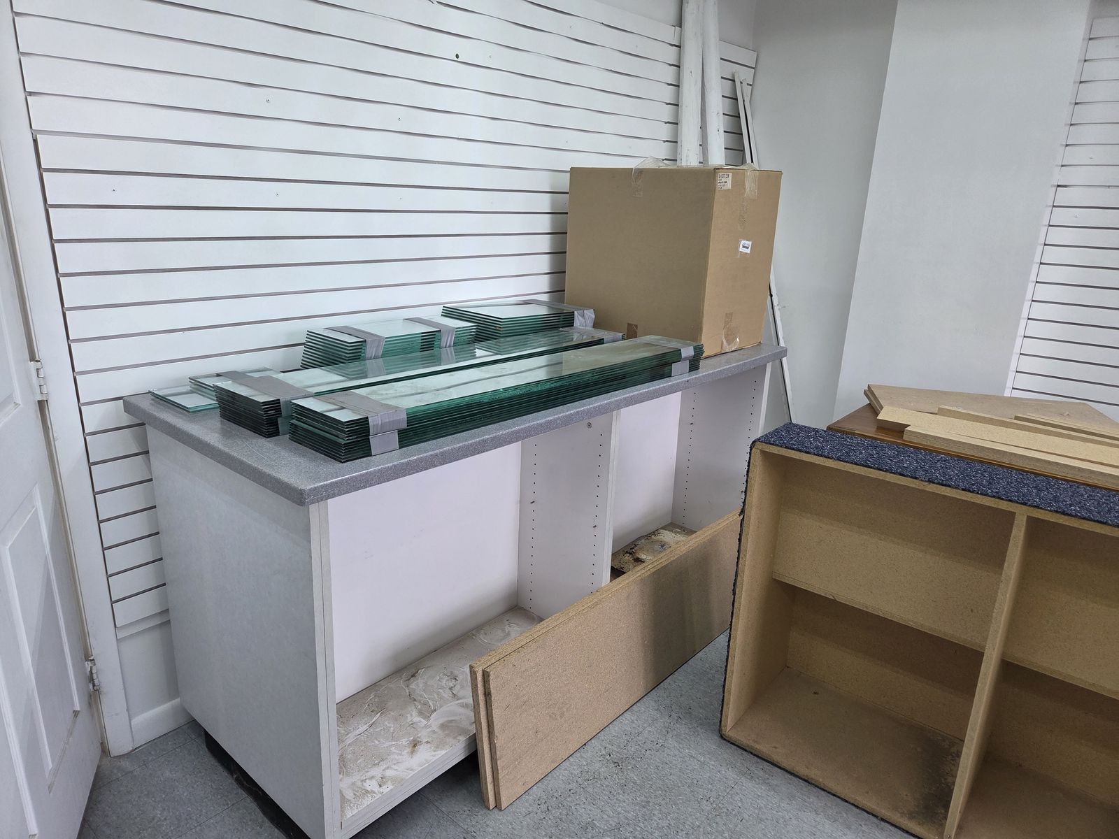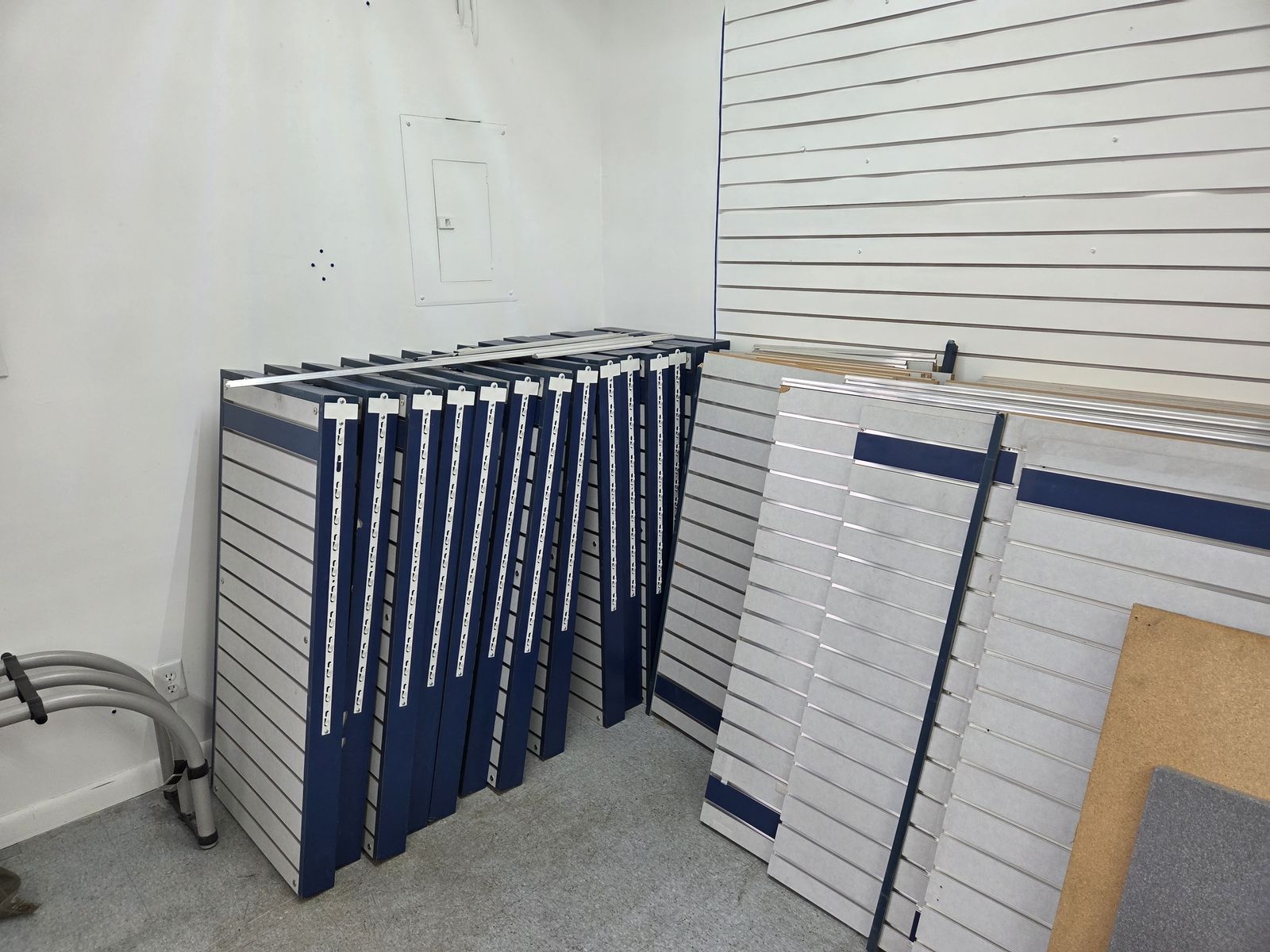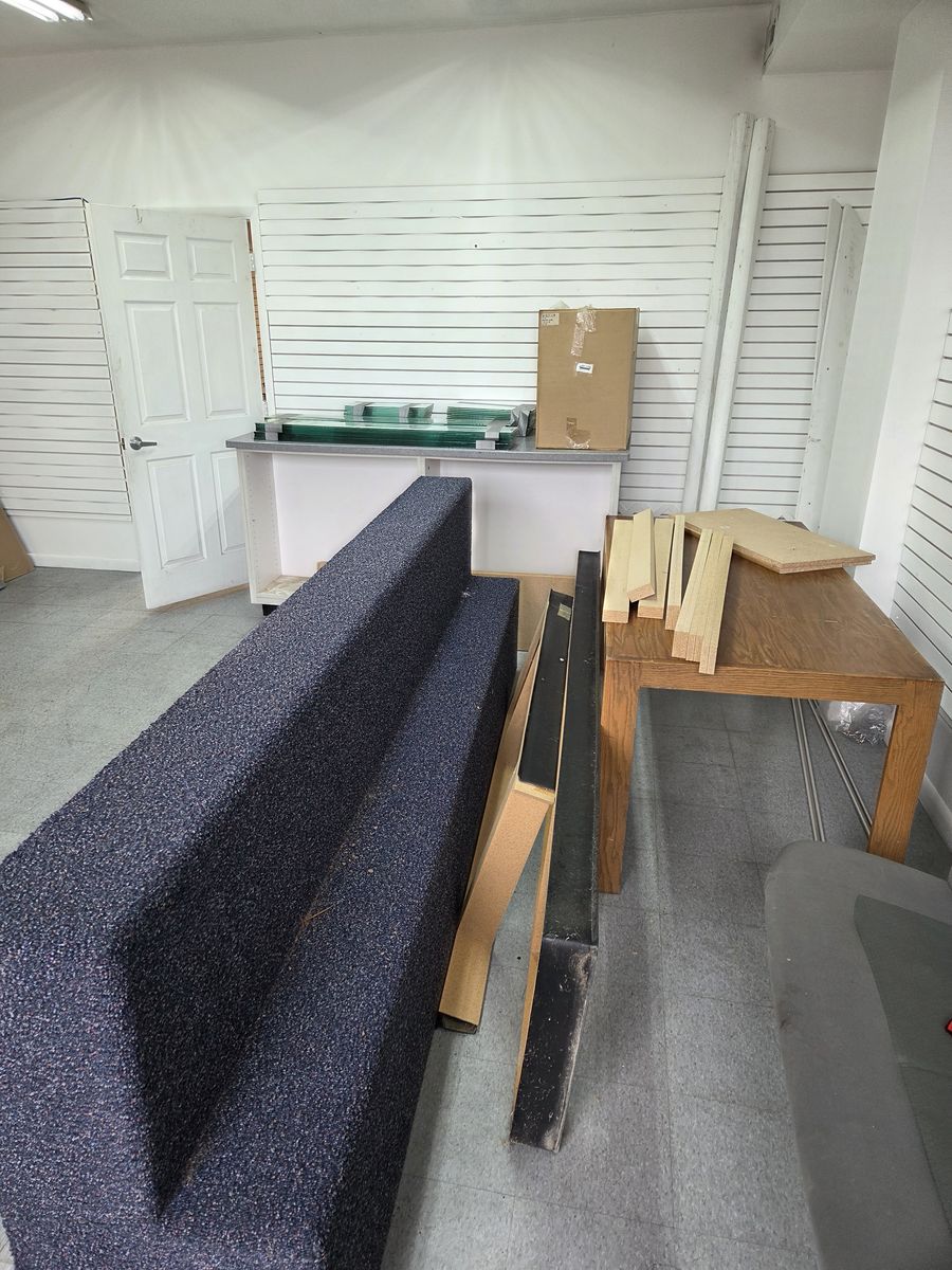 Variety of retail fixtures. Slat wall pieces, Slat wall stands, Pedestals, Counter top with base cabinets, signs, baskets, glass shelves, tables, chairs, slat wall hooks.