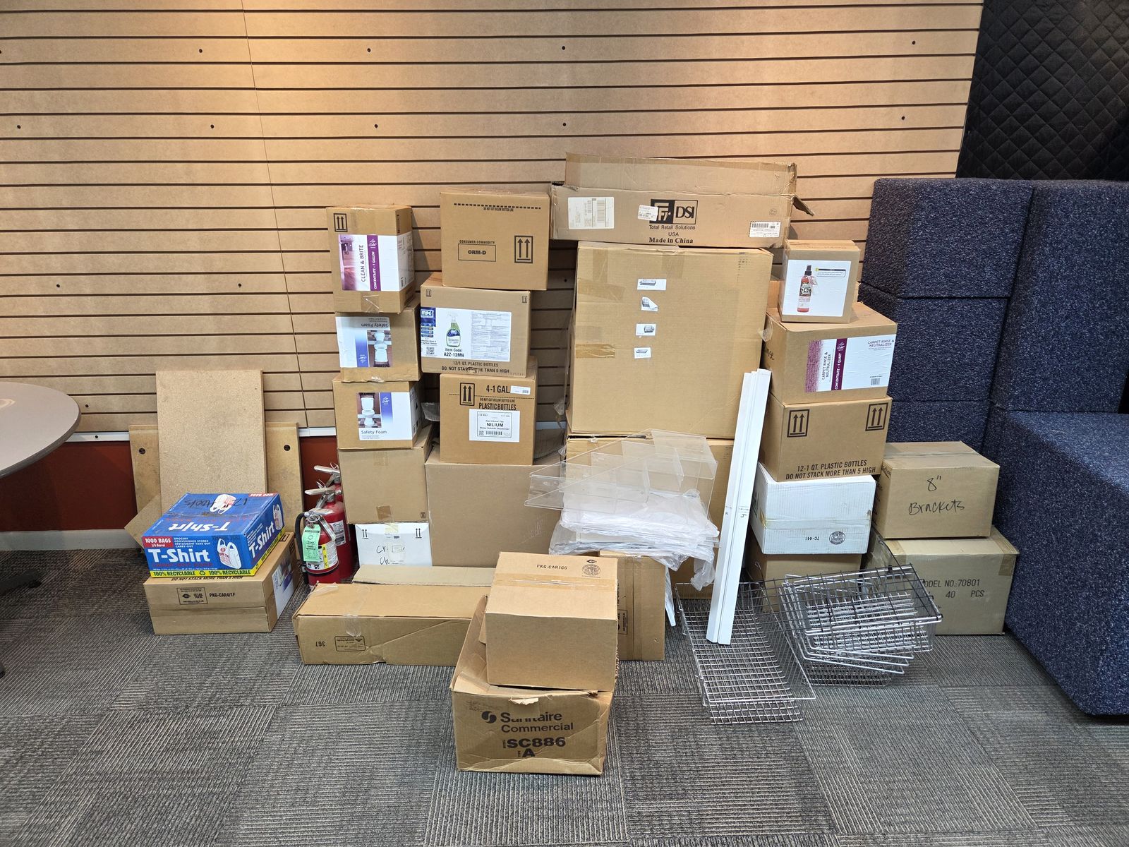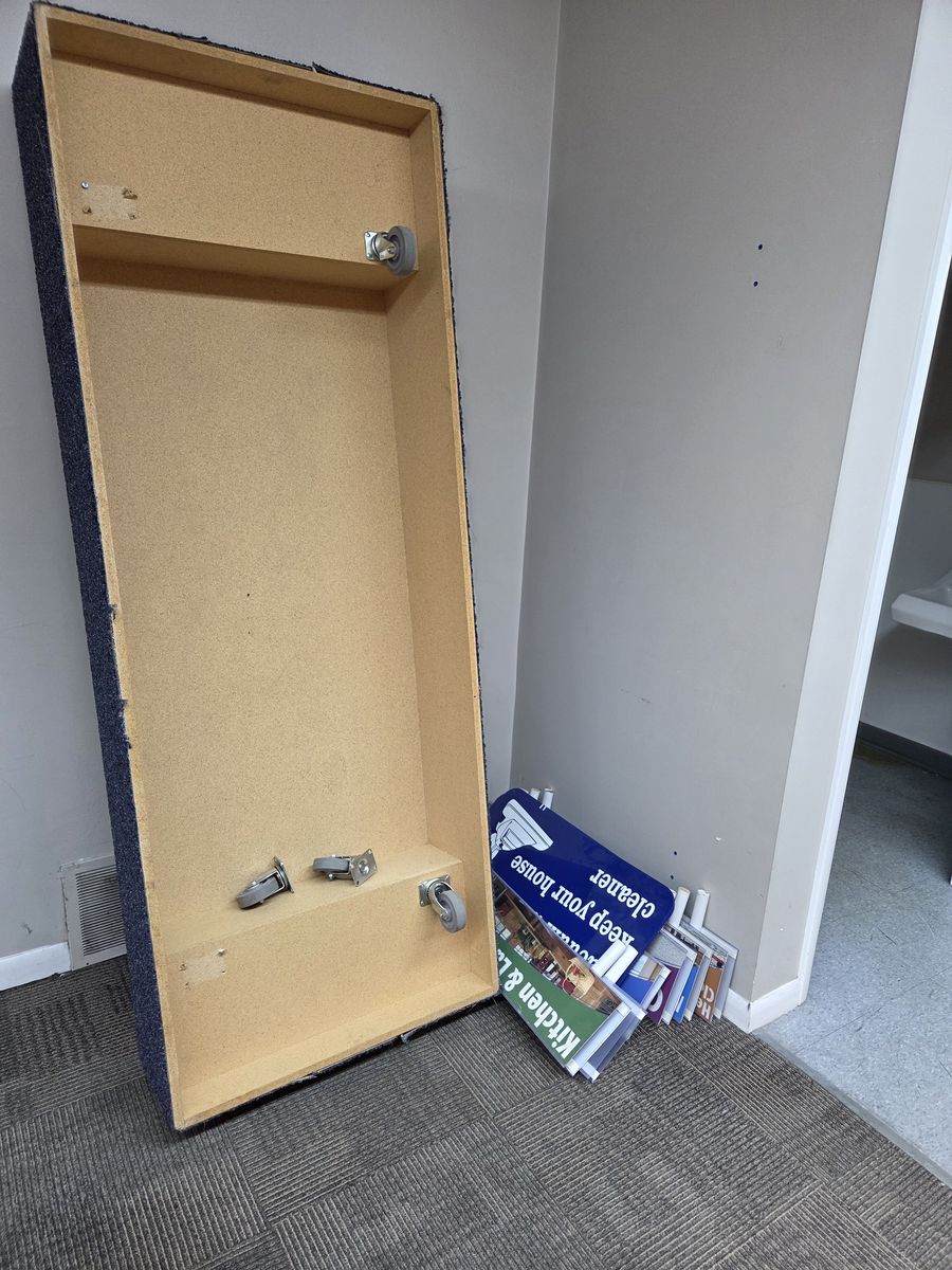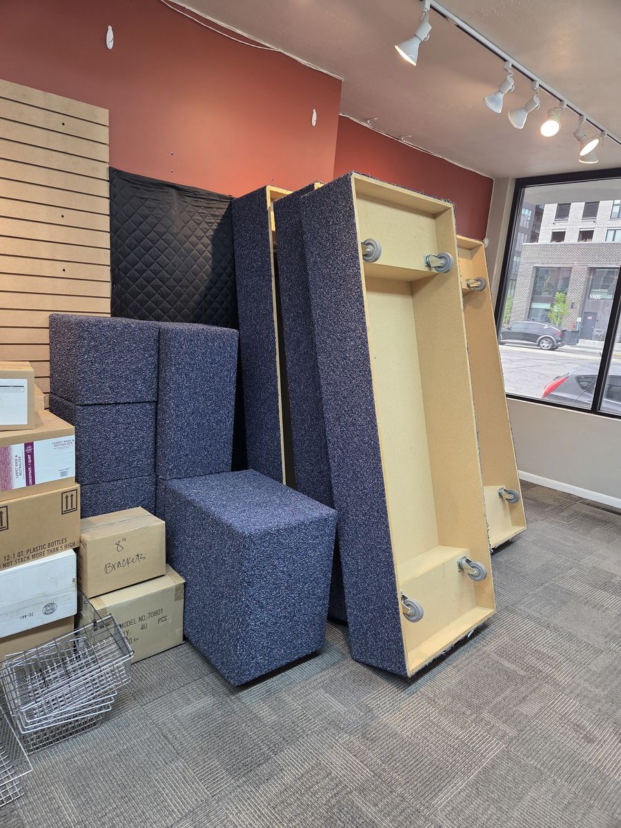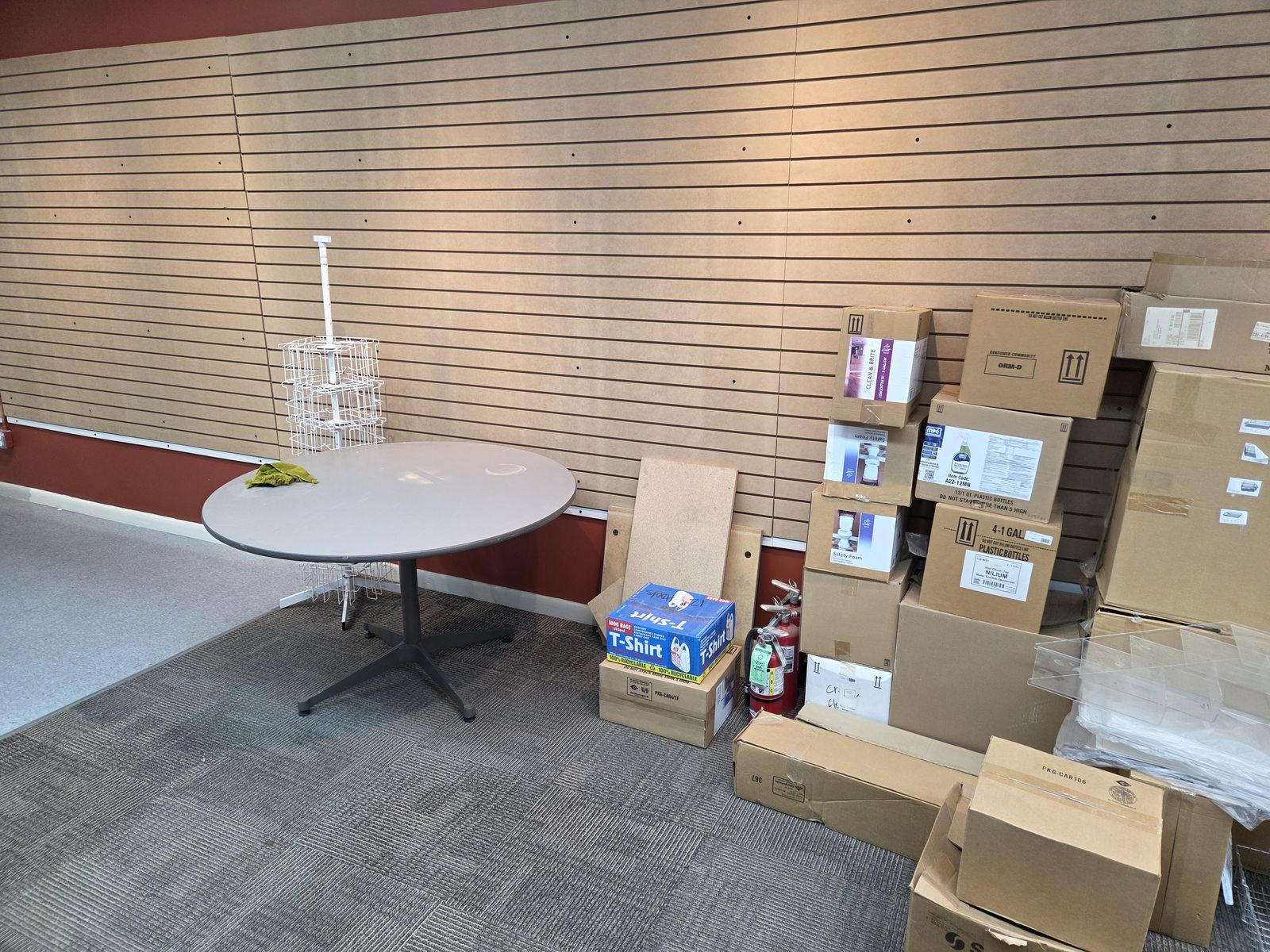 Variety of retail fixtures. Slat wall pieces, Slat wall stands, Pedestals, Counter top with base cabinets, signs, baskets, glass shelves, tables, chairs, slat wall hooks.