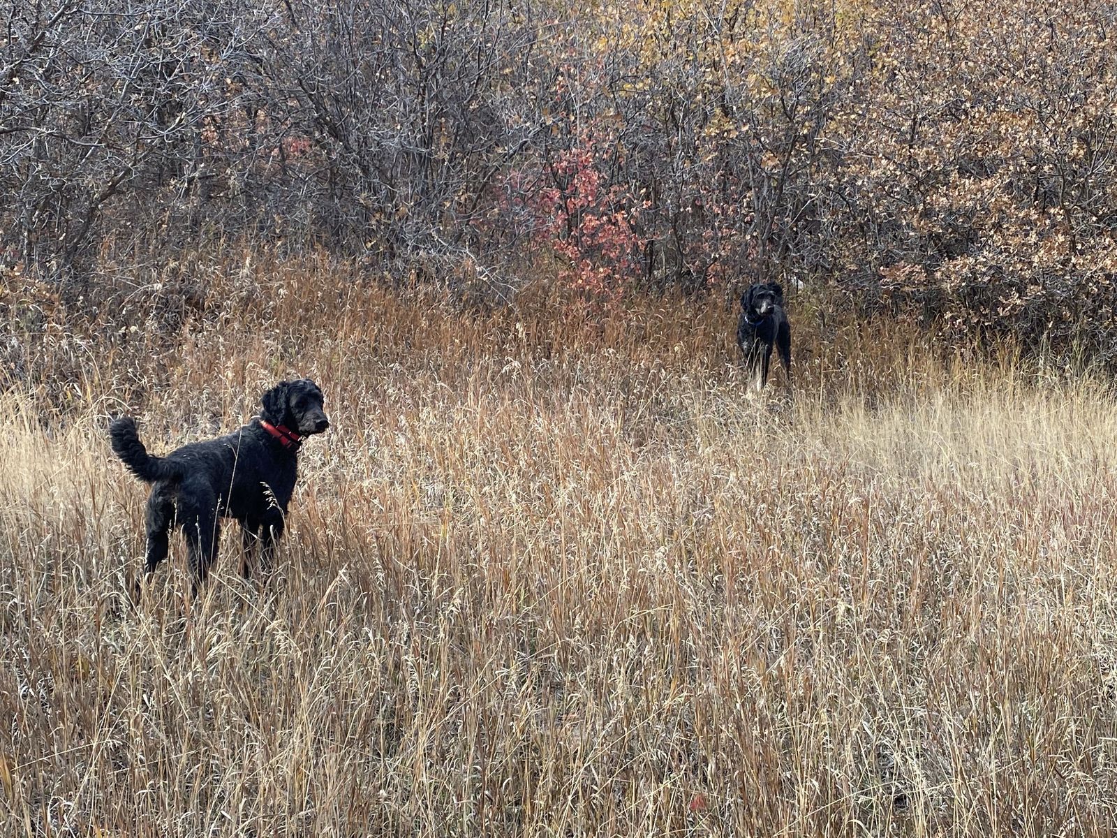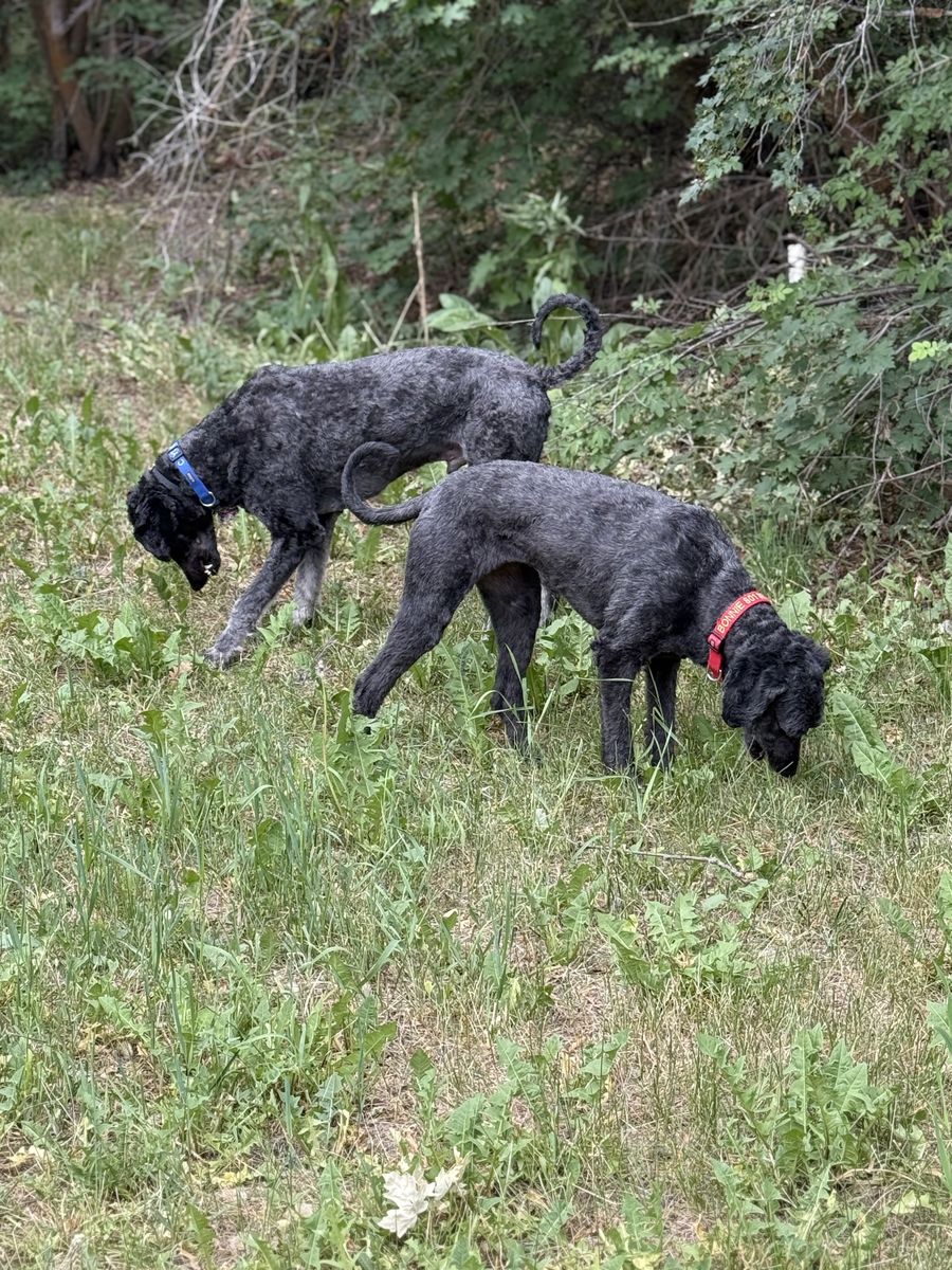 They love socializing with dogs at daycare, going on hikes, or walks, and running around in big open spaces. Their activity level is high. They will not be happy being stuck at home all day. They walk on the leash well. Bonnie is great off leash. Clyde can be too curious and friendly for his own good on walks and requires a leash if the walk is in a busy area. In spaces they can explore he is ok to be off leash.