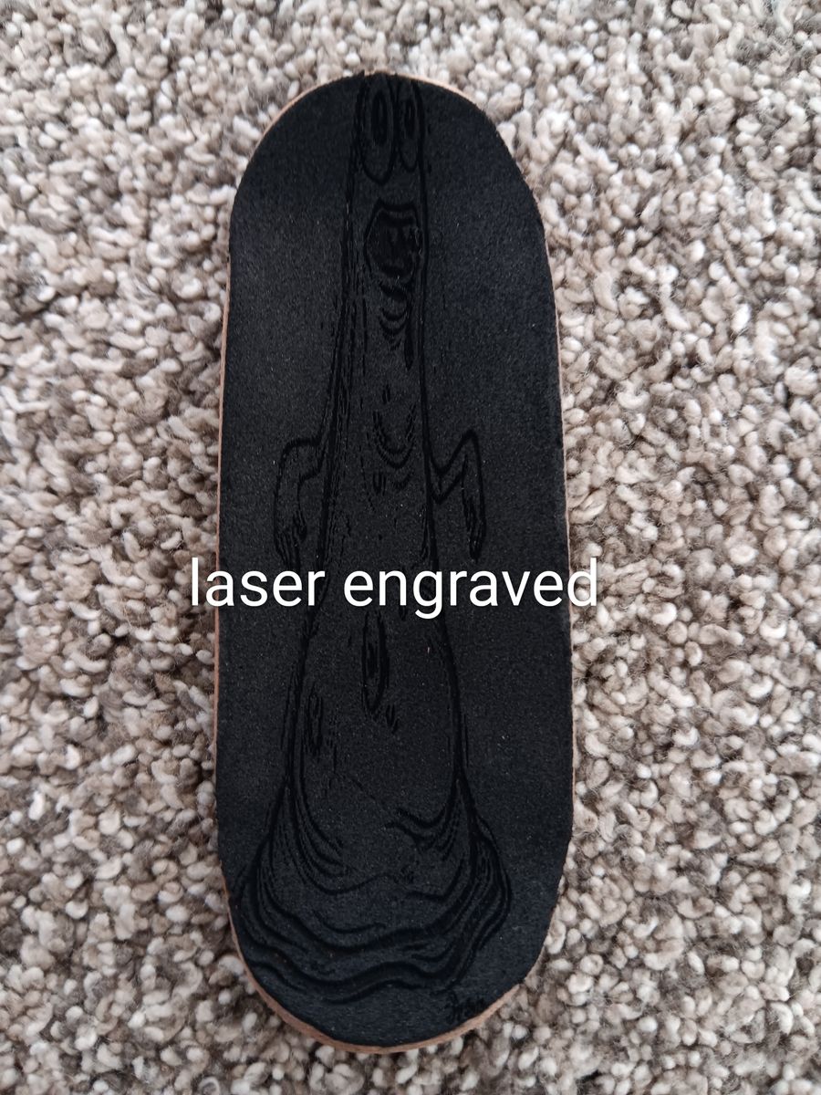 It works great if you have a laser engraver to engrave lightly on the griptape and the settings of 3000mm per second at the power of 20. It is completely safe to engrave on the foam griptape and I did tons of research for it. You can also cut out the board with an engraver if you want it to be perfect but I didn't mess around with that a lot.