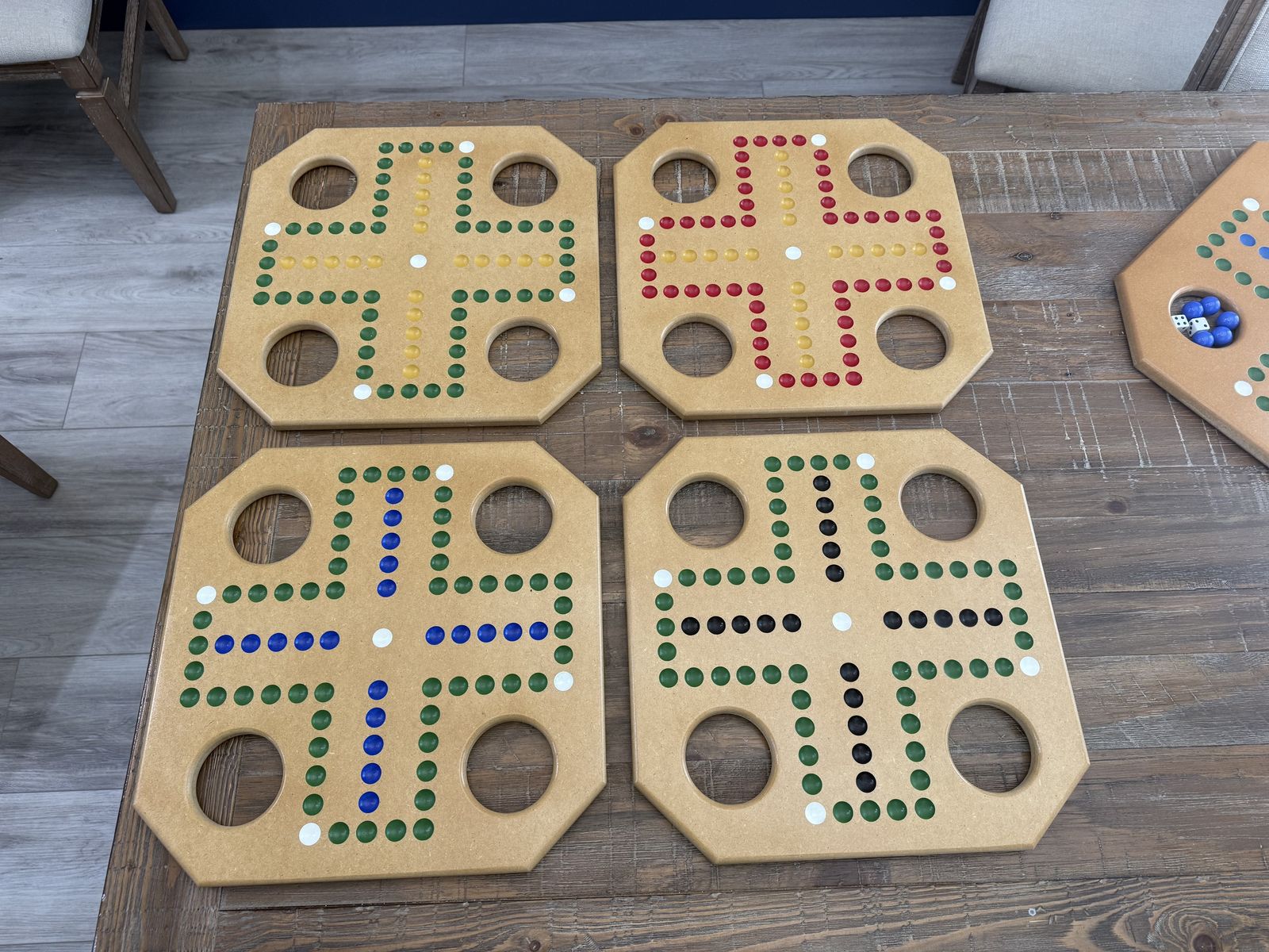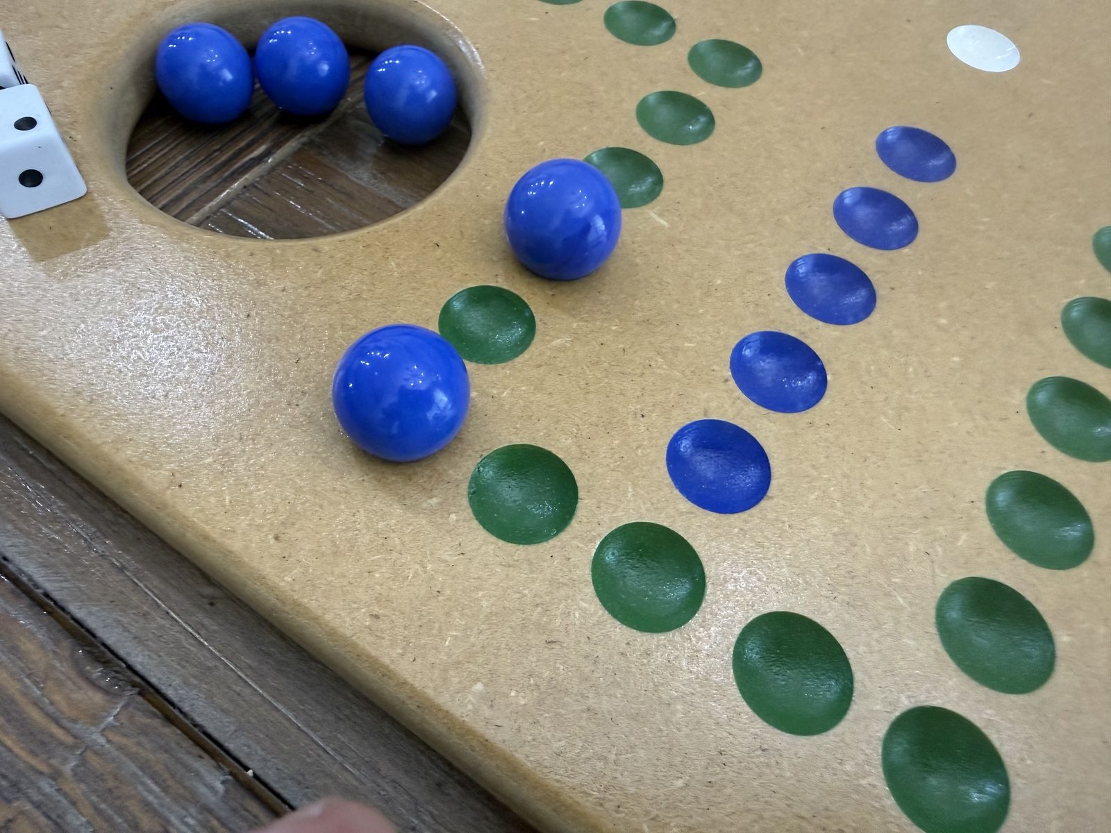 VenmoI have been making these boards for 45 years. I use MDF for extra smooth surface, edges and dimples. I provide 20 extra large marbles which are easier to grab and move. These games also include 8 dice and an instruction / rules sheet. I spray on 3 coats of clear laquer, and do a fine sanding between each coat. Games are $55.00 each. Keep one in your camper, cabin and at home. These make great gifts.