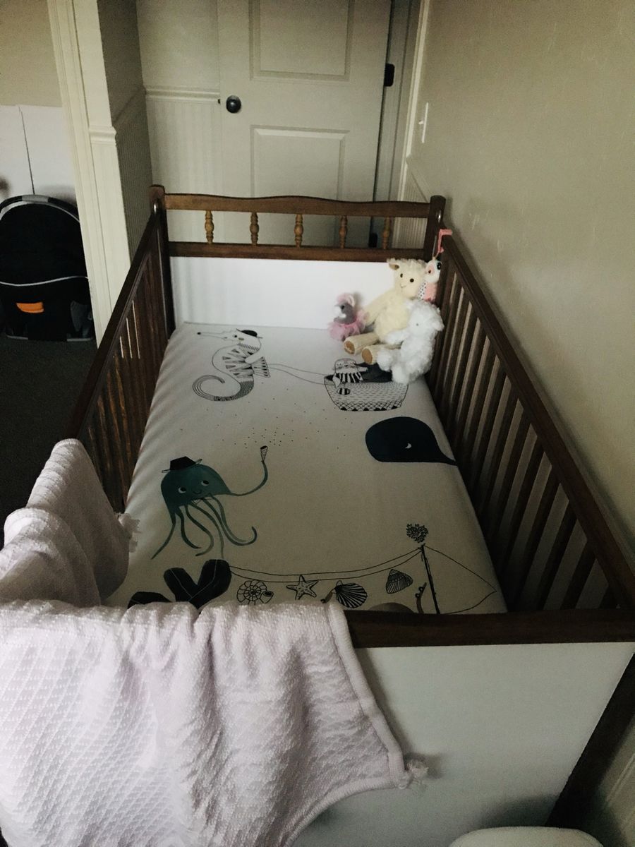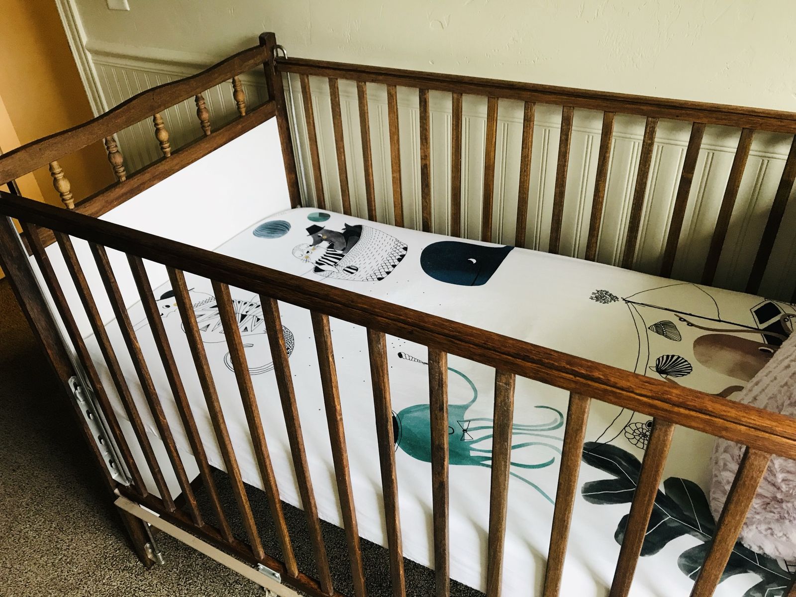 Great crib, has settings for the mattress to be high for newborn age or to sit low when baby is older. Metal foot bar lets the side bars down to pick up baby easier. Have a baby mattress to go with it if you want. $100 OBO