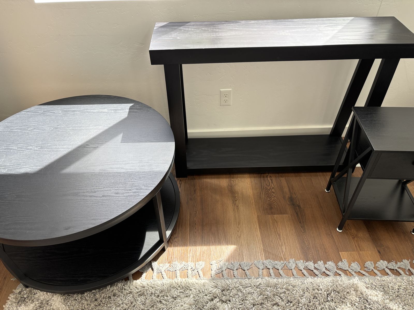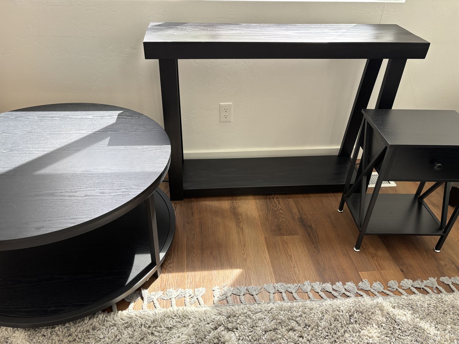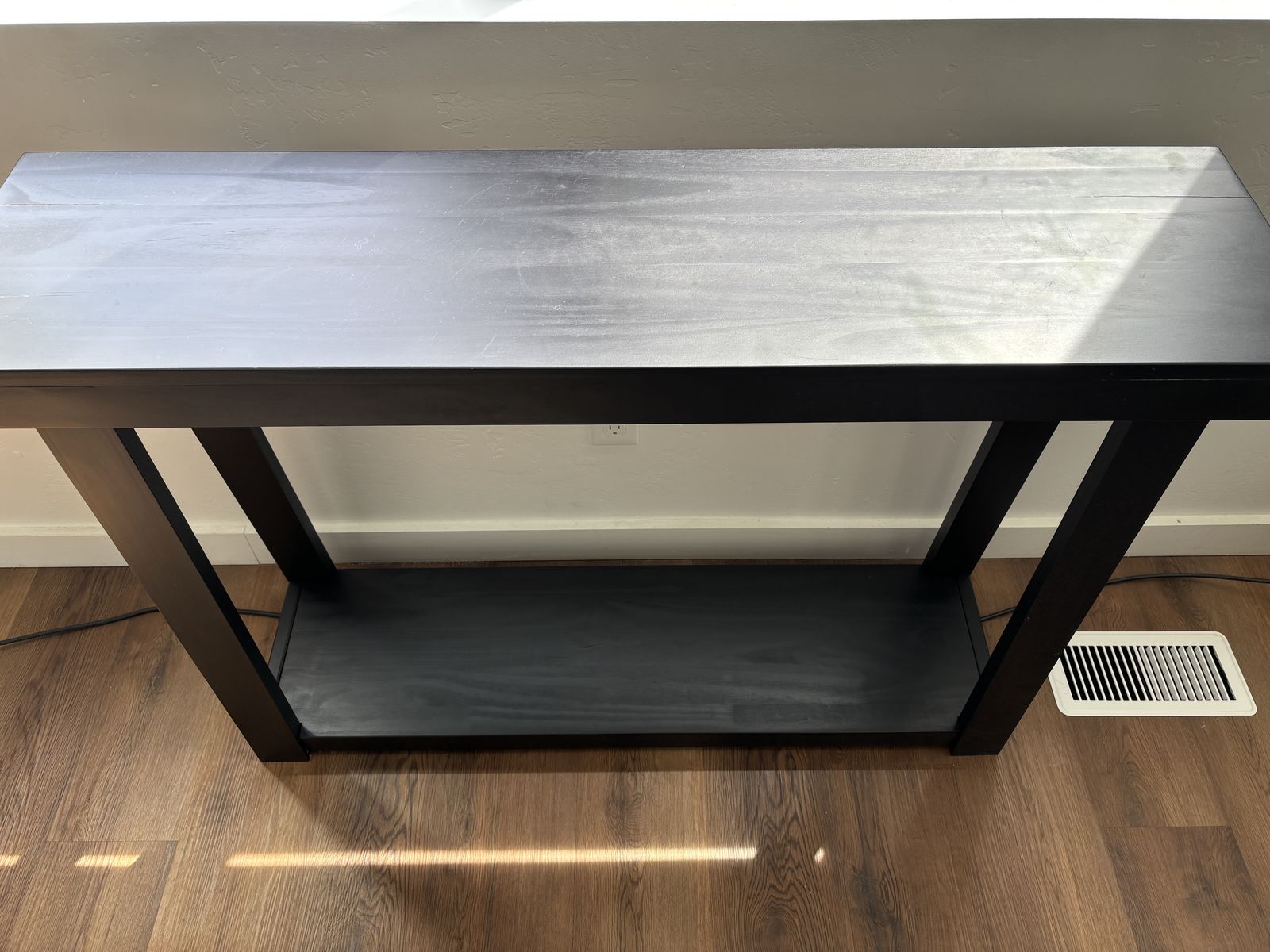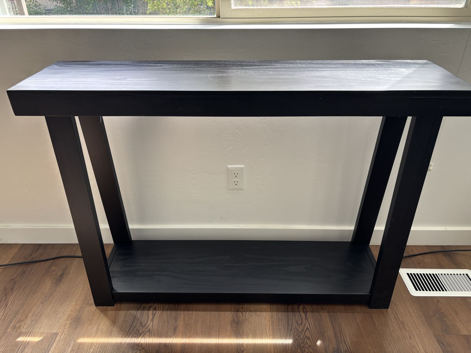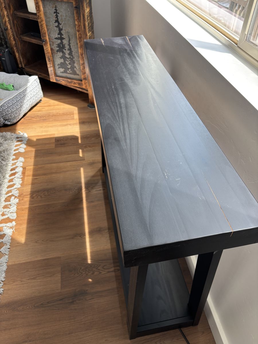 1 x Entryway Table (Black) - Good Condition - Slight cosmetic damage (there are two cracks in finish along top panel at each end, not structural cracks. Looks repairable and small, but we're now unable to commit the time/effort towards a fix.)