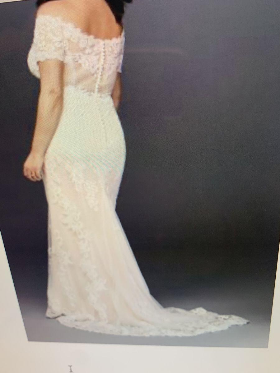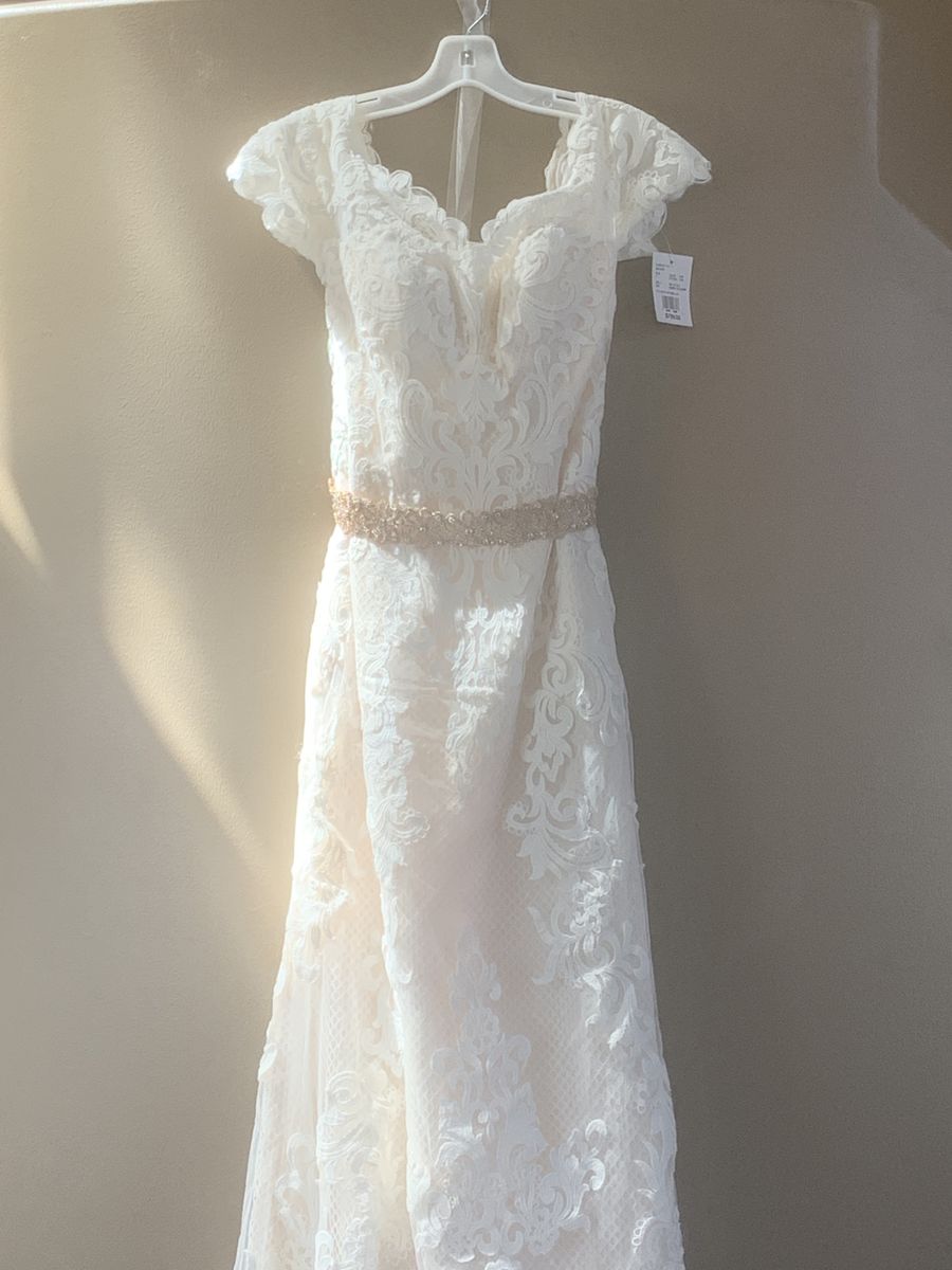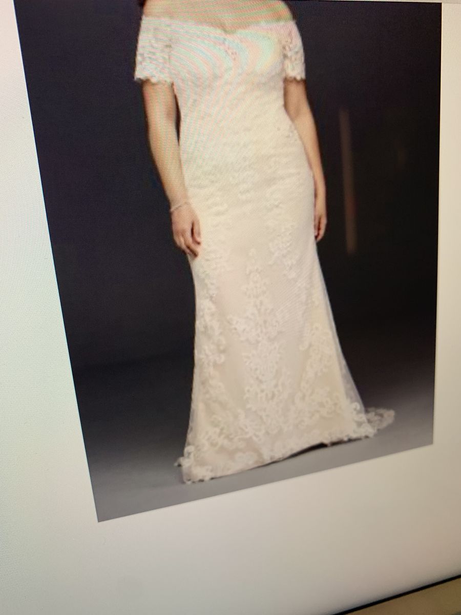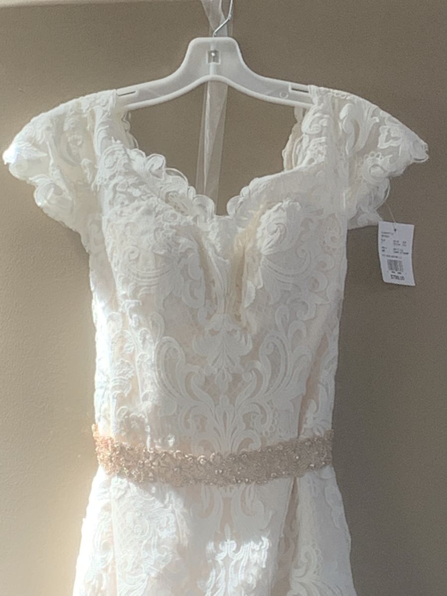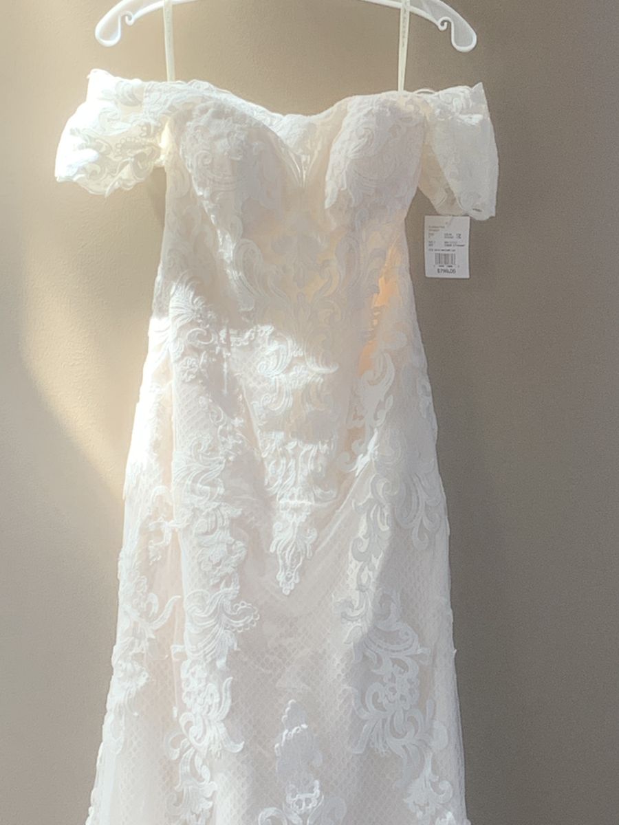 VenmoBrand new designer wedding dress By Galina, size 6- never used still with tags and stored in wedding dress hanging bag. Color ivy champagne, off the shoulder covered in lace with a honeycombed textured layer and classic sheath fitted at the waist. Falls straight to the floor with minimal flare and chapel train. A sash mashie belt is included, can be used with or without belt. Absolutely beautiful dress! $399 obo