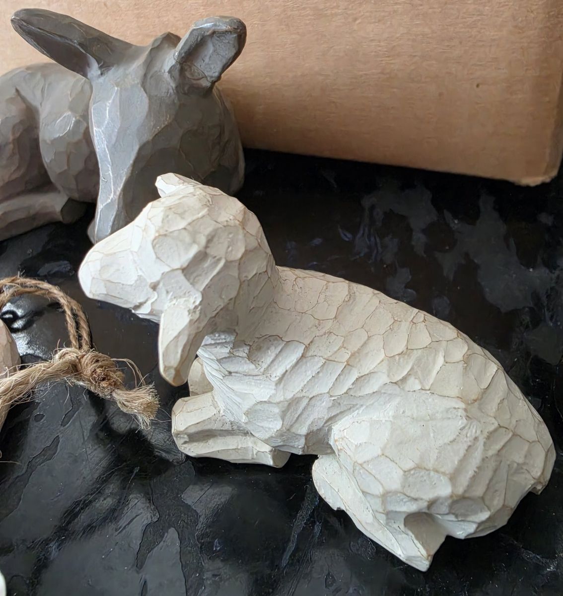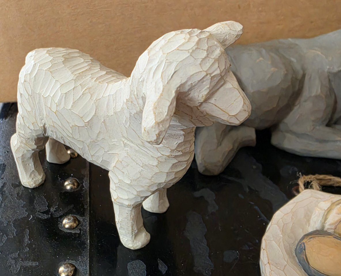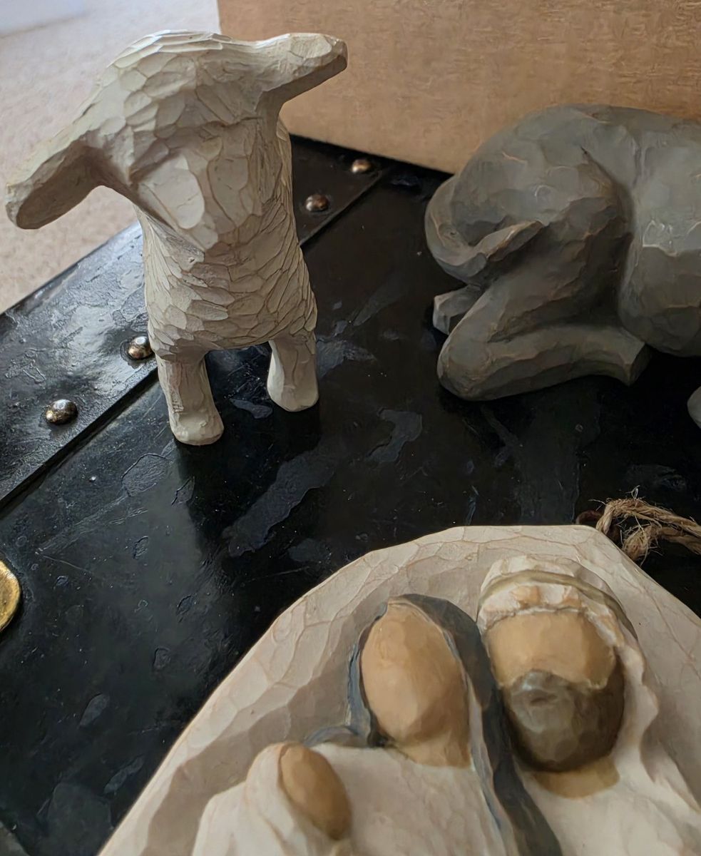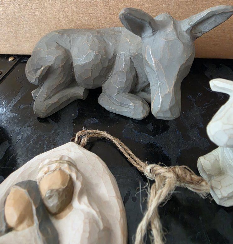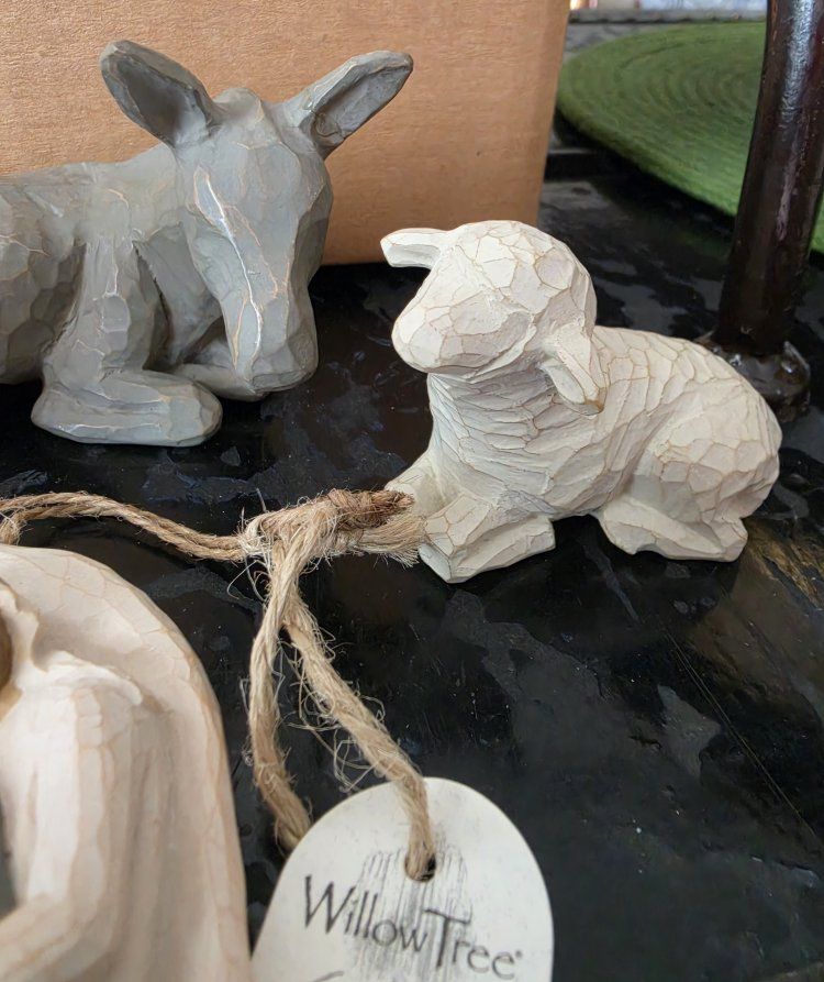 Nativity donkey, standing sheep and laying sheep and Holy Family hanging ornament. $20 takes all