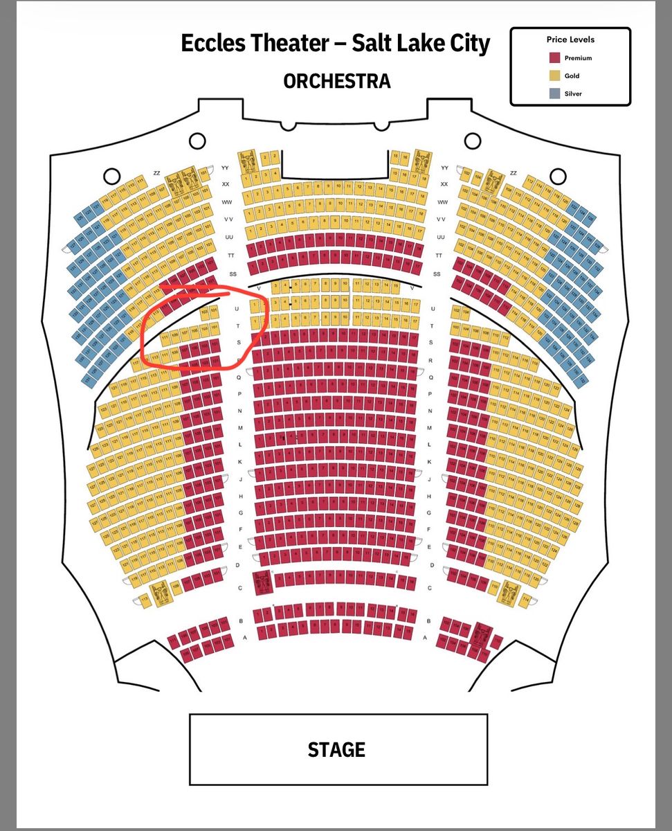 2 tickets for May 1 at 6:00 at the Eccles Theater. Orchestra Right section, row T. $40 each, normally $55 (including fees).