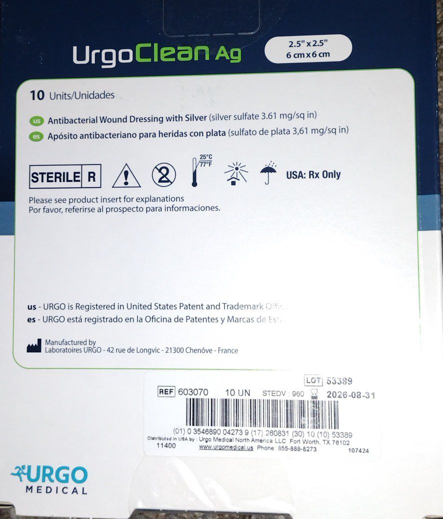 PayPalUrgoTUI Ag silver 8"x16" ref # 553228 2028/03/31 1 box of 5 plus 3 unopened green foil packages, in total 8 unopened green foil packages 8"x16" wound care debreadmant dressings. also 3 boxes UrgoClean Ag antibacterial wound care dressings with silver 2.5"x2.5" 10pks per box ref # 603070 I used these on my veinous stasis ulcers I had on my feet the silver killed the infection and the best part was how much it helped with the pain with the nerve endings exposed I was literally gritting my teeth in agony these dressings were a godsend and they even work better if you have the silver ointment to put a thin layer on first made my life bearable again anyway I had these extra and was trying to get some of my money back asking $60 for all -8-8"x16" foil sealed sheets and 3 boxes 10 each 30 total 2.5"x2.5"