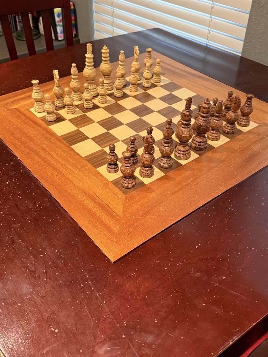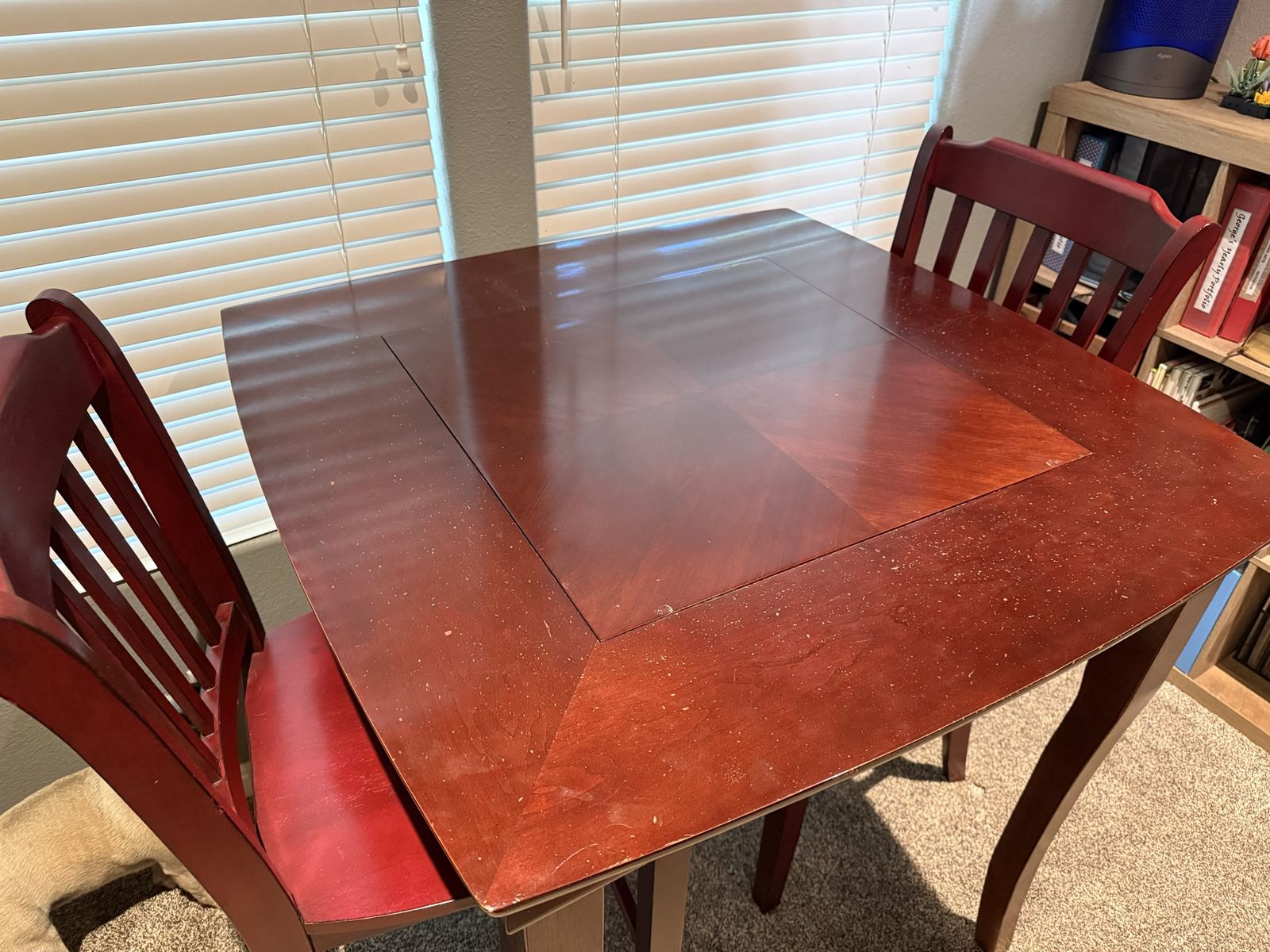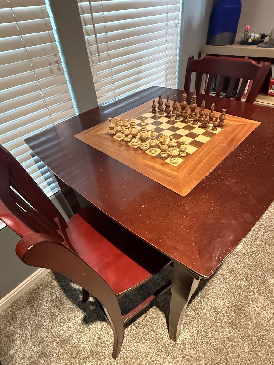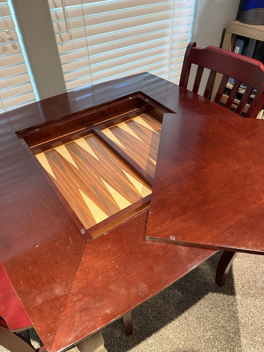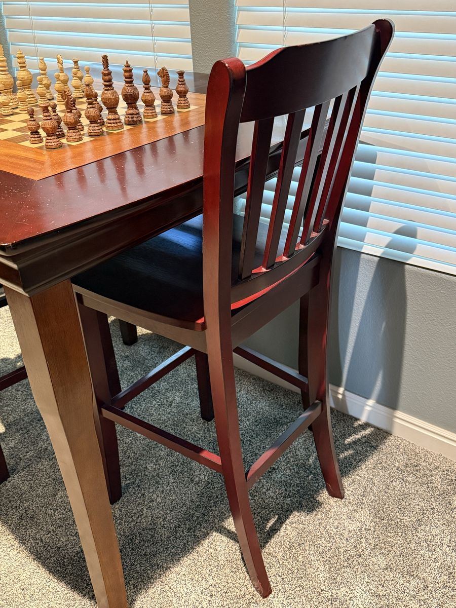 VenmoThis is a lovely, sturdy piece of furniture. The tabletop is 40”x40” and it is 40” tall. Cherry wood chairs are 28” tall at the seat and were purchased new two years ago. Insert in table can be a chess/checker board, flipped over to be a regular matching tabletop, or removed to expose the Backgammon board beneath. Comes with complete wooden large set of chess pieces. Everything is of very high quality and built to last. The tabletop does have some small markings across the top showing normal wear, but still in amazing shape.