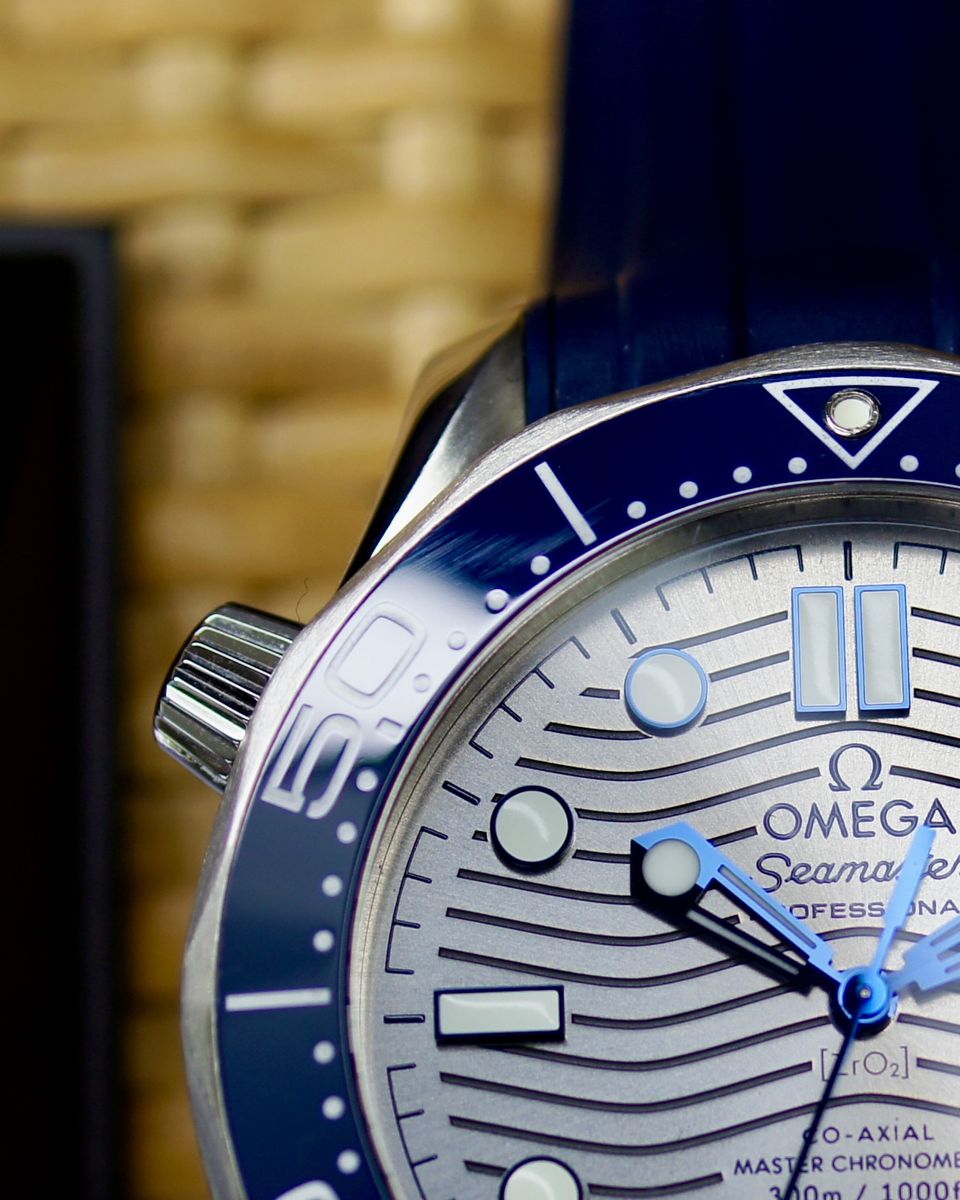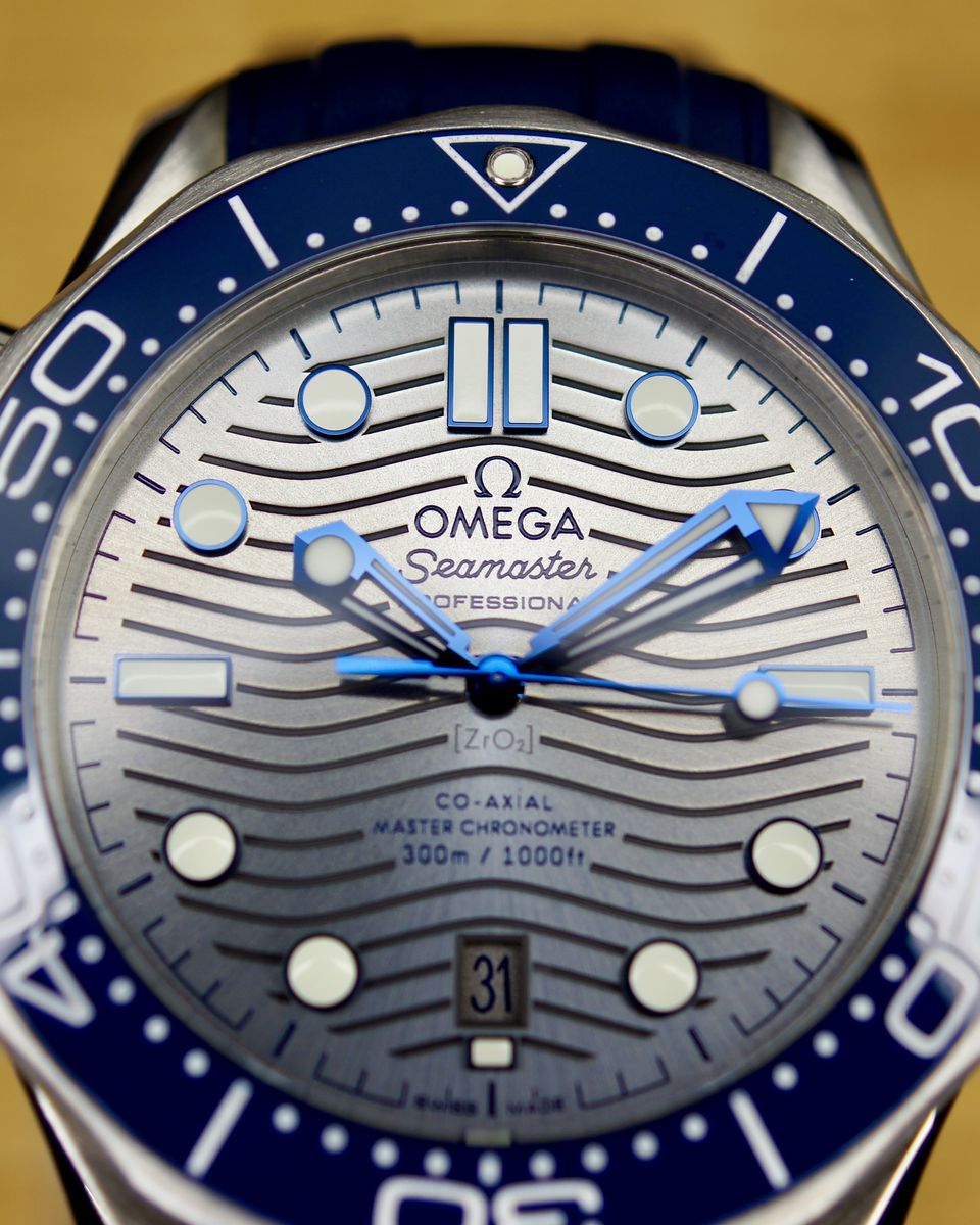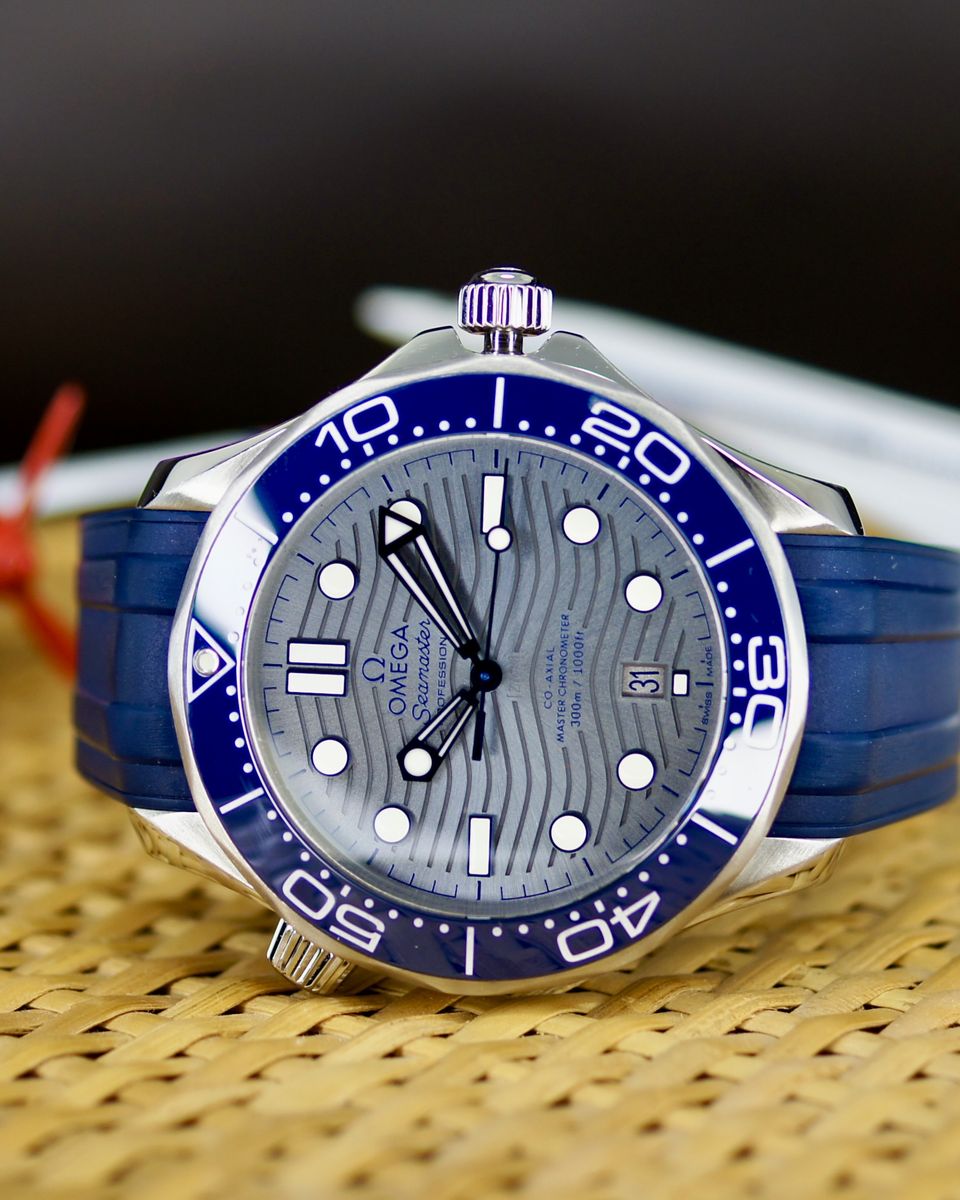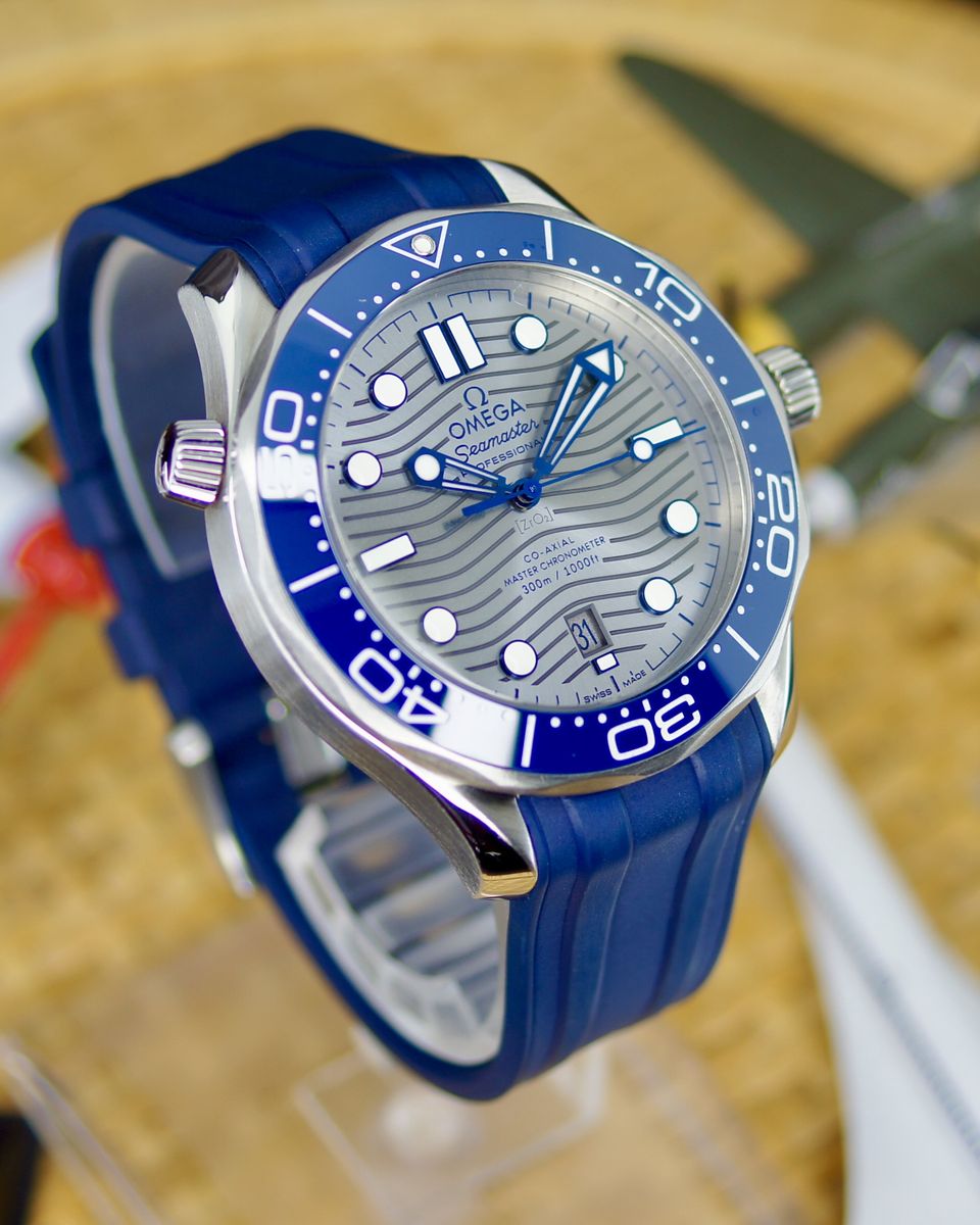 This is a an iconic Omega Seamaster Diver 300M. It’s a 2021, but looks and wears like it’s new. It’s a tough, stylish dive watch that's all about blending pro-level features with everyday cool. It's got a 42mm stainless steel case with a bold blue ceramic dial featuring wave patterns, glowing hands and markers, and a date at 6 o'clock. The blue ceramic bezel has a white dive scale, plus a helium escape valve for serious underwater action up to 300m. The dial is sun-brushed PVD chrome color (gray) ceramic and features laser-engraved waves. Inside, the anti-magnetic Calibre 8800 keeps it ticking with a 55-hour reserve, visible through the sapphire back. It comes on a comfy green rubber strap with a steel buckle—perfect for dives or daily wear.