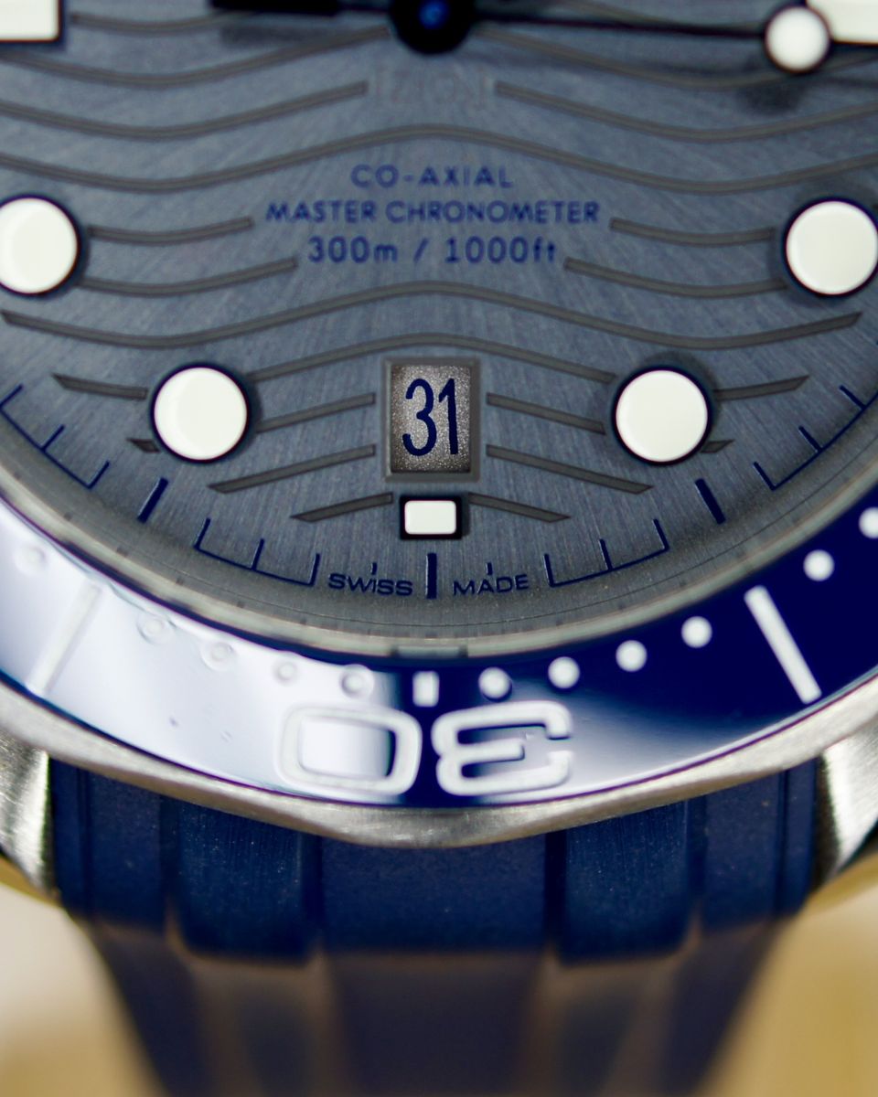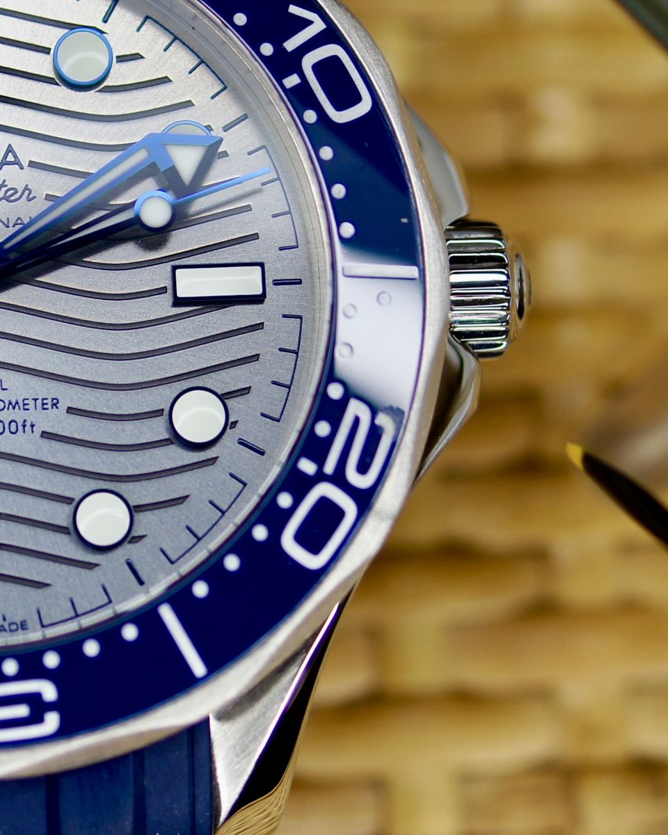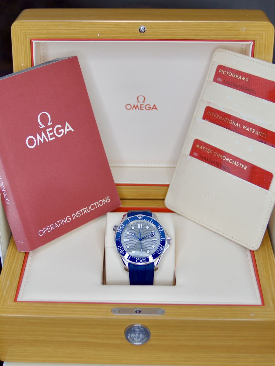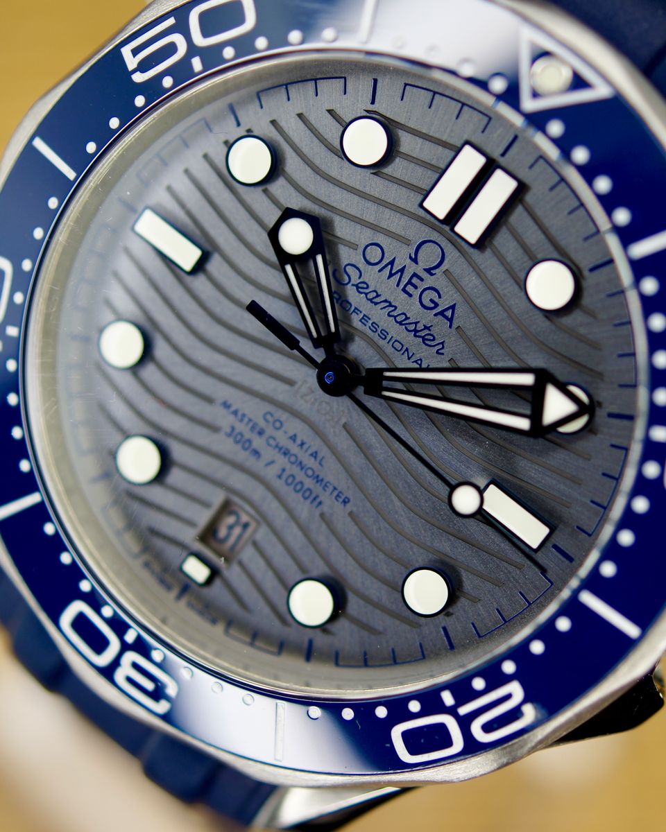 This is a an iconic Omega Seamaster Diver 300M. It’s a 2021, but looks and wears like it’s new. It’s a tough, stylish dive watch that's all about blending pro-level features with everyday cool. It's got a 42mm stainless steel case with a bold blue ceramic dial featuring wave patterns, glowing hands and markers, and a date at 6 o'clock. The blue ceramic bezel has a white dive scale, plus a helium escape valve for serious underwater action up to 300m. The dial is sun-brushed PVD chrome color (gray) ceramic and features laser-engraved waves. Inside, the anti-magnetic Calibre 8800 keeps it ticking with a 55-hour reserve, visible through the sapphire back. It comes on a comfy green rubber strap with a steel buckle—perfect for dives or daily wear.