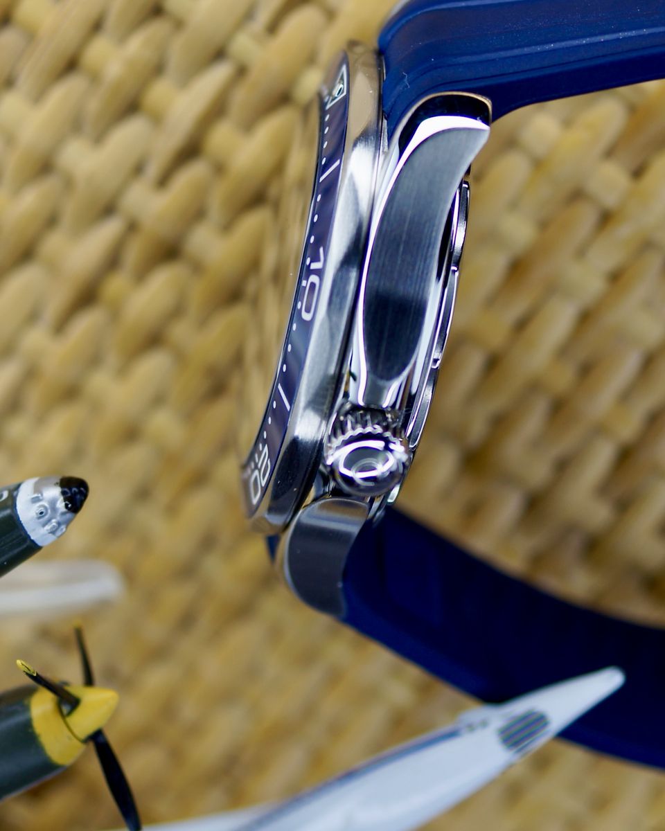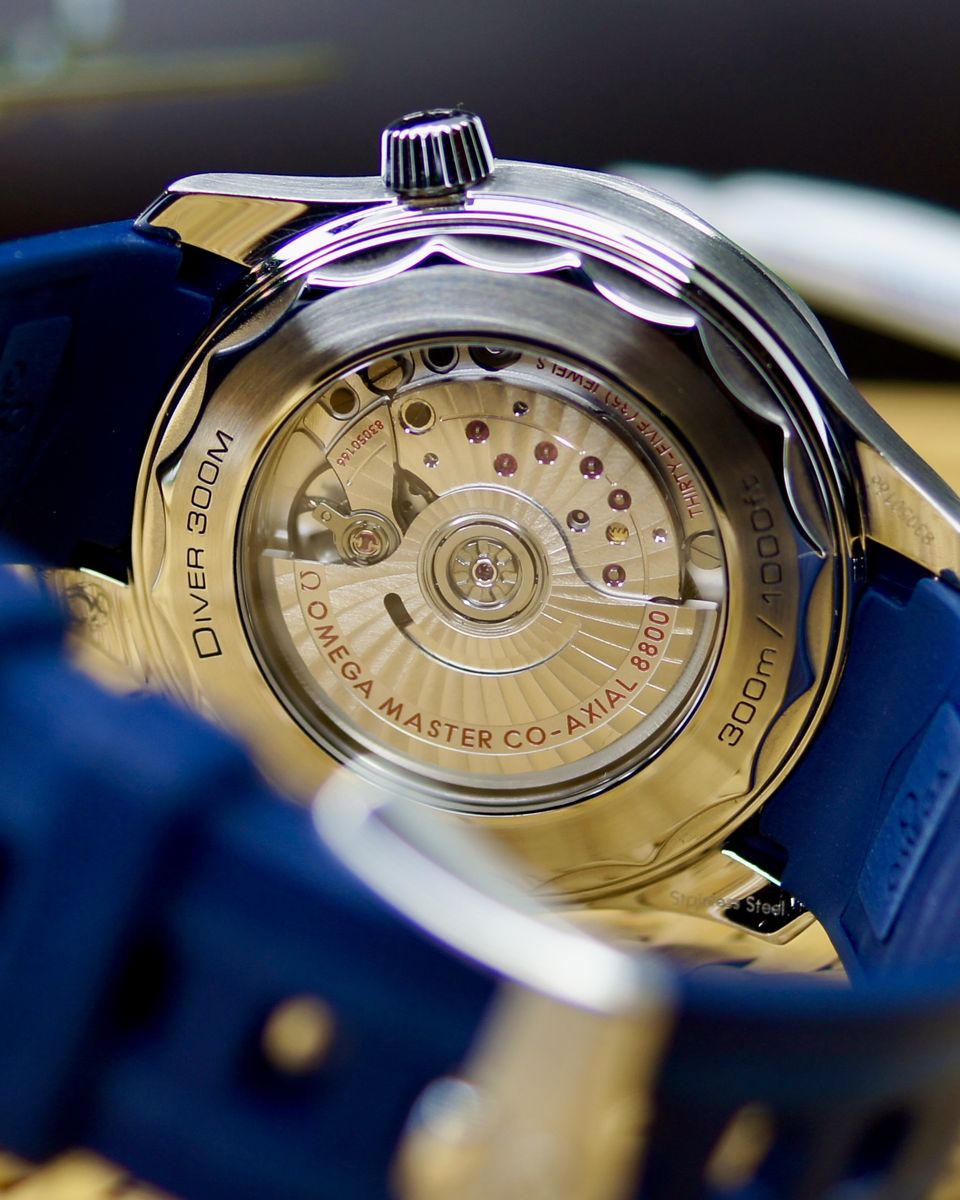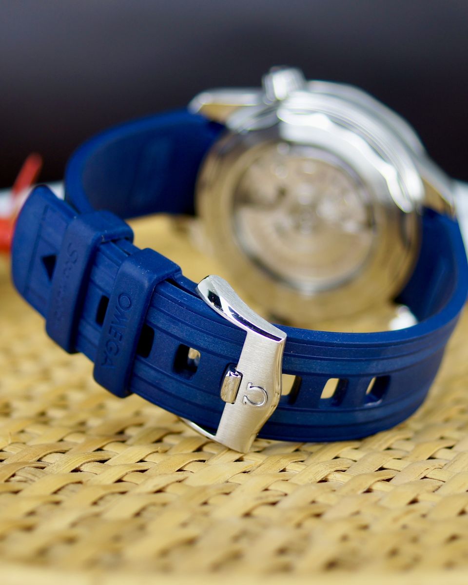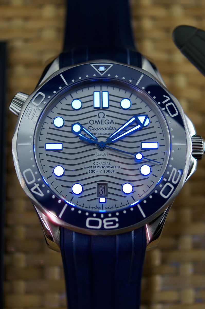This is a an iconic Omega Seamaster Diver 300M. It’s a 2021, but looks and wears like it’s new. It’s a tough, stylish dive watch that's all about blending pro-level features with everyday cool. It's got a 42mm stainless steel case with a bold blue ceramic dial featuring wave patterns, glowing hands and markers, and a date at 6 o'clock. The blue ceramic bezel has a white dive scale, plus a helium escape valve for serious underwater action up to 300m. The dial is sun-brushed PVD chrome color (gray) ceramic and features laser-engraved waves. Inside, the anti-magnetic Calibre 8800 keeps it ticking with a 55-hour reserve, visible through the sapphire back. It comes on a comfy green rubber strap with a steel buckle—perfect for dives or daily wear.