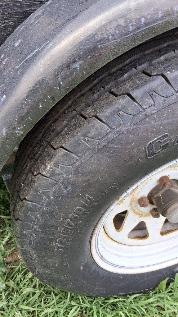 Venmo8.5' Handy utility trailer. Has a mesh ramp at the back. Wood floor is painted red. Sides are wood with black paint, shows some wear. Good tires with a covered spare. Stabilizer jacks on the rear corners. Good for moving yard stuff, small furniture, 4-wheelers, dirt bikes and camping gear.