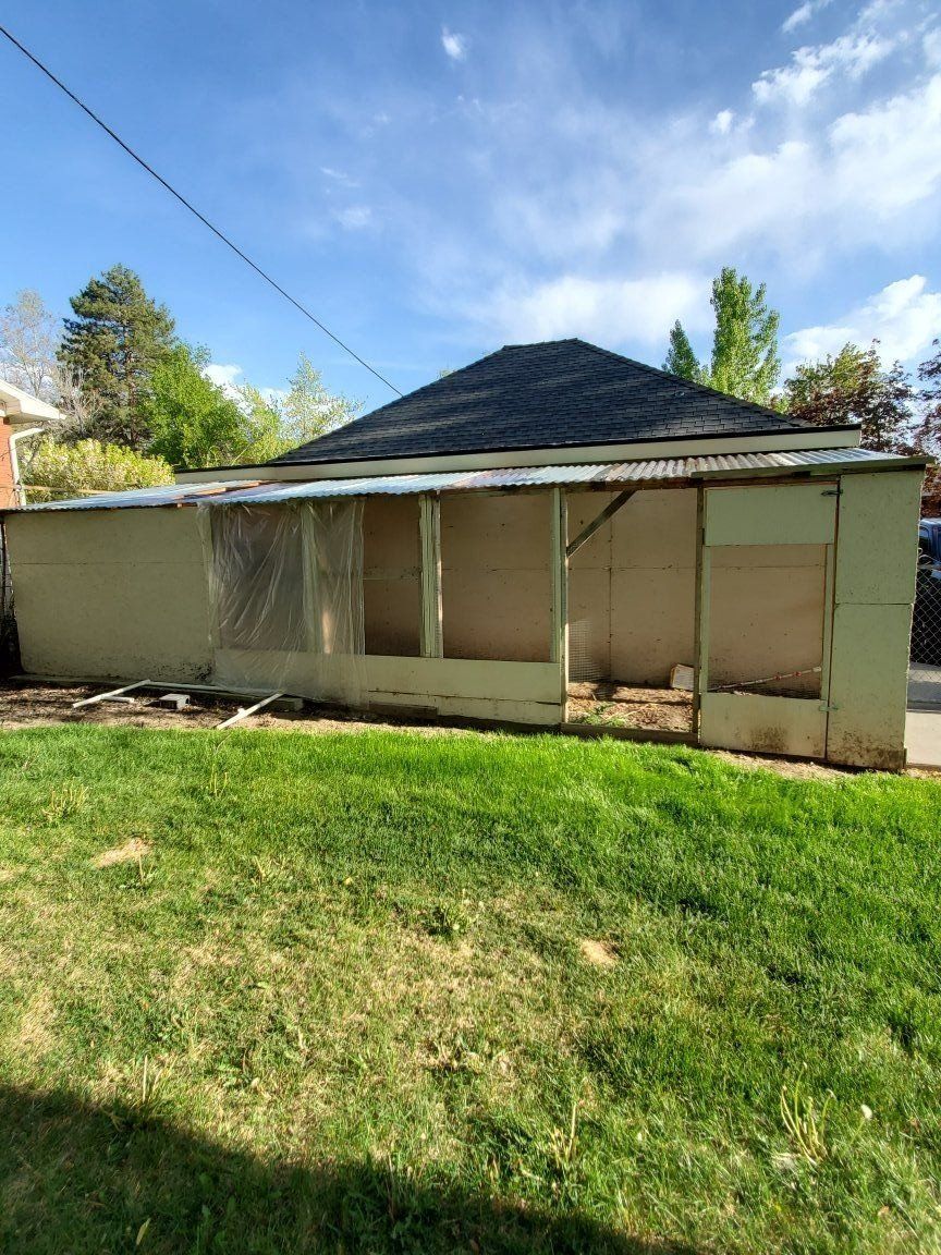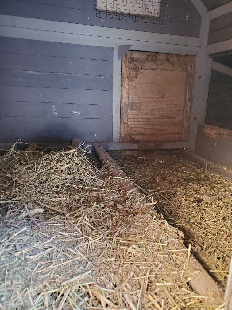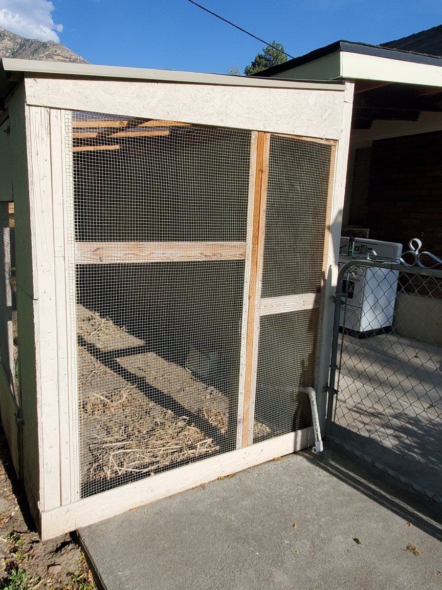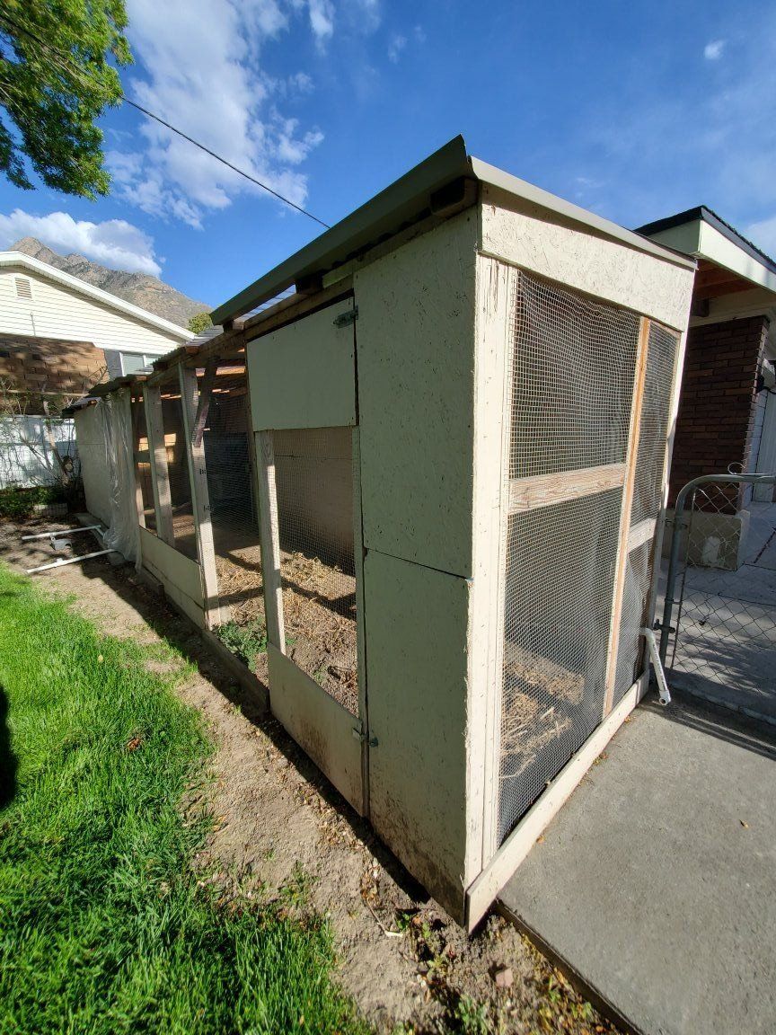 3 wall lean to style chicken run. Coop has 6 nesting boxes, missing 1 caster wheel. Run is approx. 5.5' x 24.5', Height goes from 6' to 7 '. 1 section of clear plastic roof needs replacement. Coop is approx. 5.5' x 3' x 4' high. Disassembly required, it is attached to a carport wall. Cash only.