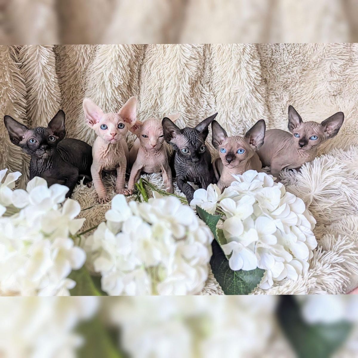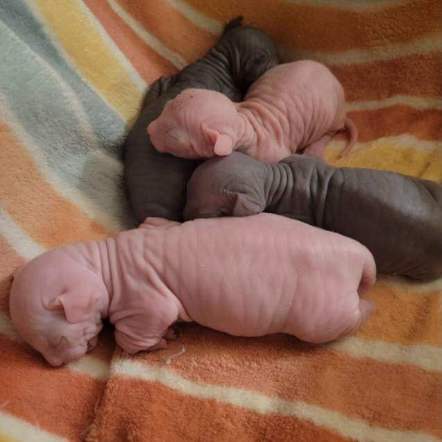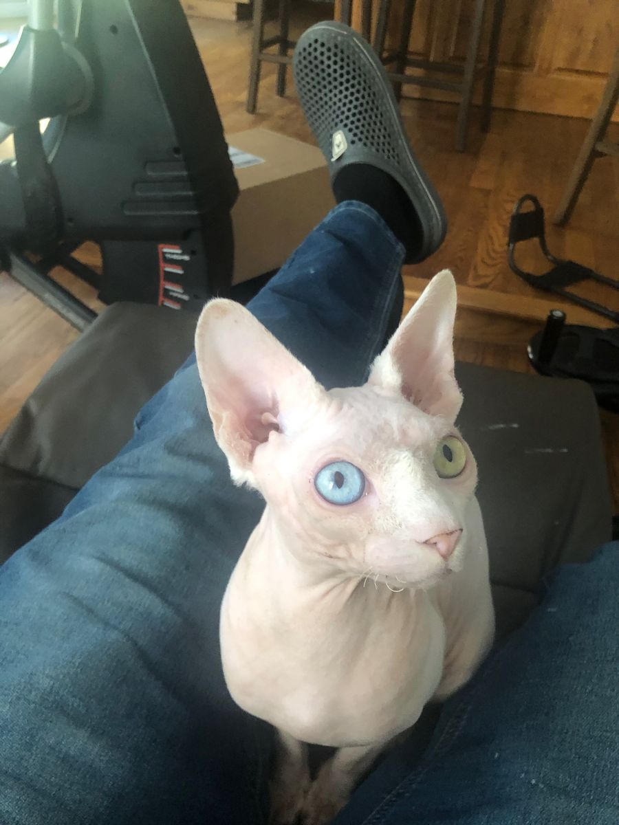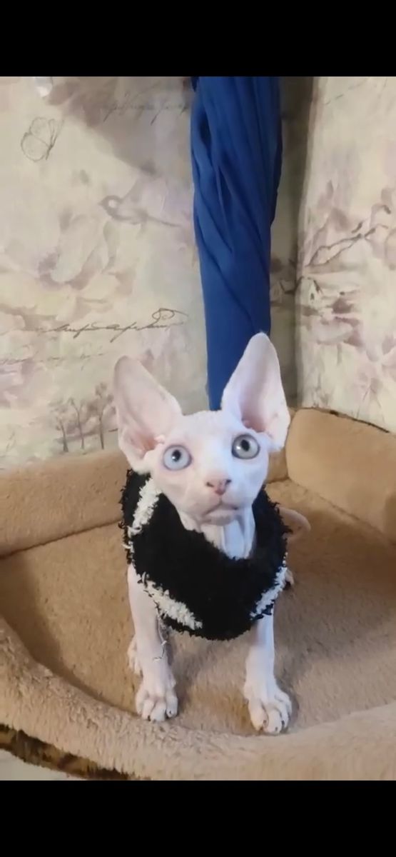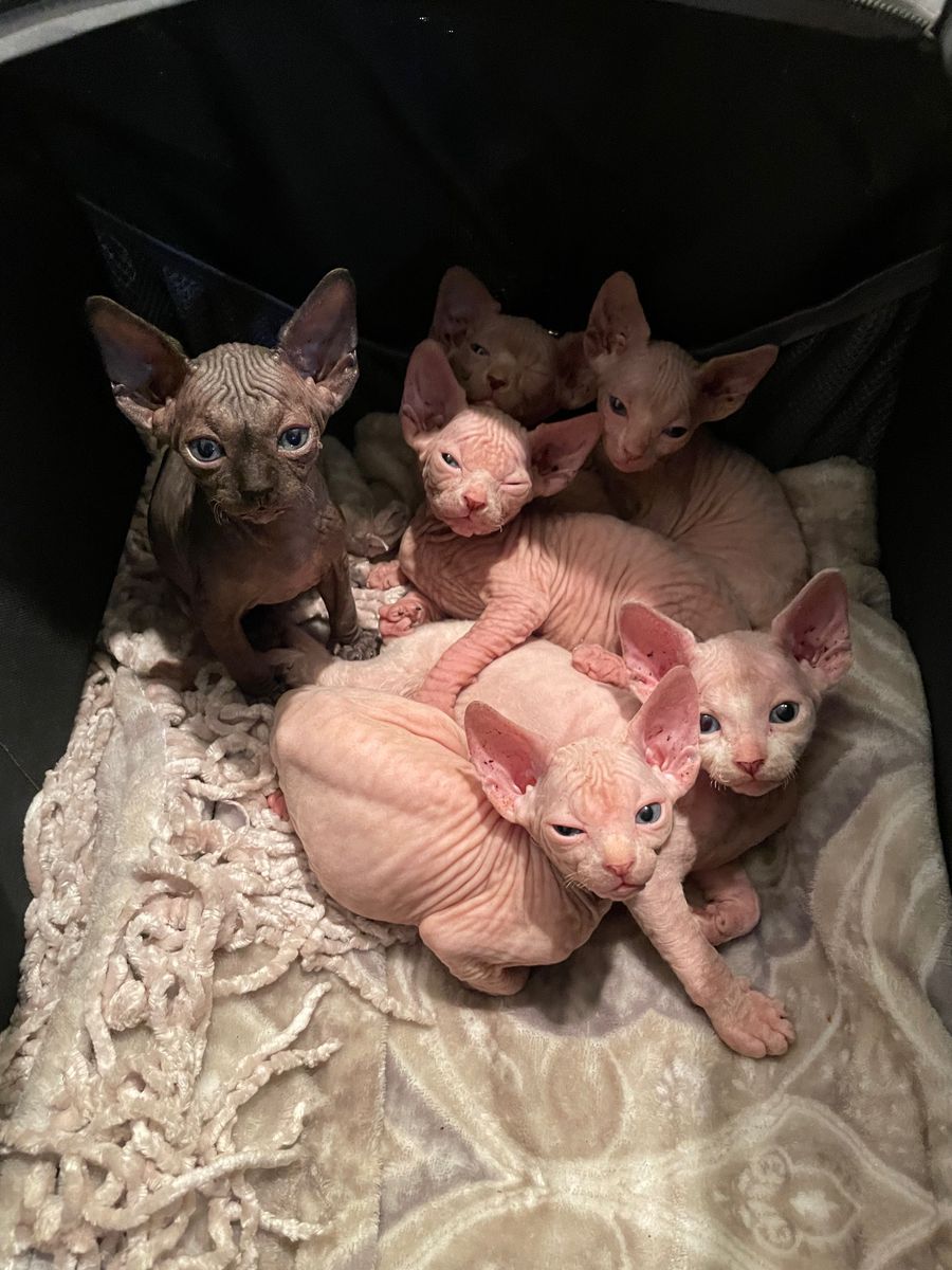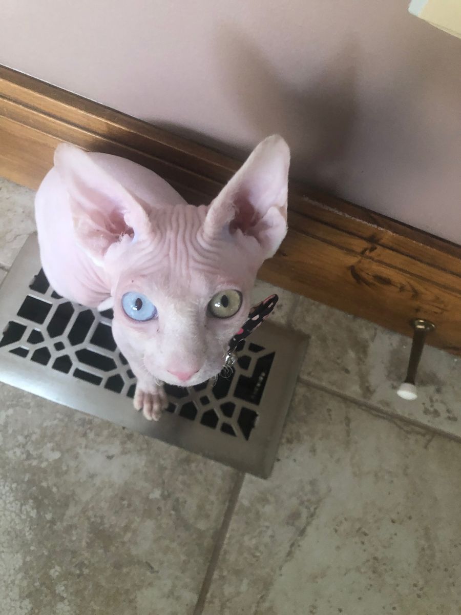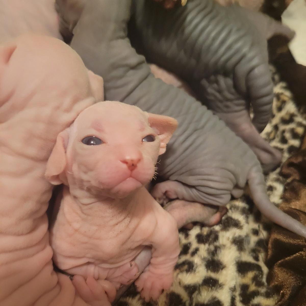 ZelleMeet Mookie...our sweet beautiful Sphynx stud. Originally born in Ukraine to champion bloodlines on 9/18/2020, This gorgeous odd eyed boy has the sweetest disposition of any Sphynx we have ever owned which is saying a lot. He is a total gentleman and is guaranteed to patiently thaw the heart of even the most difficult queen. He has a perfect genetic panel, is HCL negative, and has fathered over 200 kittens with zero know abnormalities and an extremely low mortality rate. His average litter size is 4.5 kittens and his success rate with queens in heat is well over 95% on the first try. If your queen does not get pregnant on her first visit you are welcome to bring her back one more time free of charge. He has also successfully been bred for his temperament with non-sphynx breeds (see picture of his furry half bengal half sphynx son).