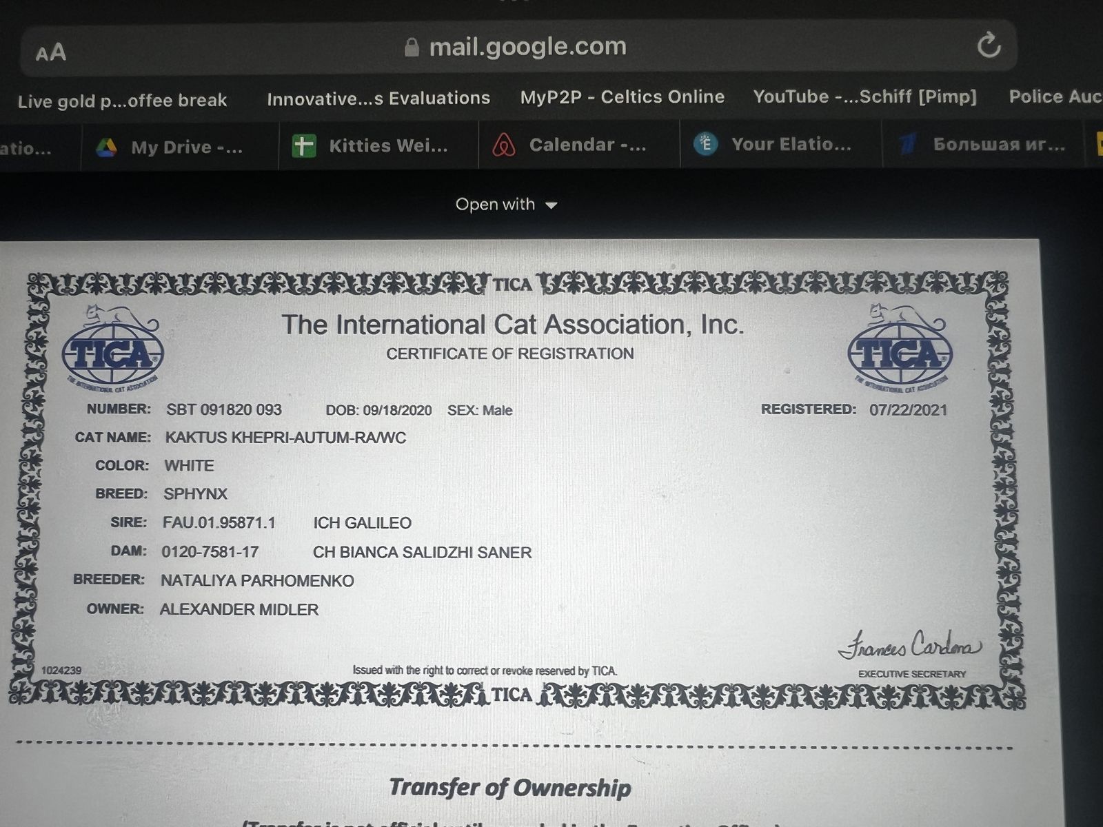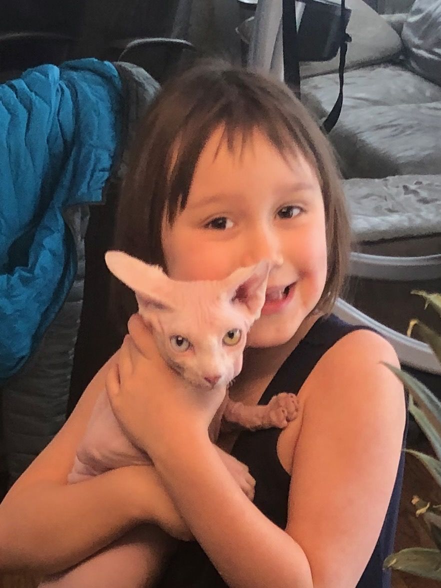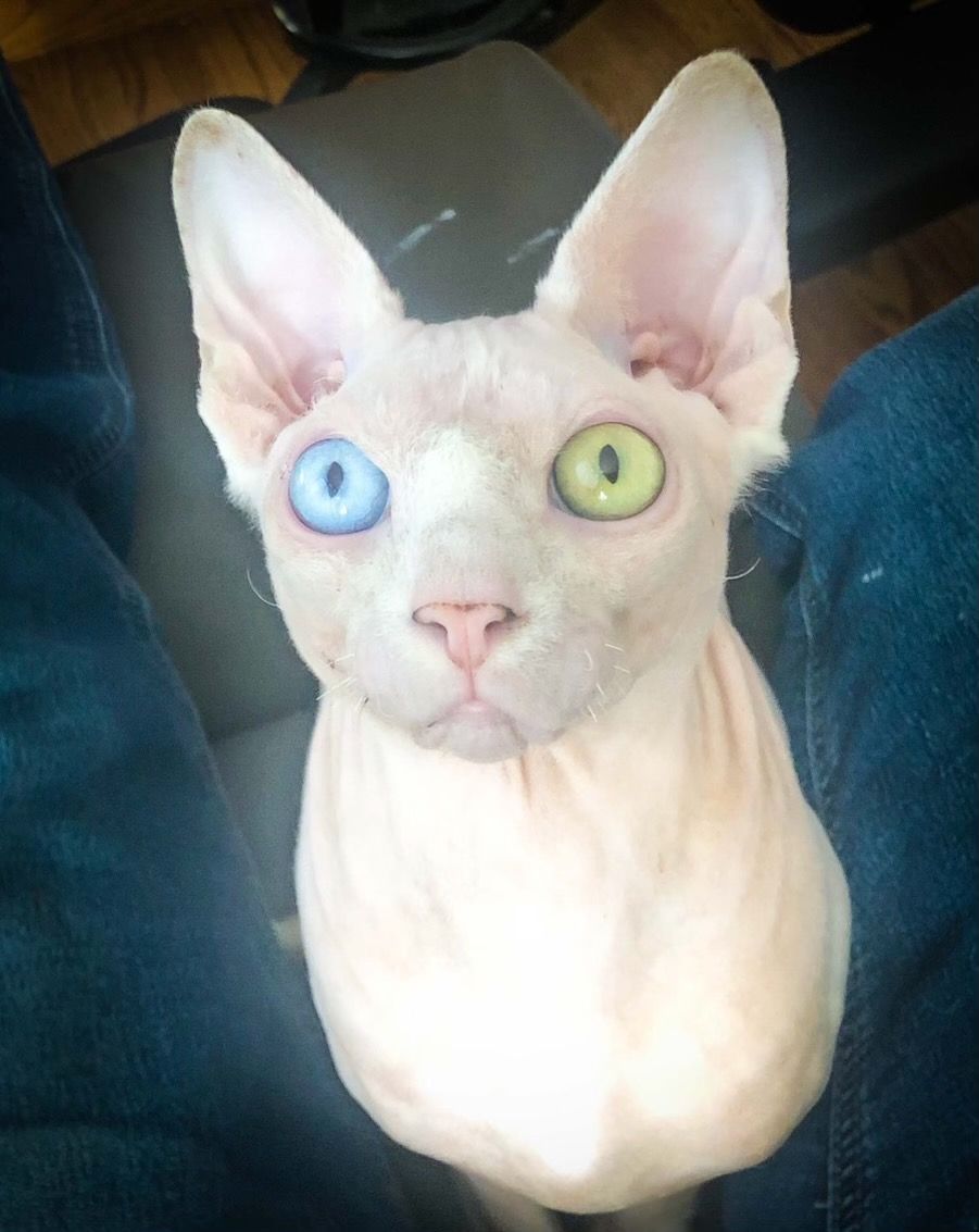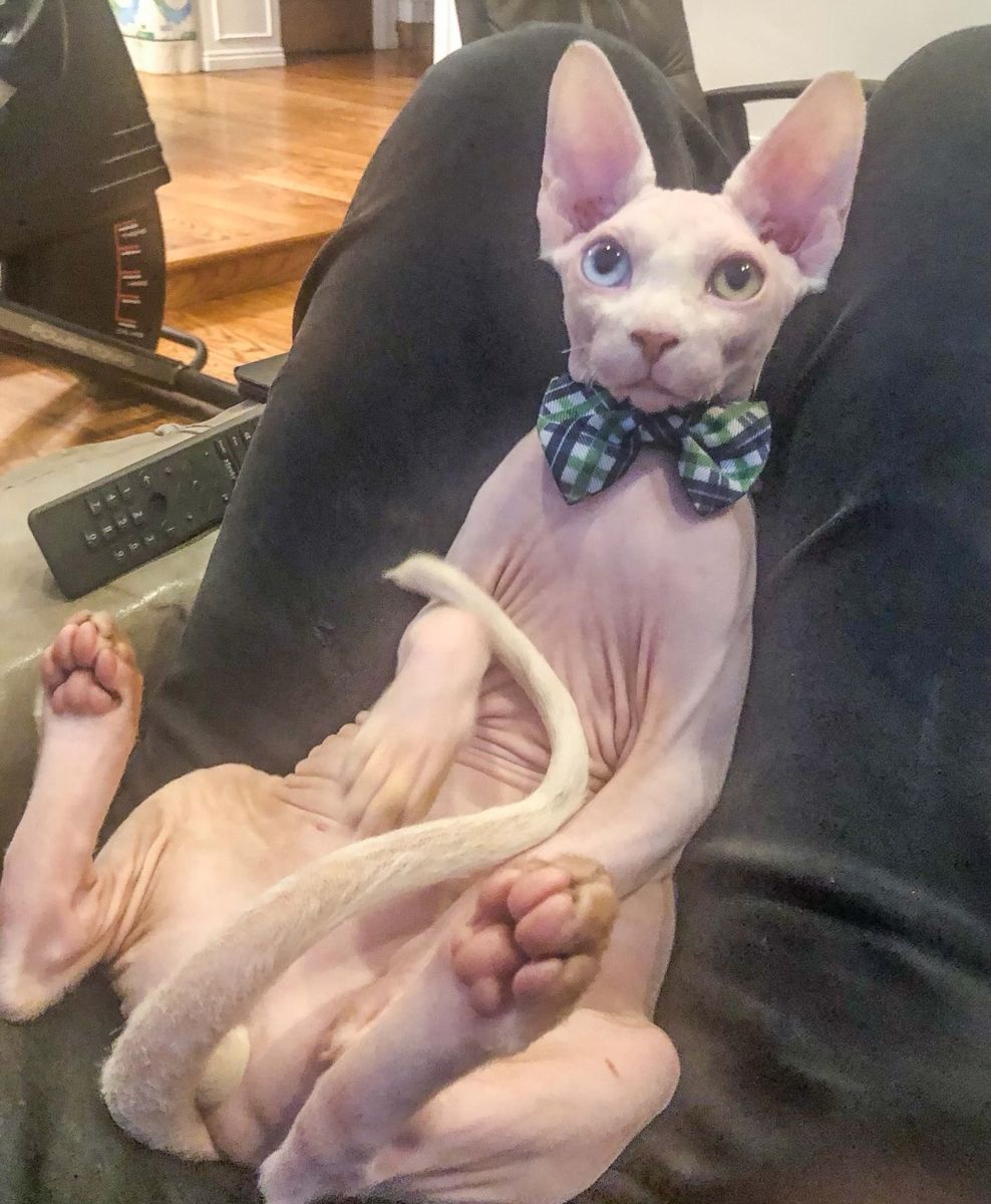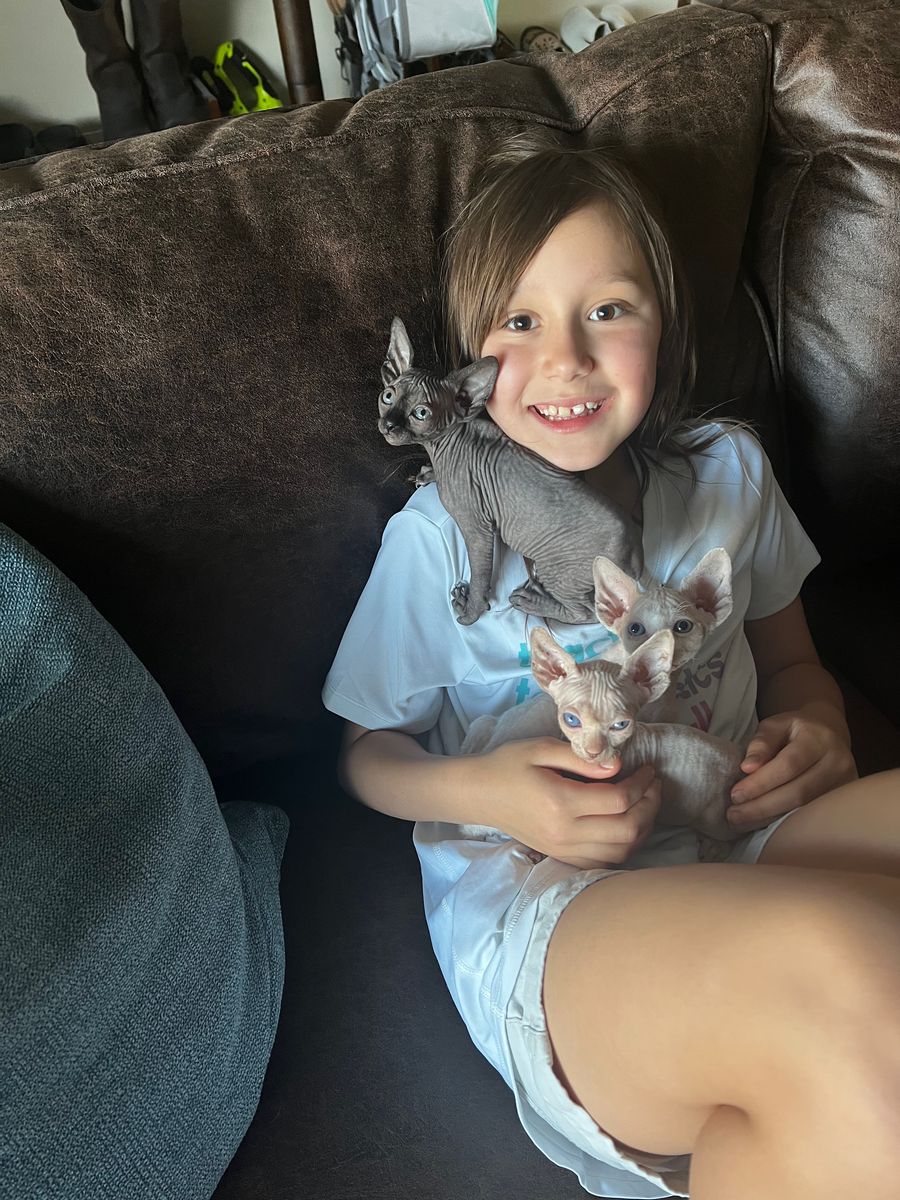 ZelleMeet Mookie...our sweet beautiful Sphynx stud. Originally born in Ukraine to champion bloodlines on 9/18/2020, This gorgeous odd eyed boy has the sweetest disposition of any Sphynx we have ever owned which is saying a lot. He is a total gentleman and is guaranteed to patiently thaw the heart of even the most difficult queen. He has a perfect genetic panel, is HCL negative, and has fathered over 200 kittens with zero know abnormalities and an extremely low mortality rate. His average litter size is 4.5 kittens and his success rate with queens in heat is well over 95% on the first try. If your queen does not get pregnant on her first visit you are welcome to bring her back one more time free of charge. He has also successfully been bred for his temperament with non-sphynx breeds (see picture of his furry half bengal half sphynx son).