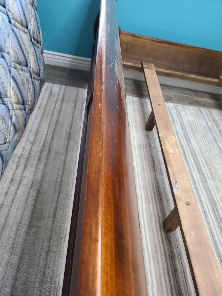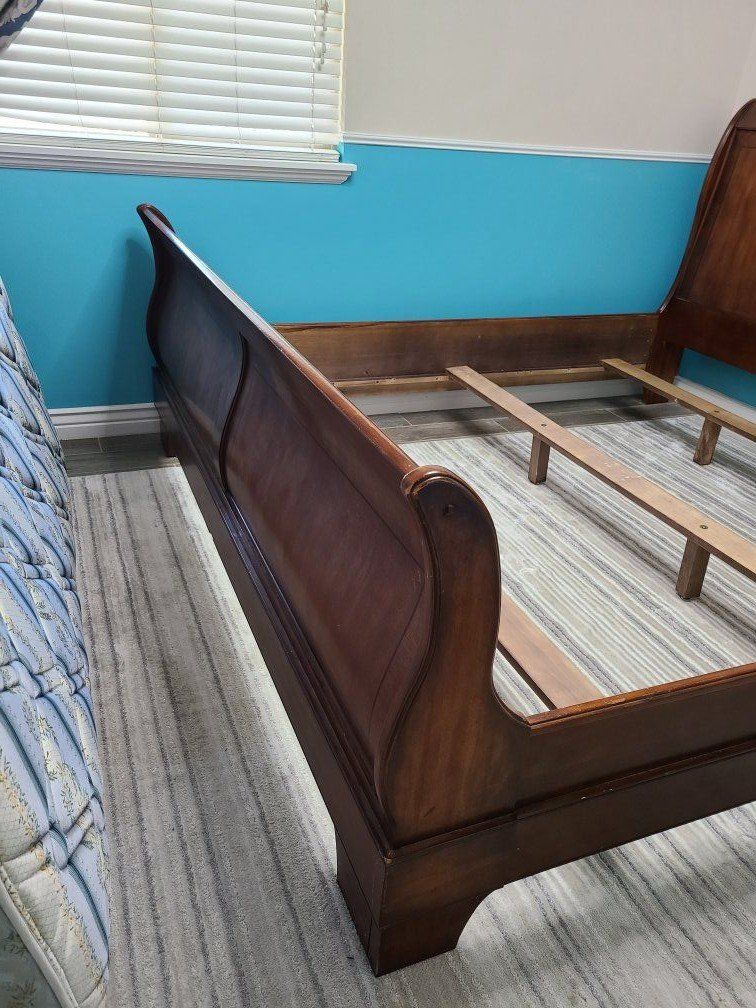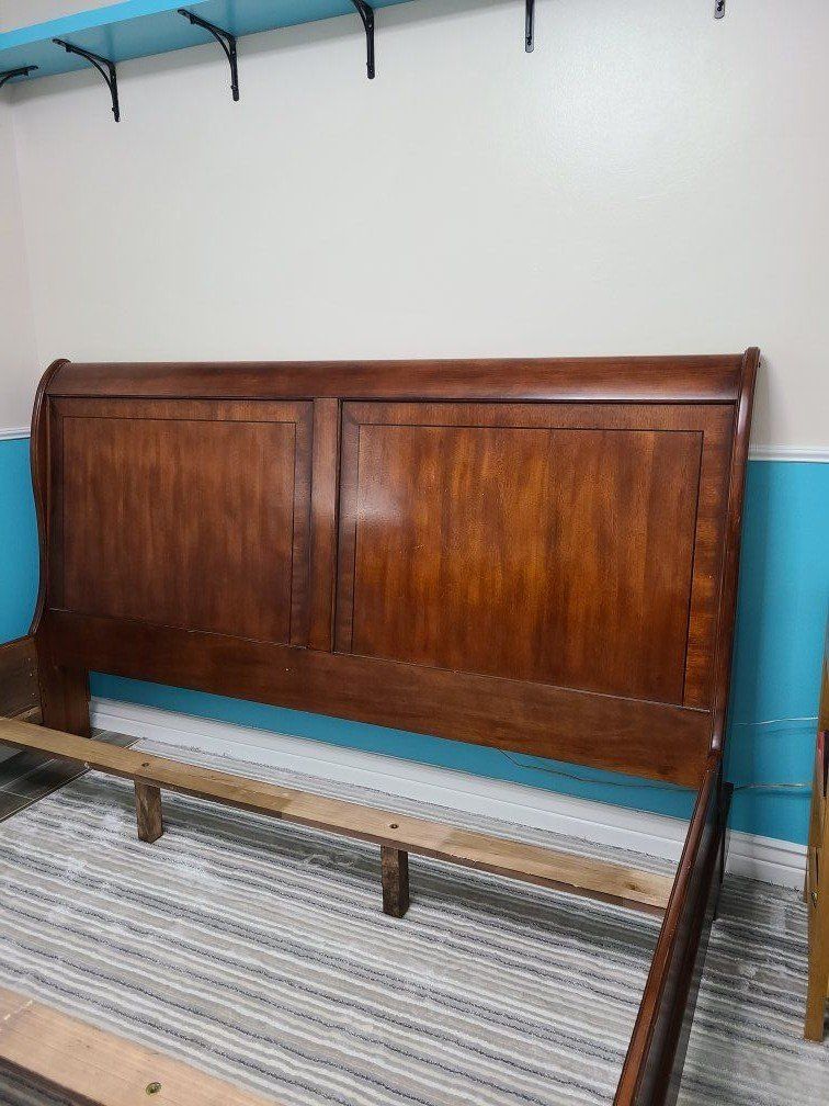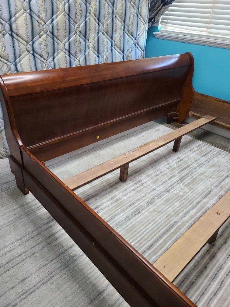 VenmoWe are selling a sold wood king size bed frame for mattress 76"x80". It is a beautiful sleigh bed with a reddish wood in good condition. It does not fit our room so we need it gone. $250 OBO. Frame only.