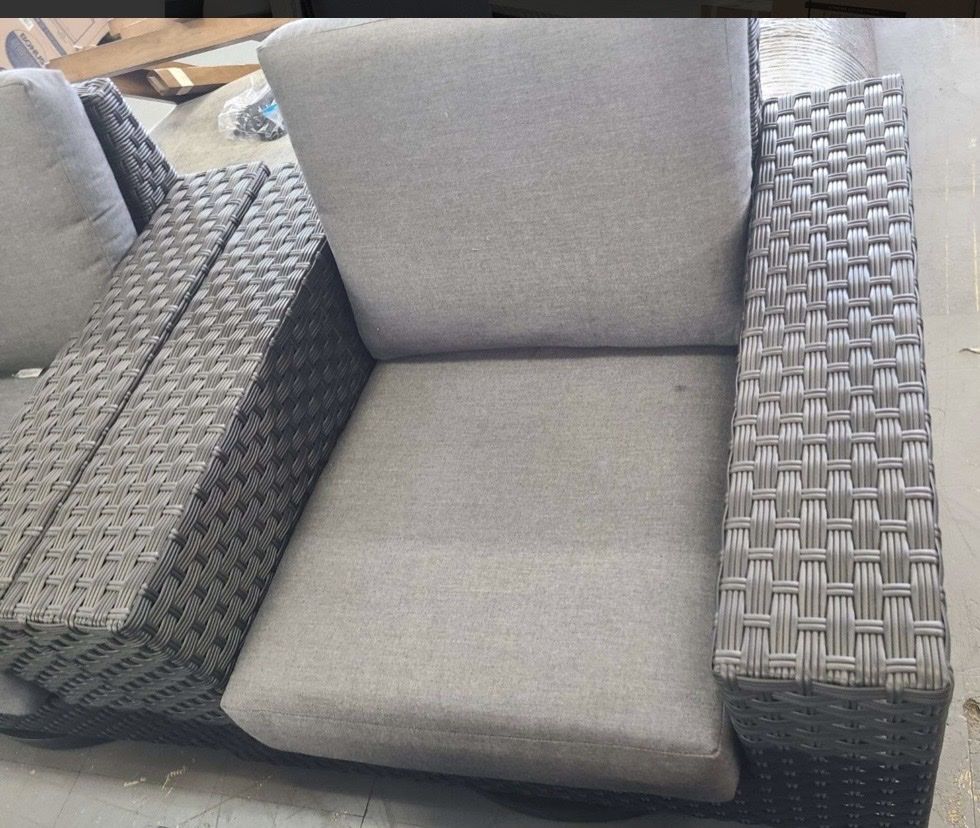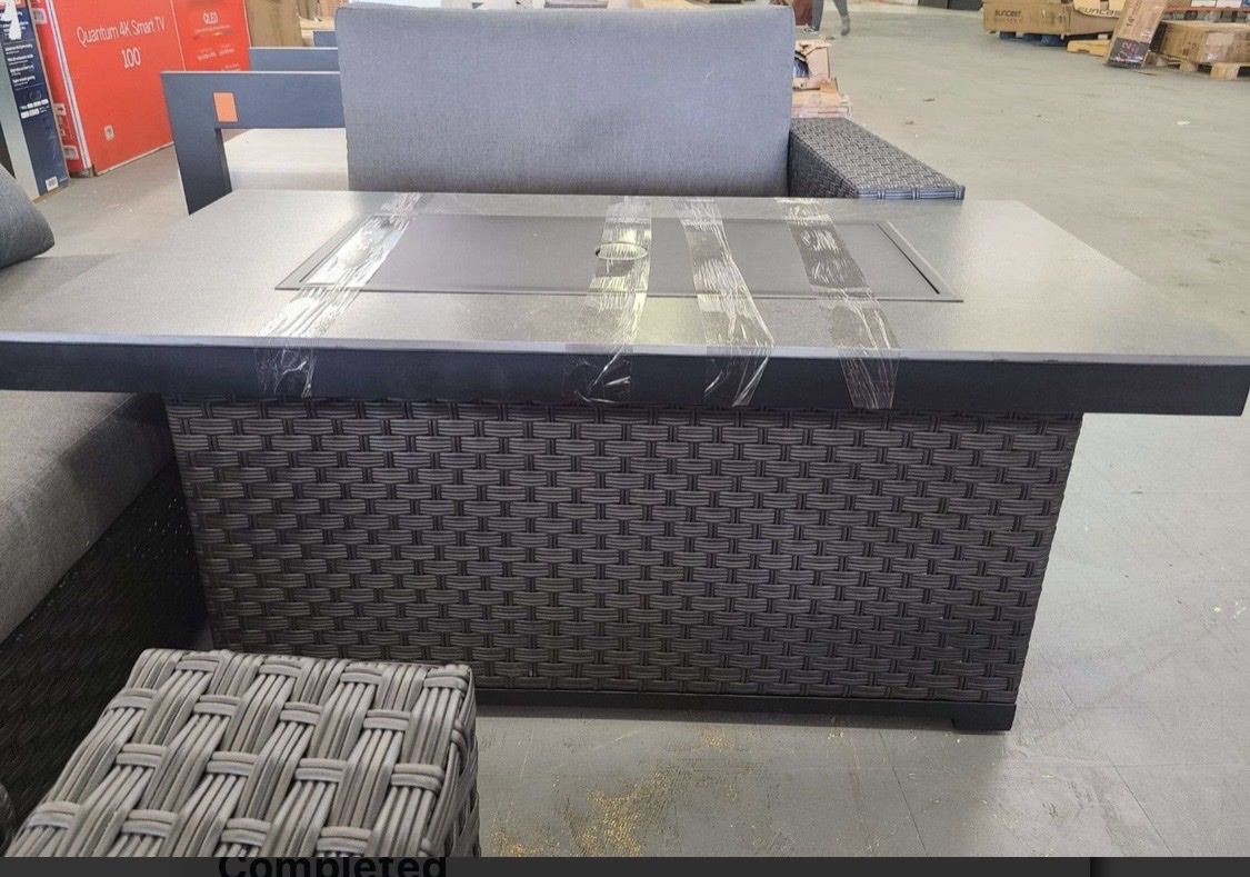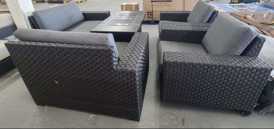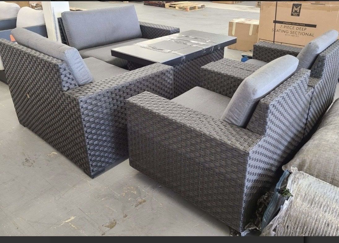 VenmoToday’s special Members Mark Olympus Collection outdoor fire pit dining set, store return like new in excellent condition. The set has a comfy dark gray wicker sofa with gray cushions, there are 2 swivel dark gray wicker chairs with gray cushions and fire pit table. The fire pit has fire rocks and cover. The set is great for the backyard or patio. The set is still in the original boxes and packaging. Will deliver for an additional fee.