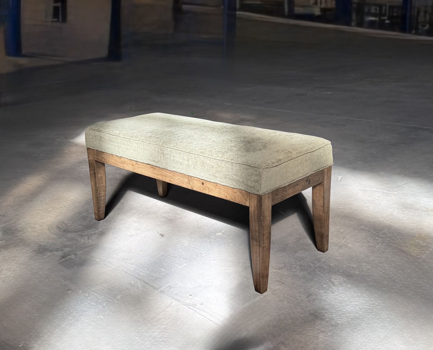 New upholstered midcentury modern wooden bench, fully reupholstered and handcrafted by me.