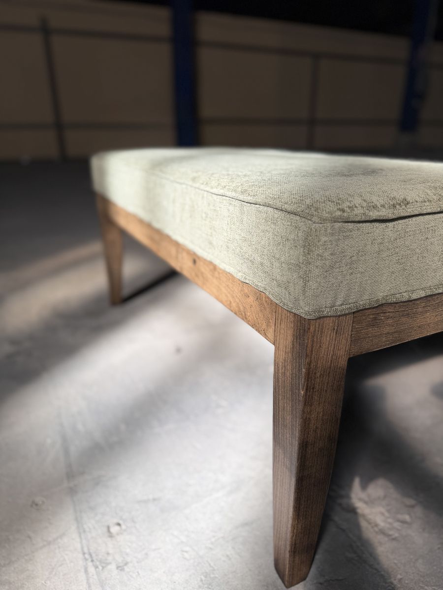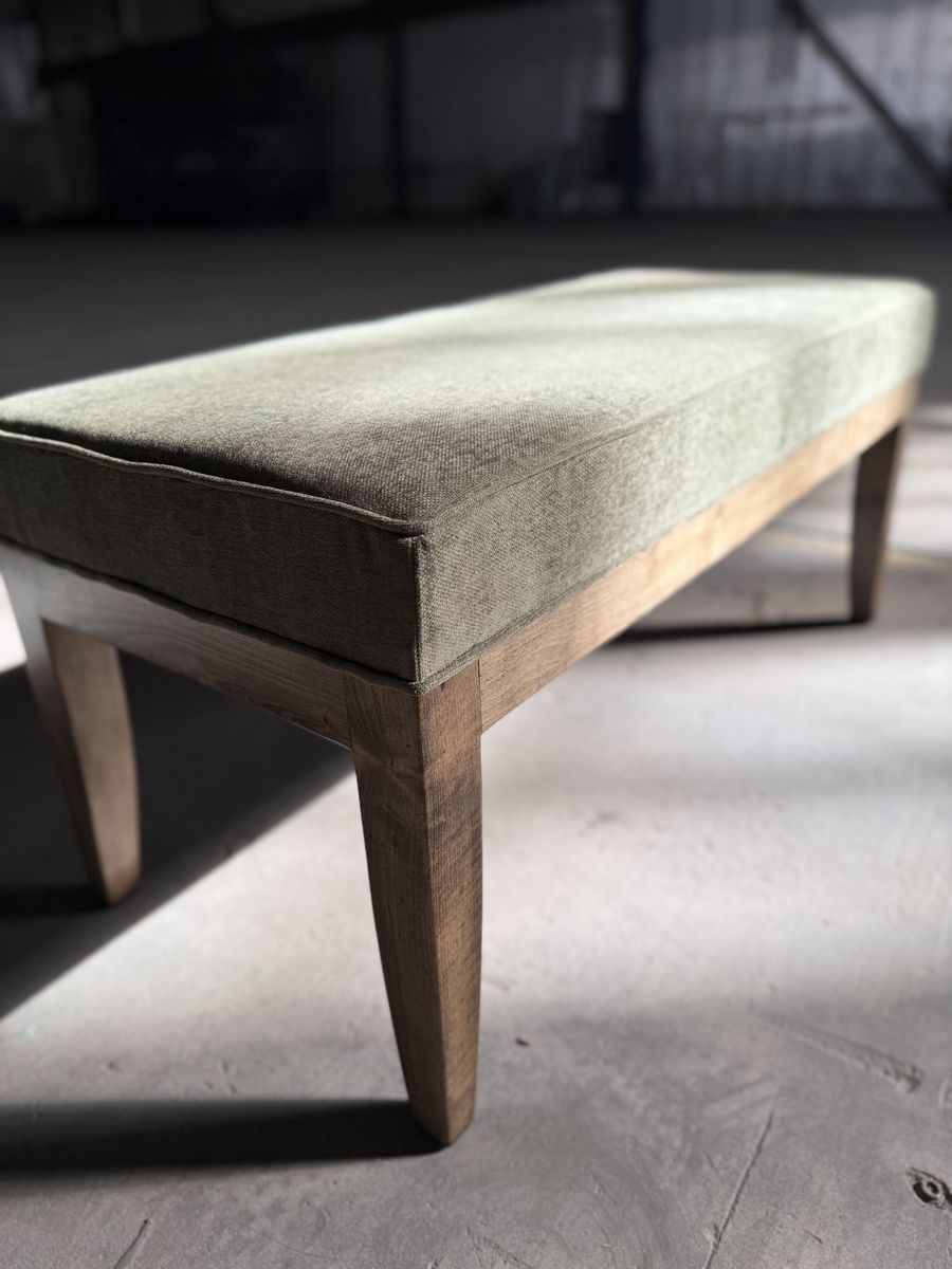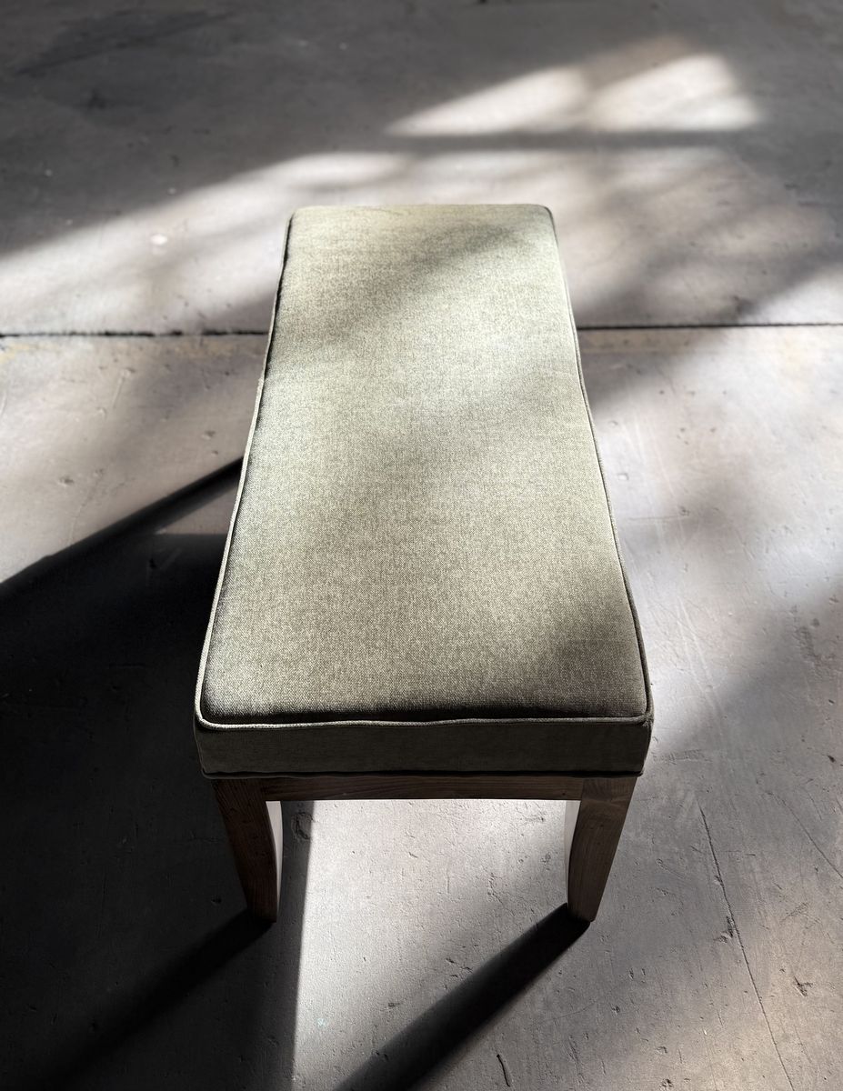 This bench features brand new high-density 4” foam, a rich dark sage green color soft touch fabric for a fresh, comfortable feel. The wooden legs have been sanded down to remove the old paint and dents. I added new walnut stain and sealed it in with a protective polyurethane finish, giving the piece a warm tone while protecting it for everyday use.