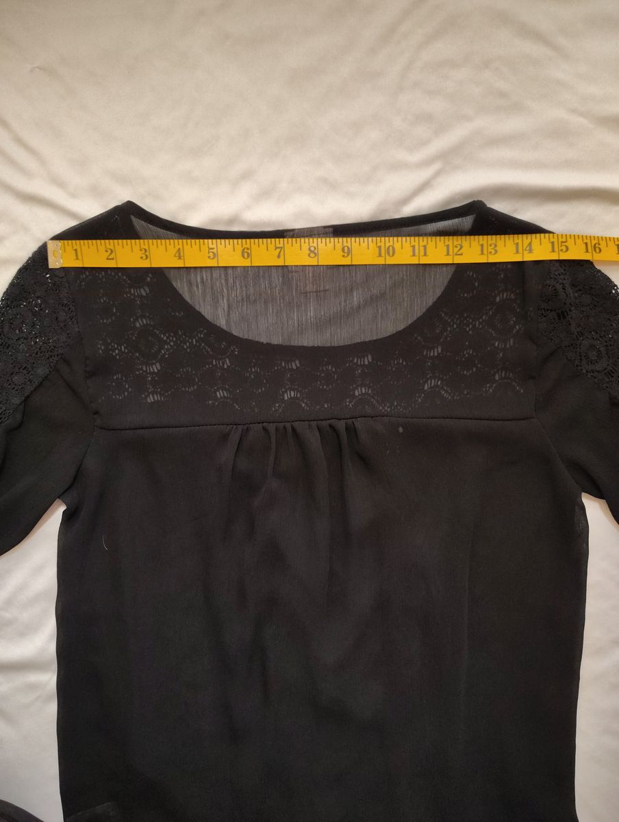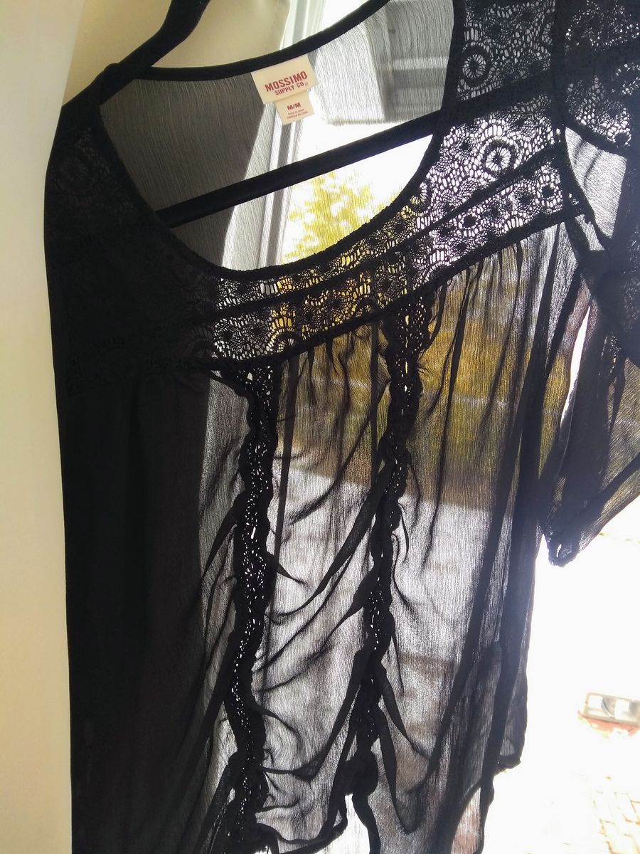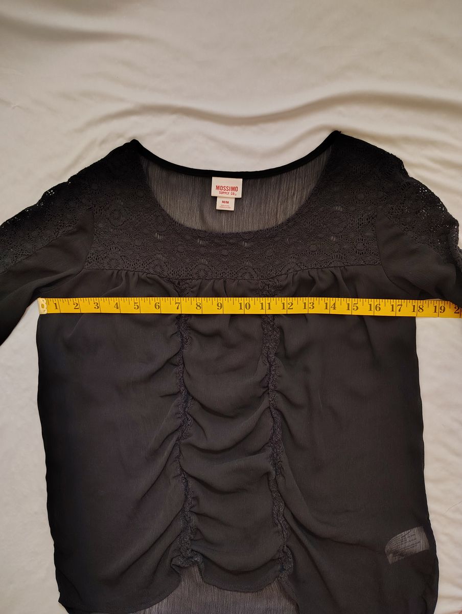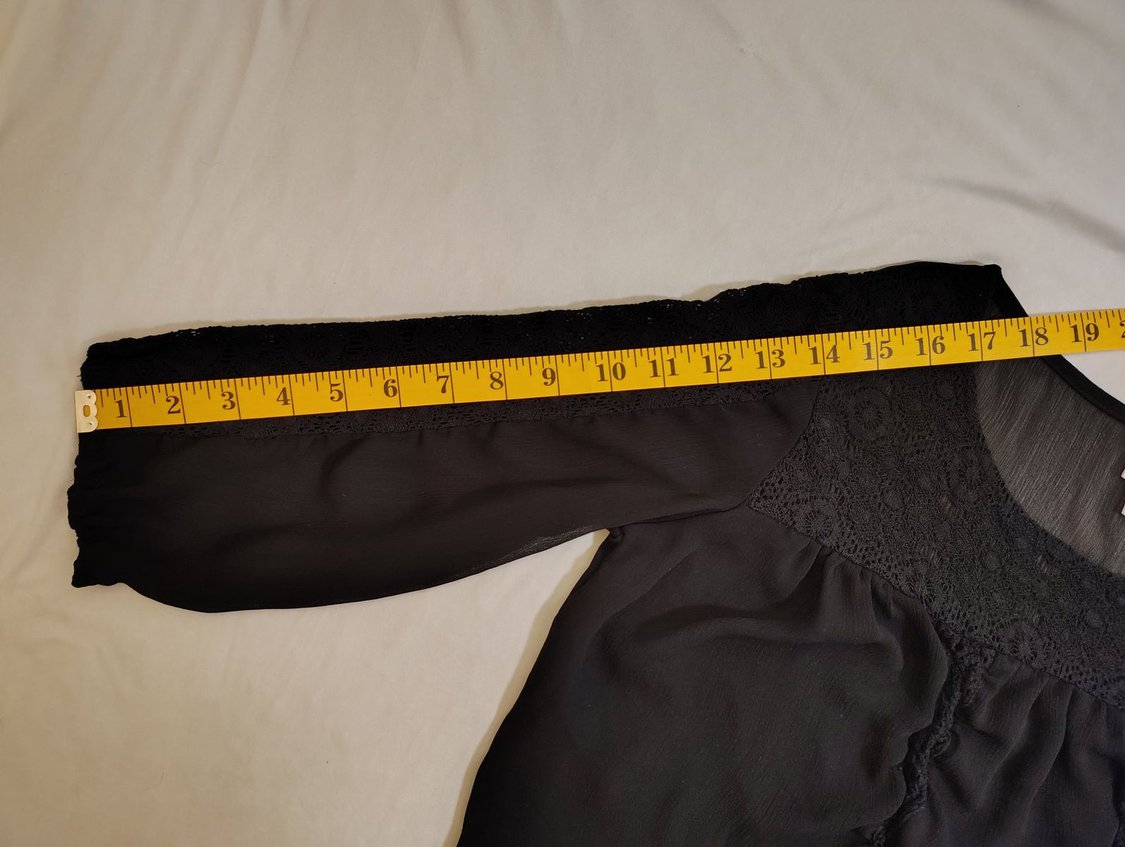PayPalBeautiful black sheer blouse with delicate lace detailing across the shoulders and sleeves. Features a flowy, lightweight design with subtle ruching in the front for added shape and style.