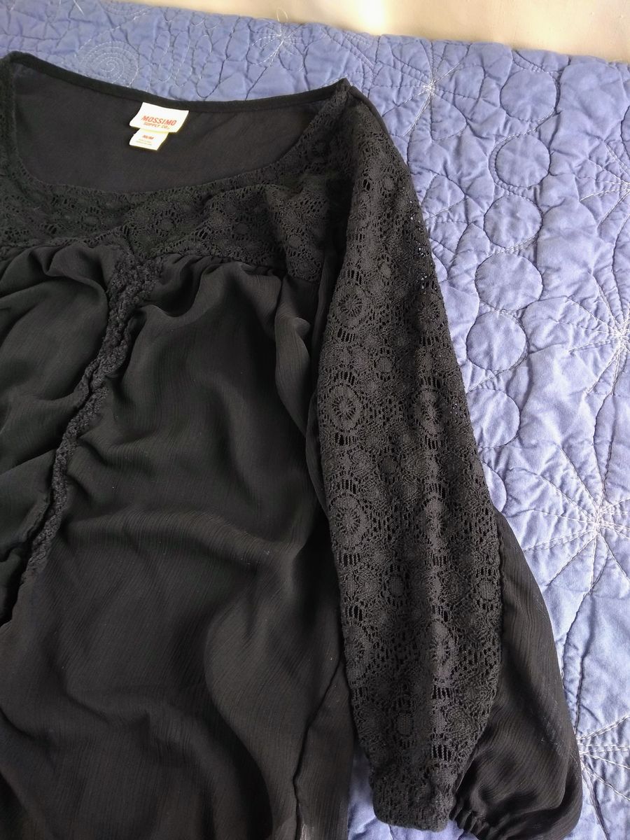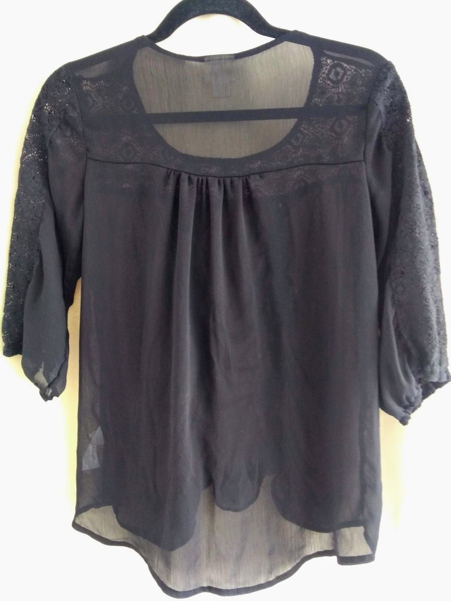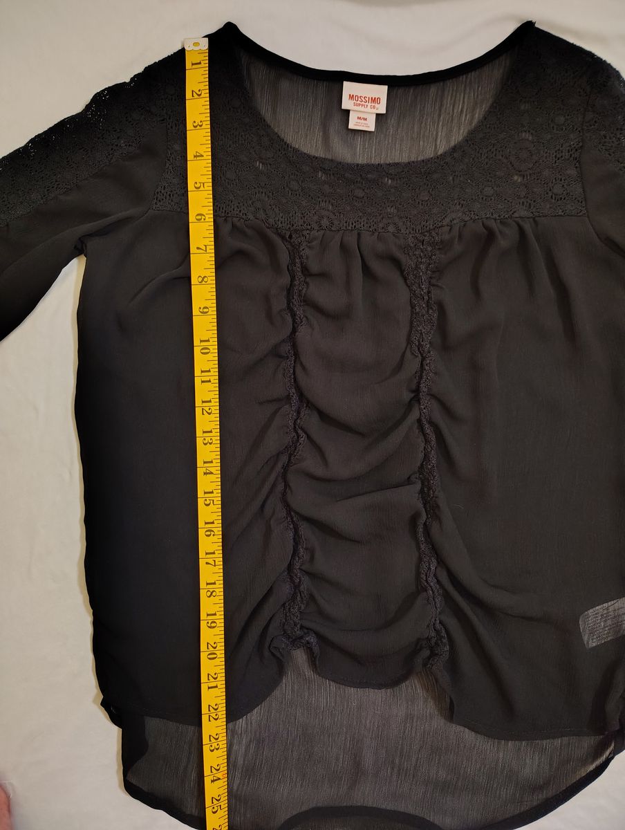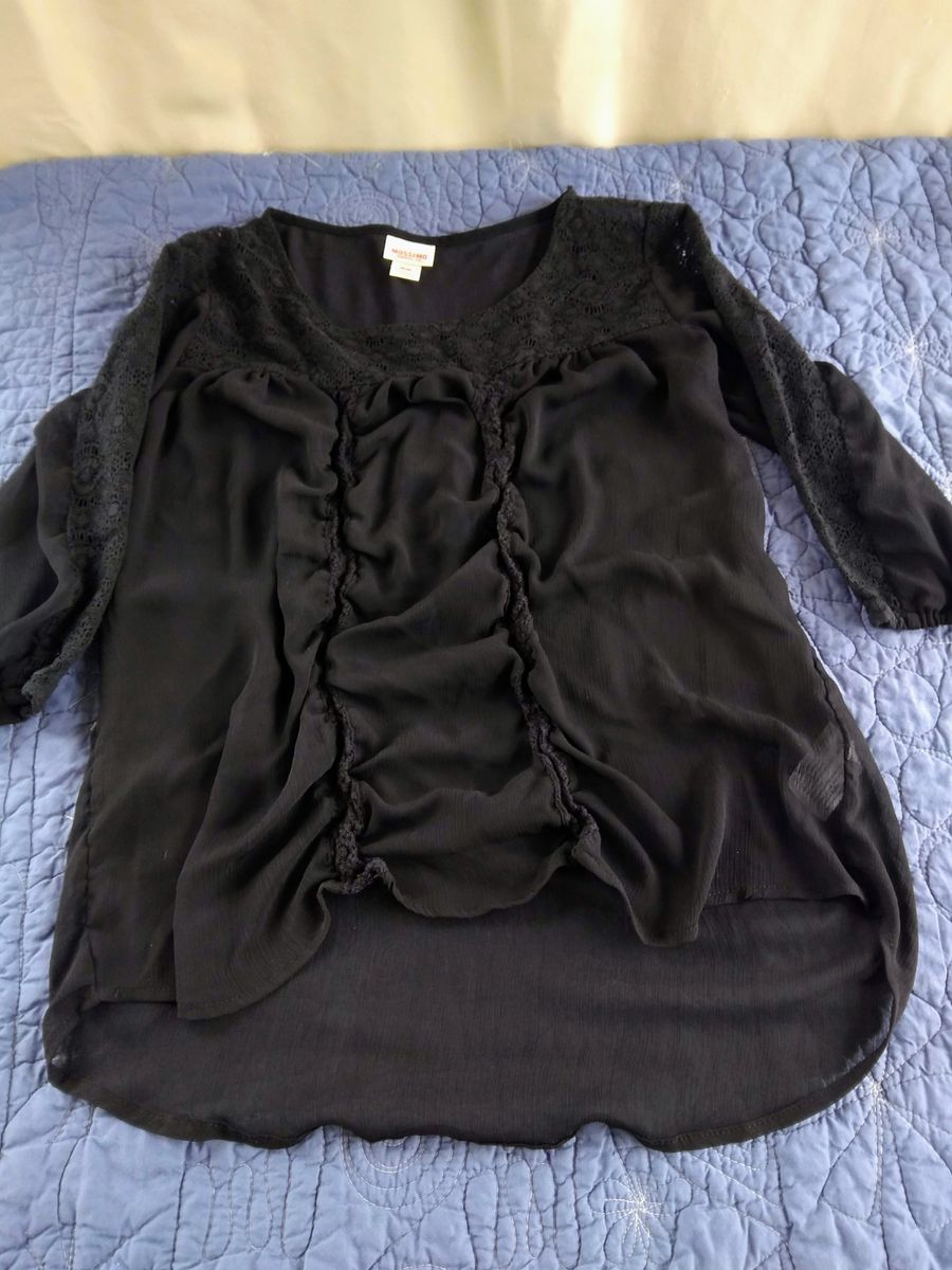 PayPalBeautiful black sheer blouse with delicate lace detailing across the shoulders and sleeves. Features a flowy, lightweight design with subtle ruching in the front for added shape and style.