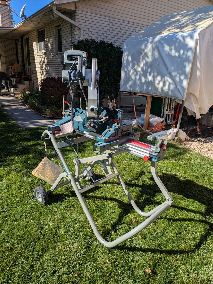 VenmoHigh-quality Bosch sliding compound miter saw with rolling Gravity-Rise stand in excellent working condition. This is a professional-grade setup that’s perfect for woodworking, trim work, framing, and DIY projects.