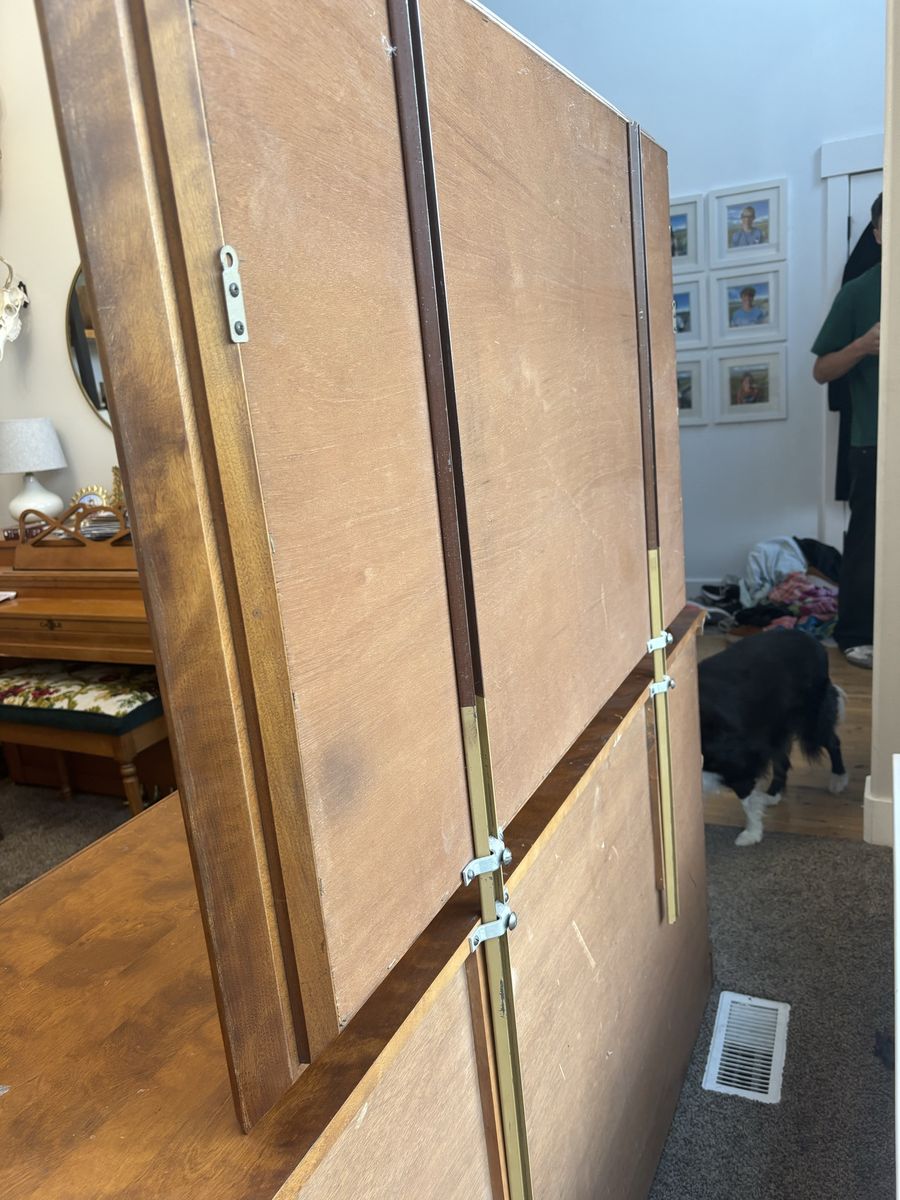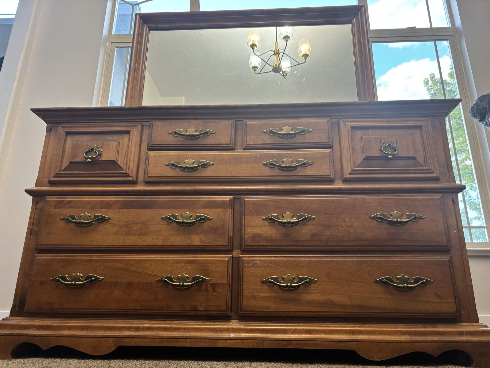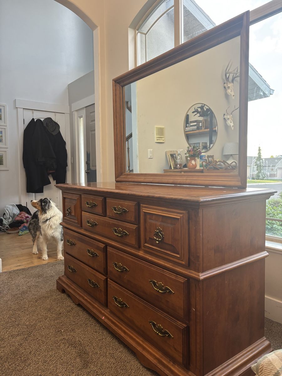 ApplePaySolid wood dresser with 9 draws of various sizes. The dresser is 60 inches wide, 33 inches tall and 20 inches deep. The mirror is 49 inches wide and 33 inches tall. The mirror easily detaches from the dresser. Overall condition is good with a few minor scratches and blemishes. The draws are solid wood, no MDF or plywood.