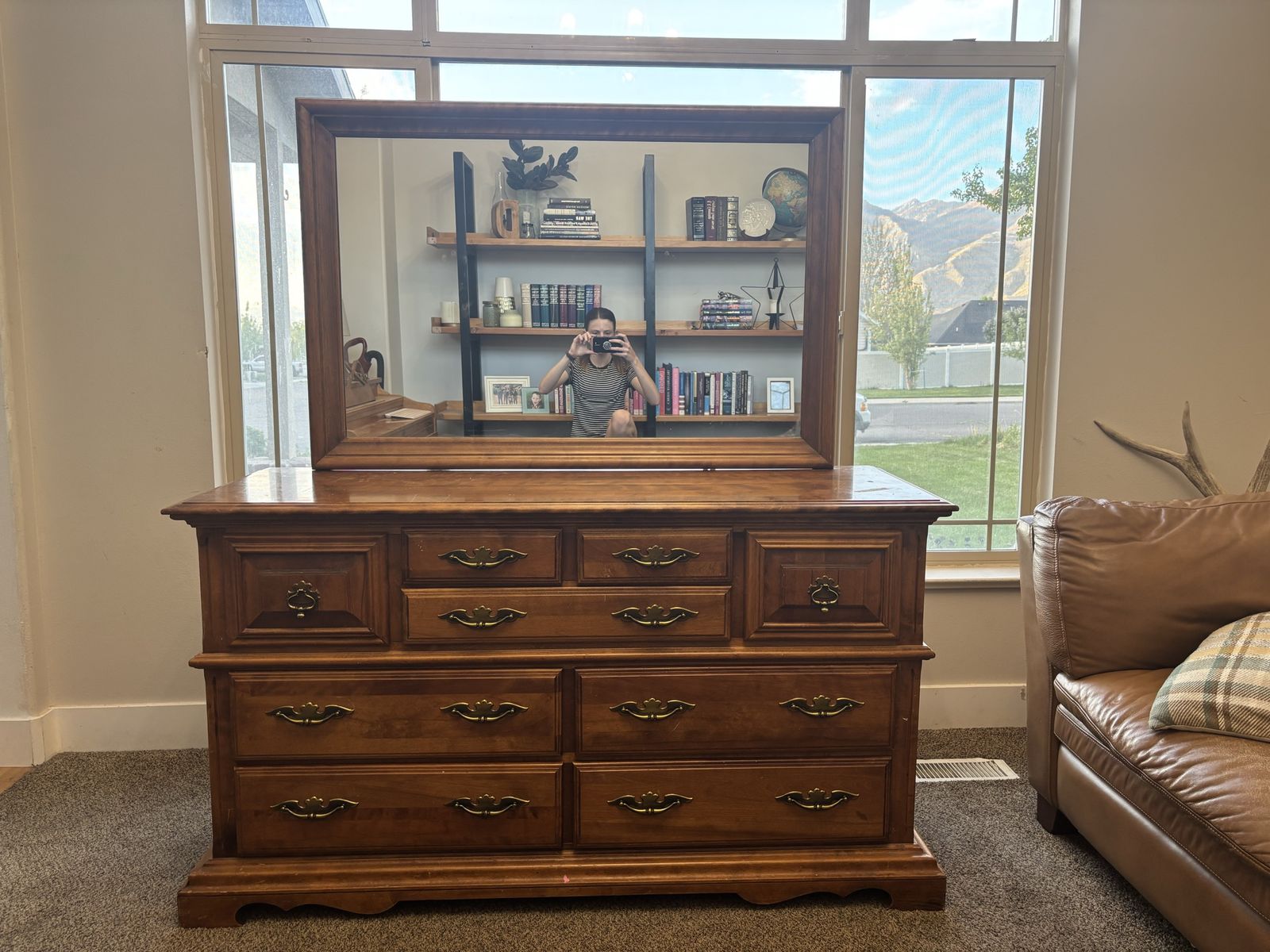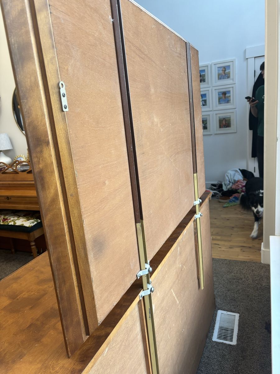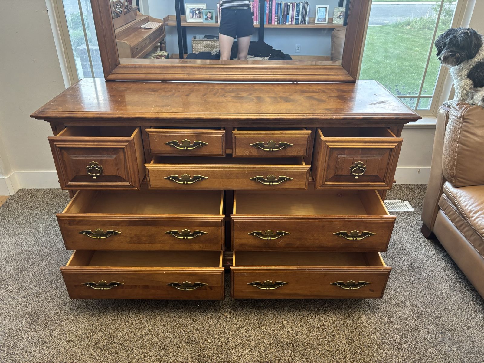 ApplePaySolid wood dresser with 9 draws of various sizes. The dresser is 60 inches wide, 33 inches tall and 20 inches deep. The mirror is 49 inches wide and 33 inches tall. The mirror easily detaches from the dresser. Overall condition is good with a few minor scratches and blemishes. The draws are solid wood, no MDF or plywood.