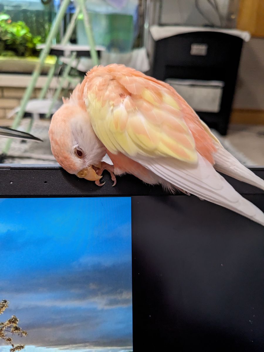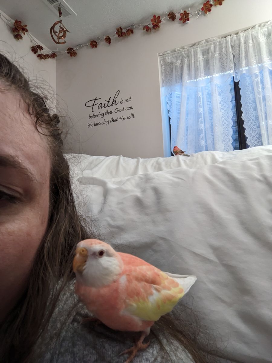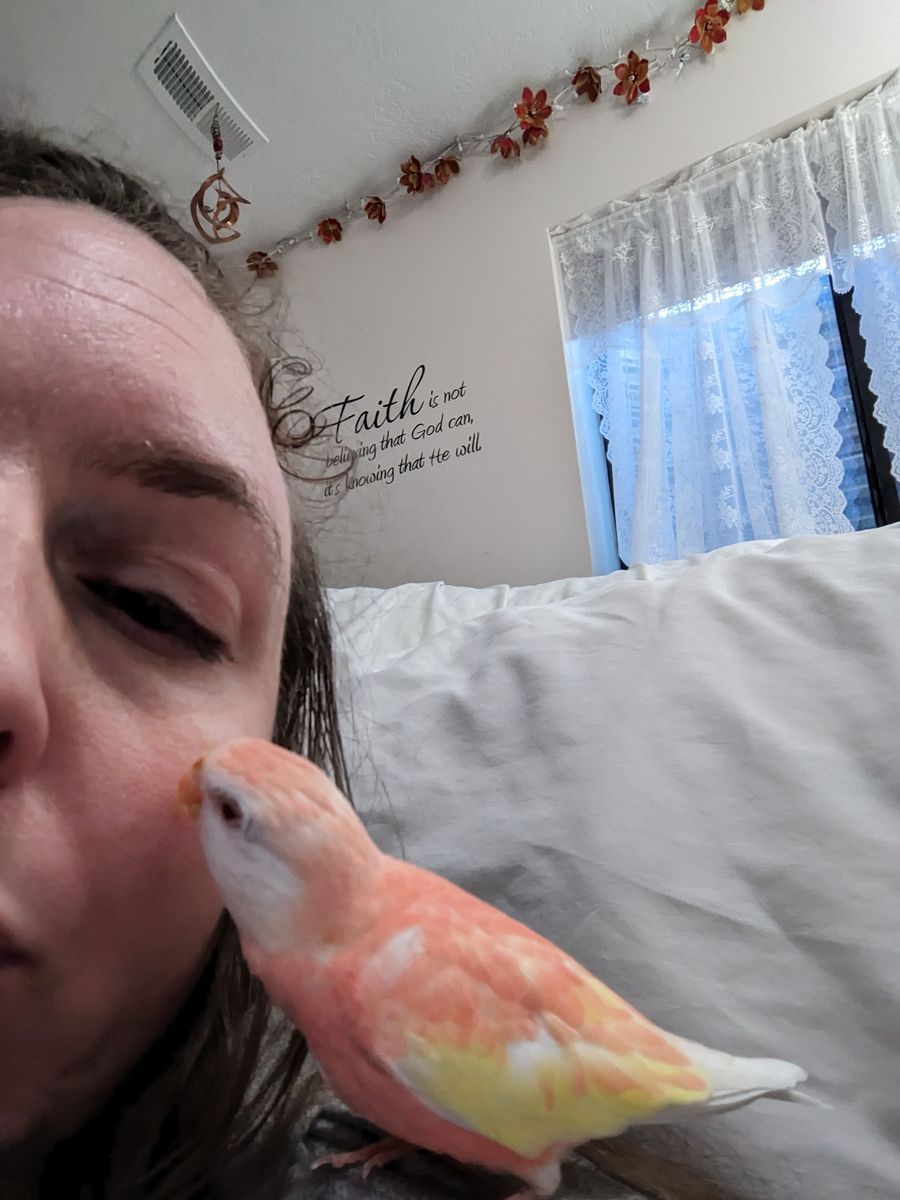 She can step up when in the mood(not anxious) and asks for cuddles and kisses once a month(yes, she does cuddle and kiss when in your hand).