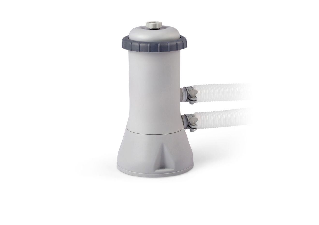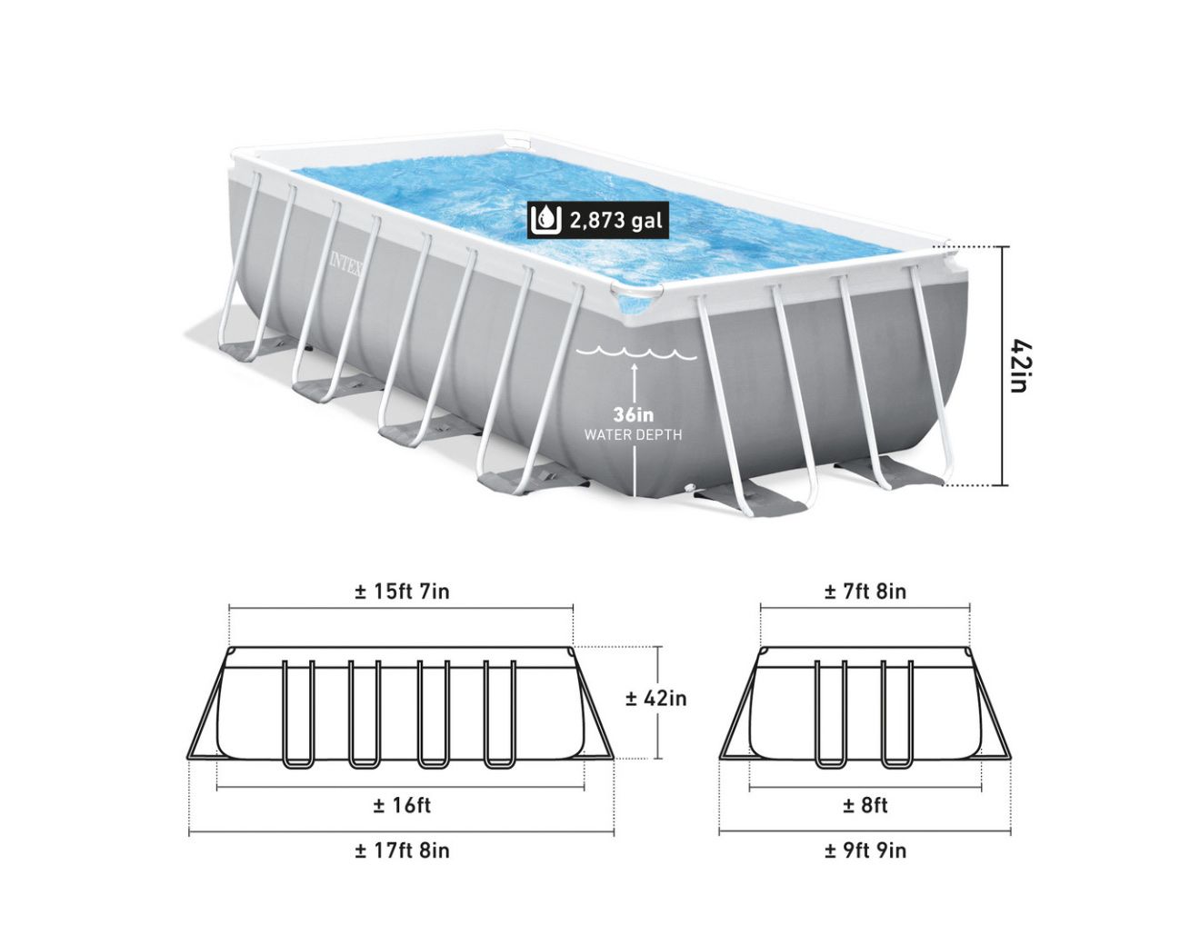 Specifications • Dimensions: 16 ft. (L) × 8 ft. (W) × 42 in. (H) • Water Capacity: 2,873 gallons (90% full) • Includes: • Krystal Clear™ cartridge filter pump • Ground cloth • Pool cover • Ladder for easy access • Durable Prism Frame design with reinforced sidewalls and sturdy construction • Easy to assemble and disassemble for off-season storage