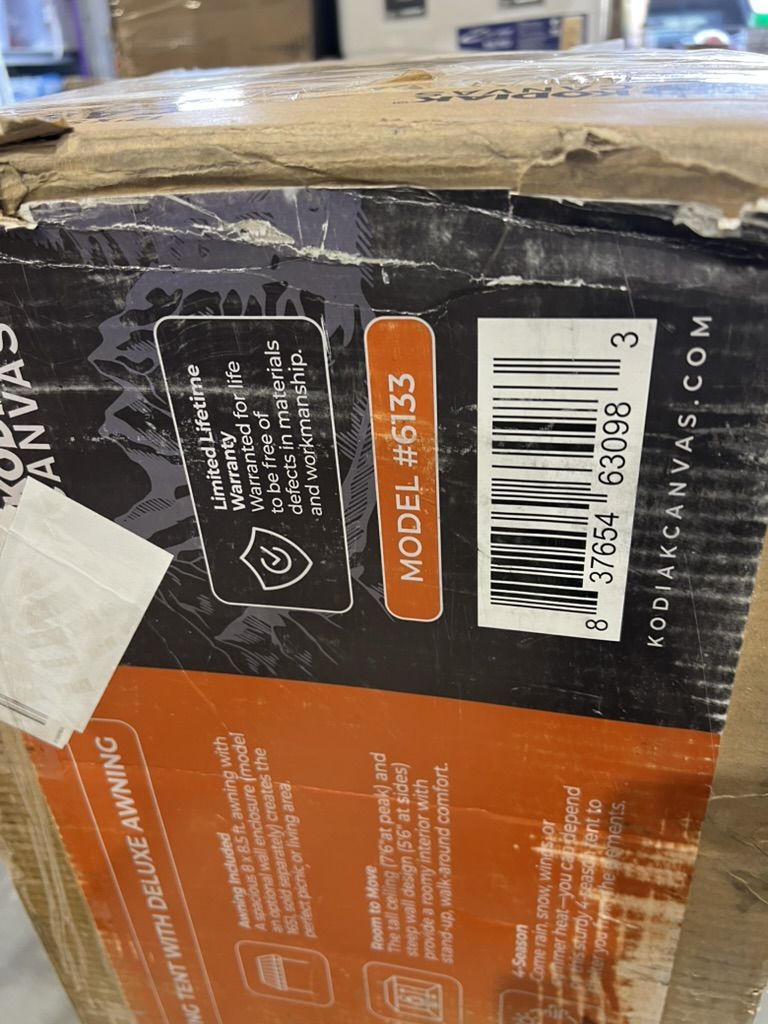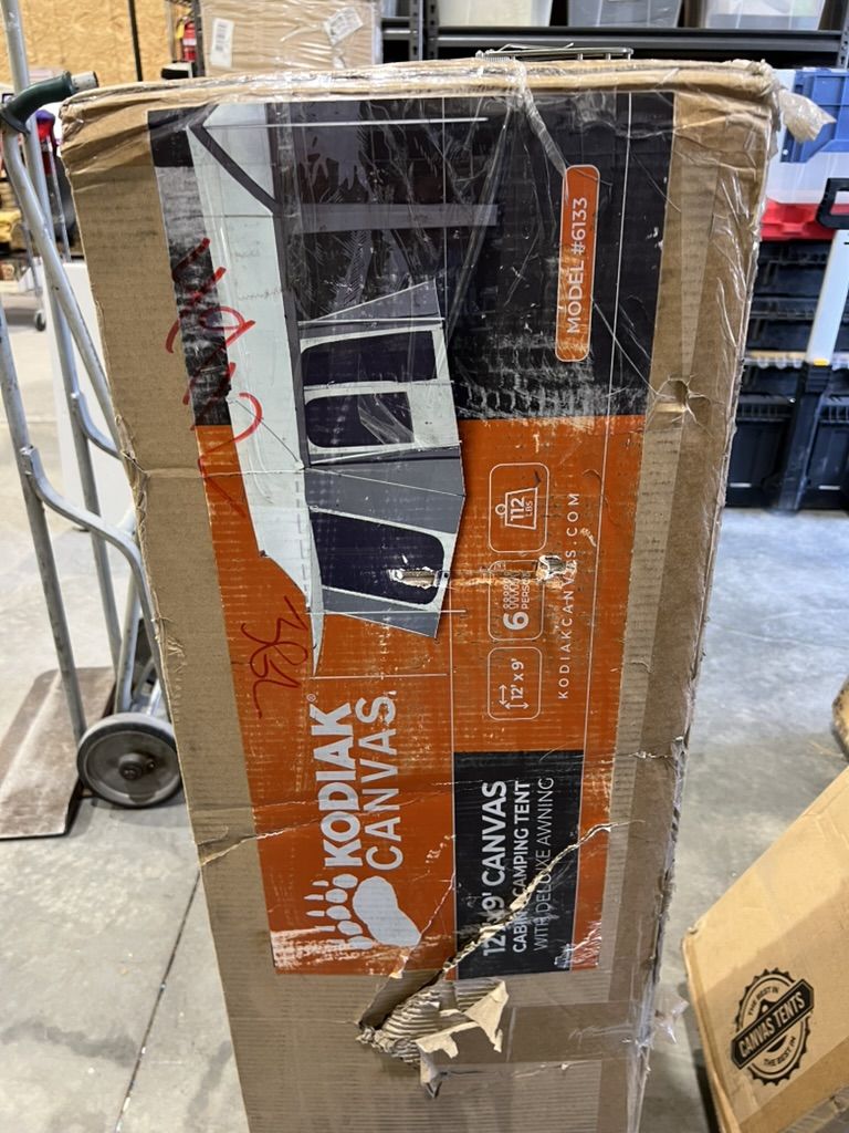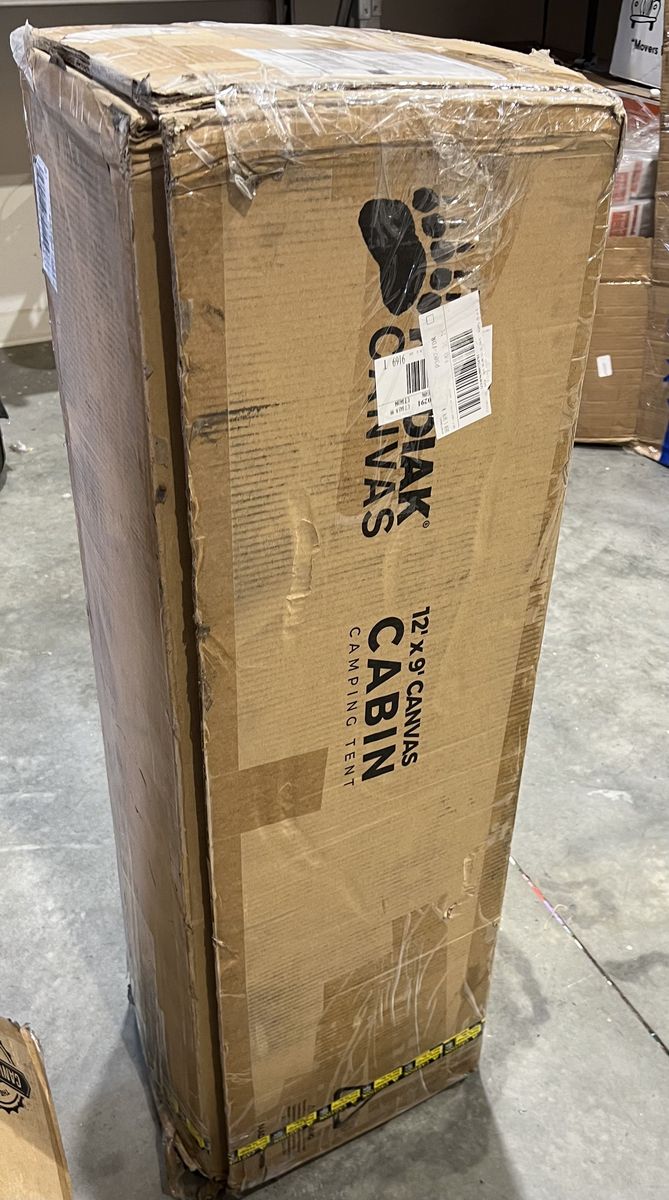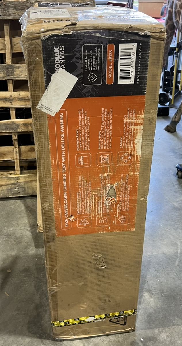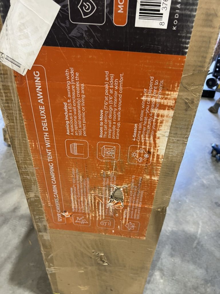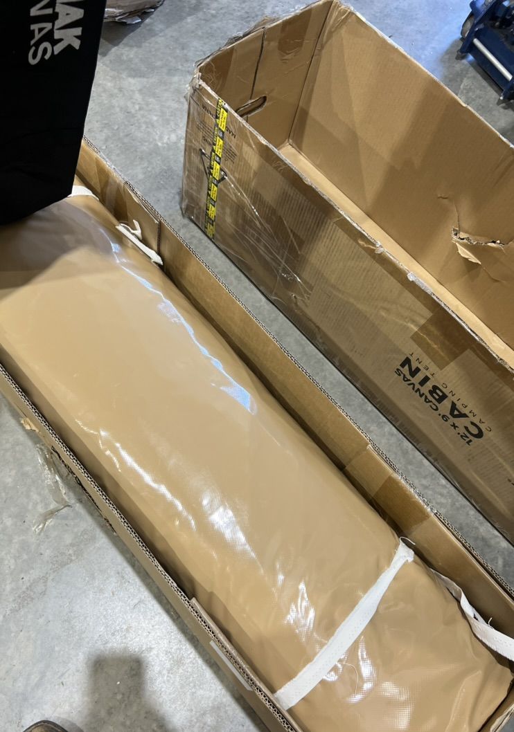 Box shows wear with tears and dents; contents appear unused. Box dimensions: 52" x 16" x 13".