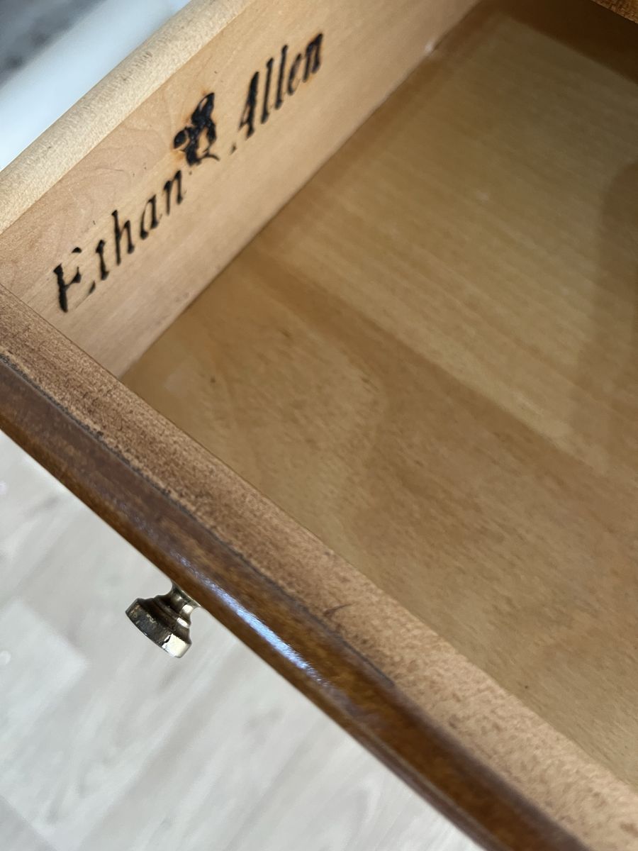 Set of Ethan Allen 3-Drawer Dressers (set of 2, SELLING ONLY AS A SET) Very similar but not identical twins. Solid wood construction but 1 dresser has a plastic laminate top. Some wear as shown.