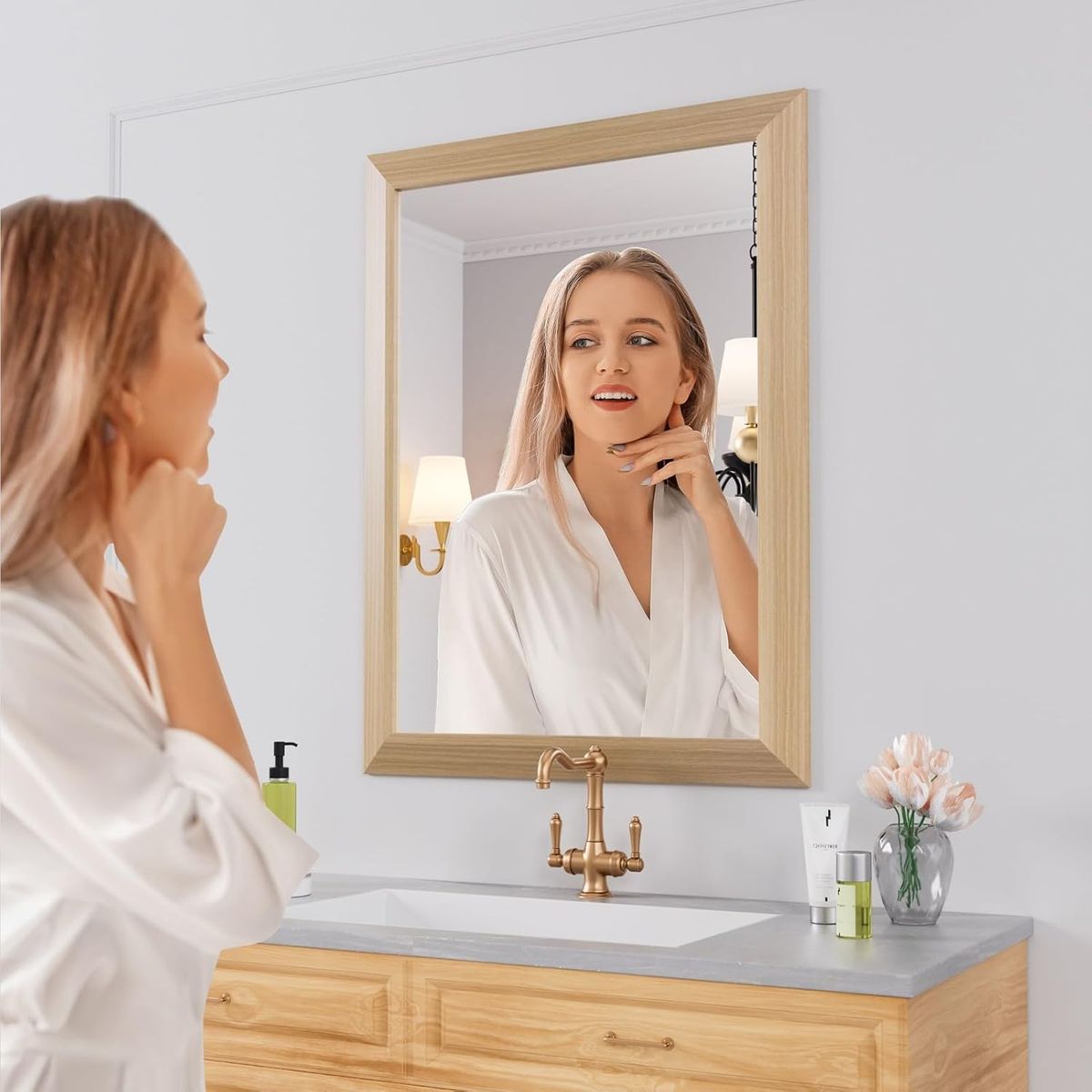 ApplePayAmorho 24x32 Inch Bathroom Mirror for Wall, Oak Wood Grain Metal Framed Mirror, Anti-Rust, Hang Horizontally/Vertically, Suitable for Bedroom, Farmhouse, Bathroom, Decorative