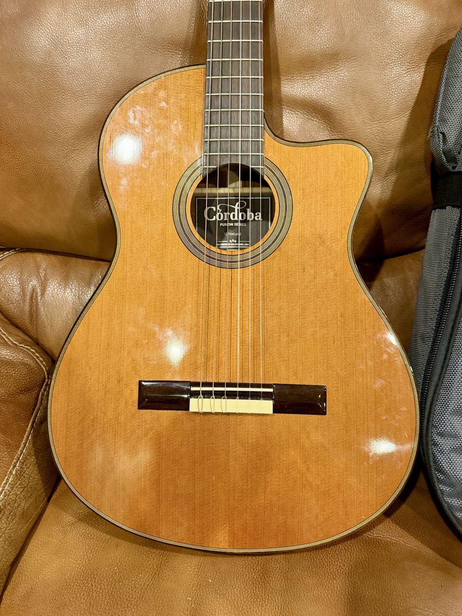 VenmoIf you're looking for any easy transition to classical guitar from a steel string acoustic, you'll love the Cordoba Fusion 12 Natural. The 12 Natural is aptly named, with 12 frets up to the neck joint, with a total of 19 frets and a cutaway design for easy access. Crossover guitarists will feel comfortable with the thin-profile mahogany neck and 1.875" nut width. And for optimum tone, the 12 Natural sports mahogany back and sides with a solid cedar top. You even get the Fishman Presys pickup system, for great sounding plugged-in performance. For a fast playing, great looking, and rich sounding nylon-string guitar, get the Cordoba Fusion 12 Natural.