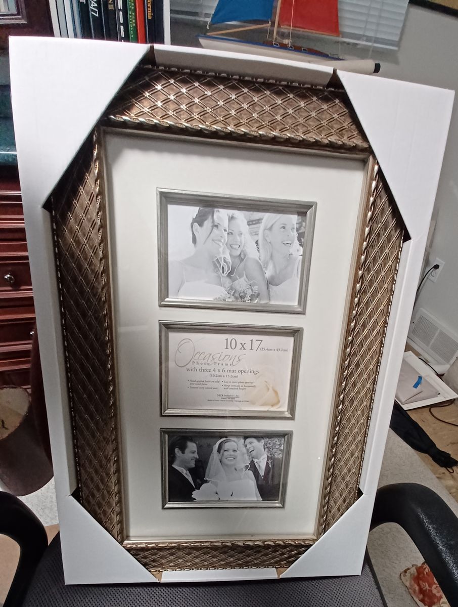 Picture frame. Size 10 x17, with three 4 x 6 openings. I have 3 of them. $20 each.