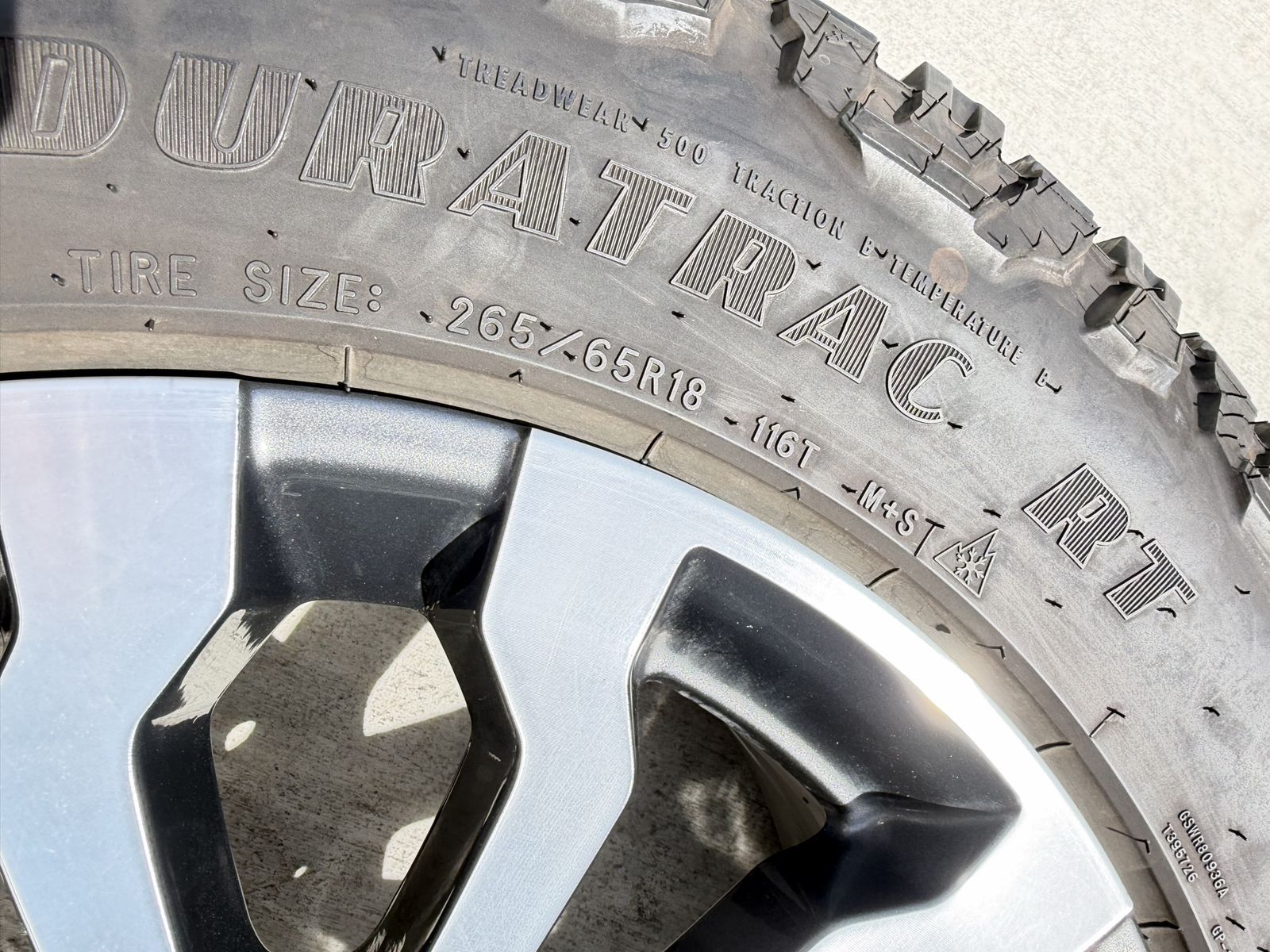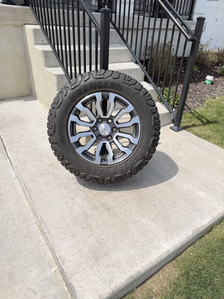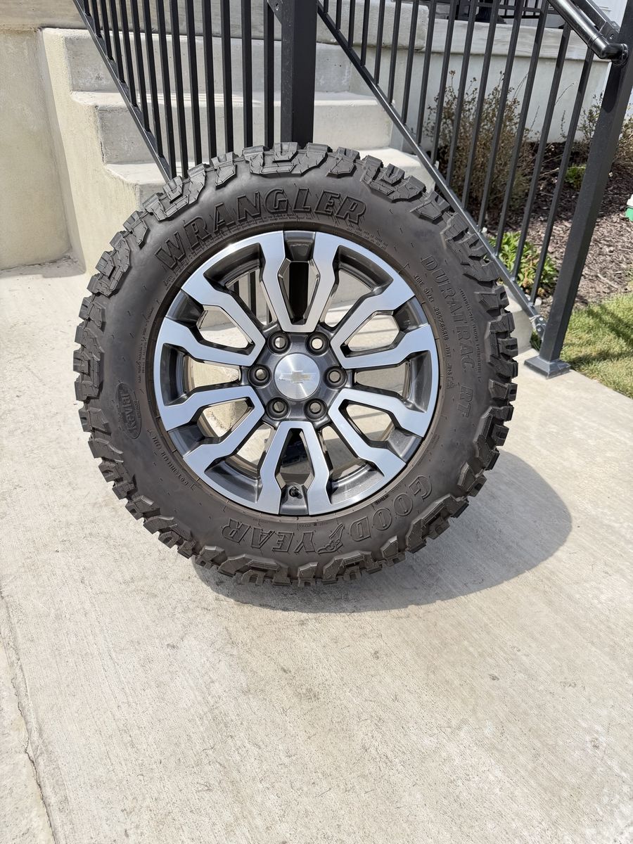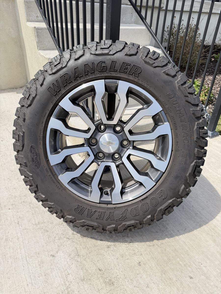 ApplePaySet of 4-Chevy Silverado 1500 Tahoe Suburban Rims and Tires 265/65R18 Goodyear Wrangler Duratrac Almost New only 500 miles on them,asking $1800 obo Comes with lug nuts and sensors Bolt pattern 6-5.5/6-139.7