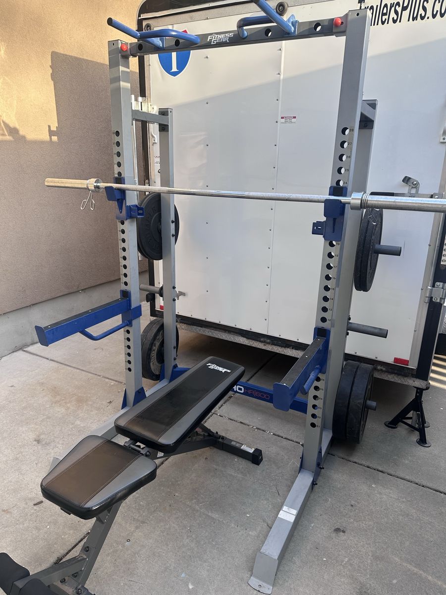 VenmoFitness Gear Half Rack with adjustable bar catchers, safety bars, oversized dip station, 7 ft 45 lb barbell, and bumper plates (2x45, 2x25, 4x10). Selling it all together for $460 FIRM.