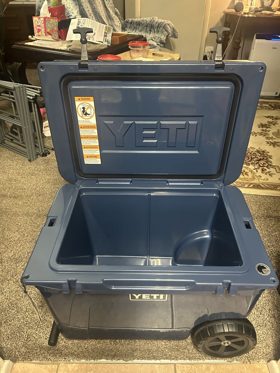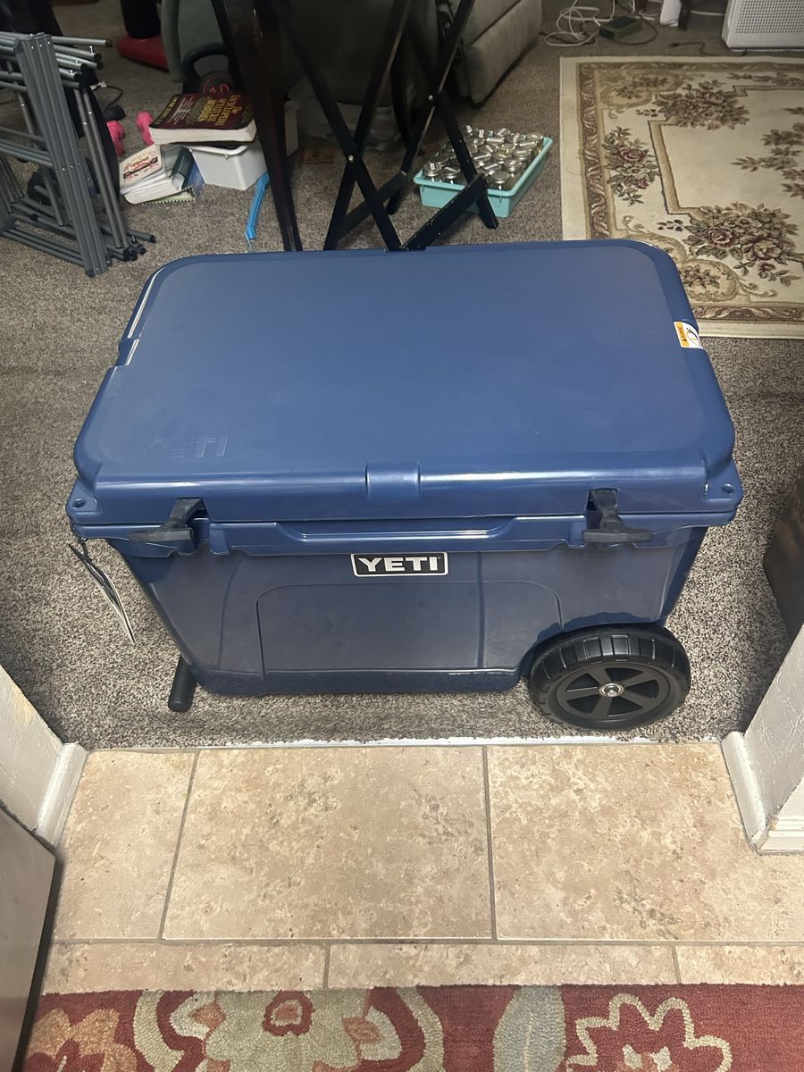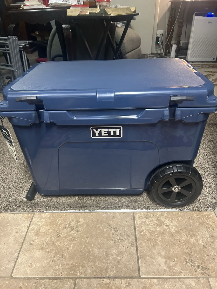 PayPalYeti Wheeled Tundra Haul Cooler Navy. (Retail price is $450) Easily transport goods to family picnics and that perfect tailgating spot. Fits 82 cans (only) Fits 64 lbs of ice (only) Retail ($450) Text 801-923-2005
