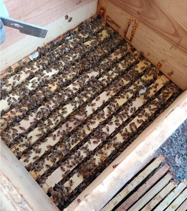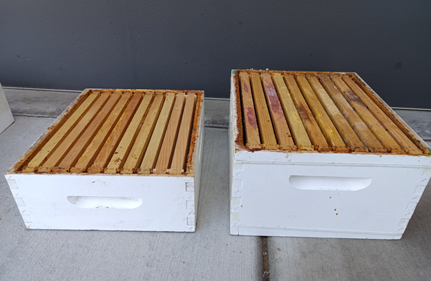 Each hive has approximately 8-10 frames of honey, tons bees, lots of capped brood, etc: