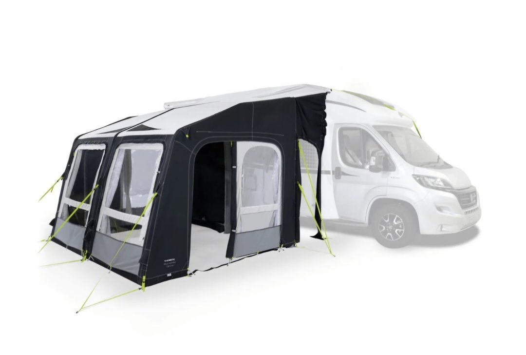 The Dometic Rally AIR Pro 330 DA Inflatable Drive-Away Camper Van Awning features a durable, water-resistant canopy material with a reinforced frame for reliable performance in wind and rain.