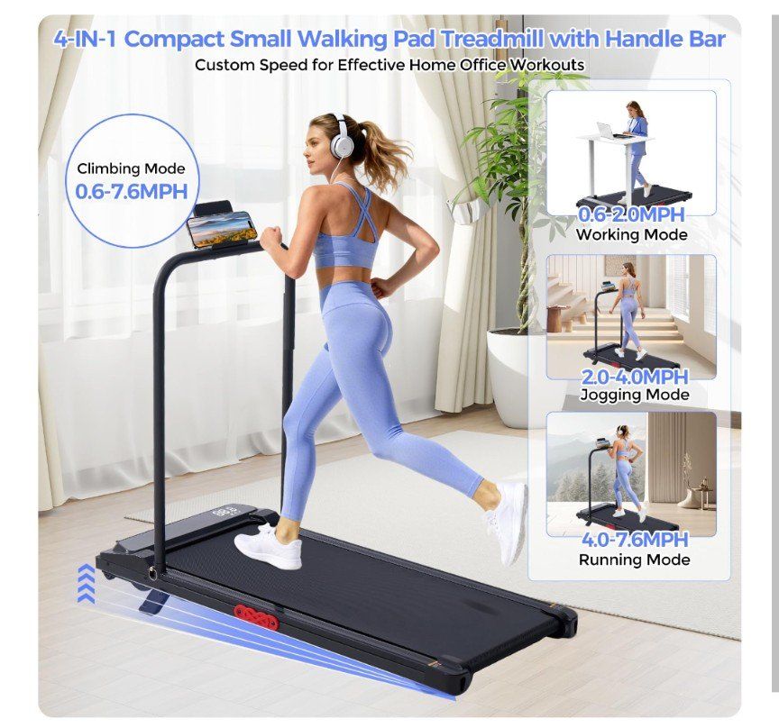 4-in-1 Under the Desk Treadmill with Incline for Home Office Fitness: This 4-in-1 compact treadmill with handles functions as both an under desk walking pad treadmill for office use and an incline running treadmill for home workouts. With four workout modes—walking, jogging, running, and climbing—you can customize your training routine. The detachable handrails allow you to quickly switch between a compact treadmill for small spaces and an under desk treadmill for walking while working or studying.