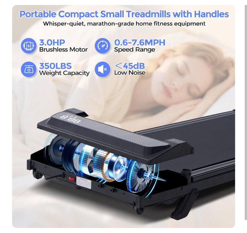 Portable Electric Treadmill for Home with 3.0HP Quiet Motor: Powered by a 3.0HP quiet brushless motor, this portable running treadmill ensures smooth walking, jogging, and running with ultra-low noise—perfect for shared living spaces. Unlike outdoor running, this quiet treadmill for home lets you exercise anytime, rain or shine. The low-noise motor and shock-absorbing anti-slip belt allow you to work out even late at night without disturbing neighbors or family.