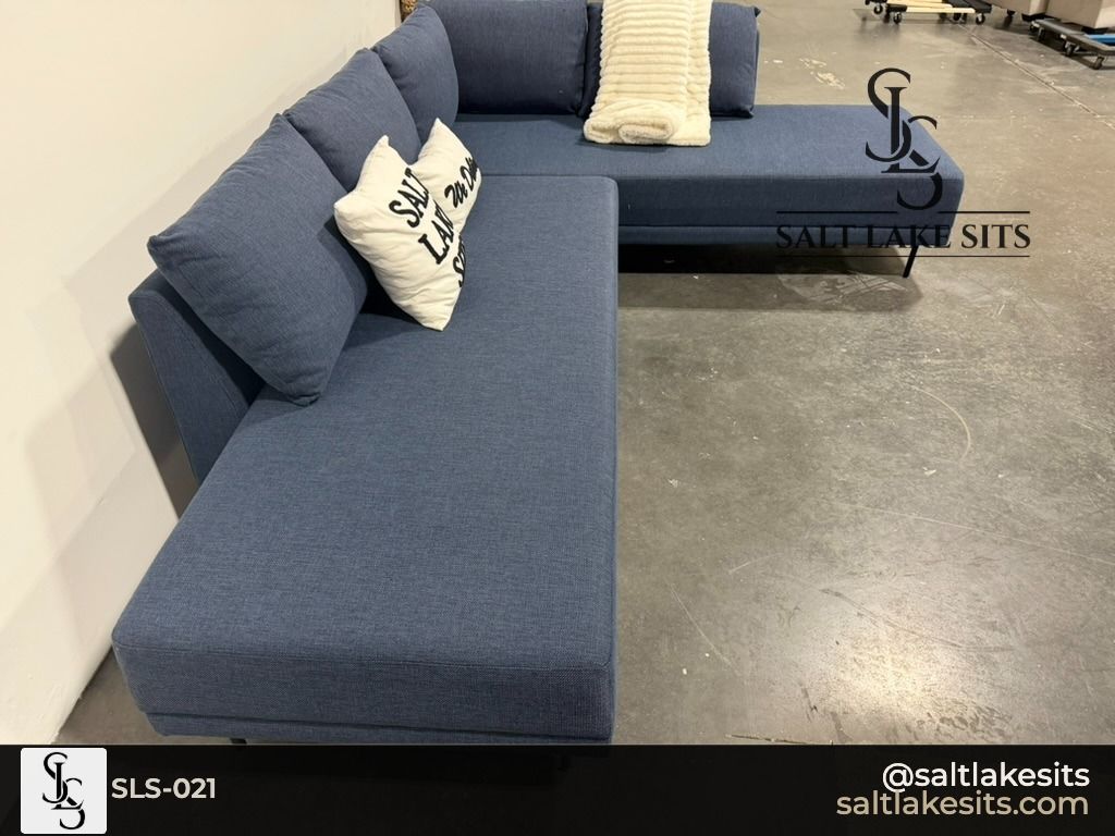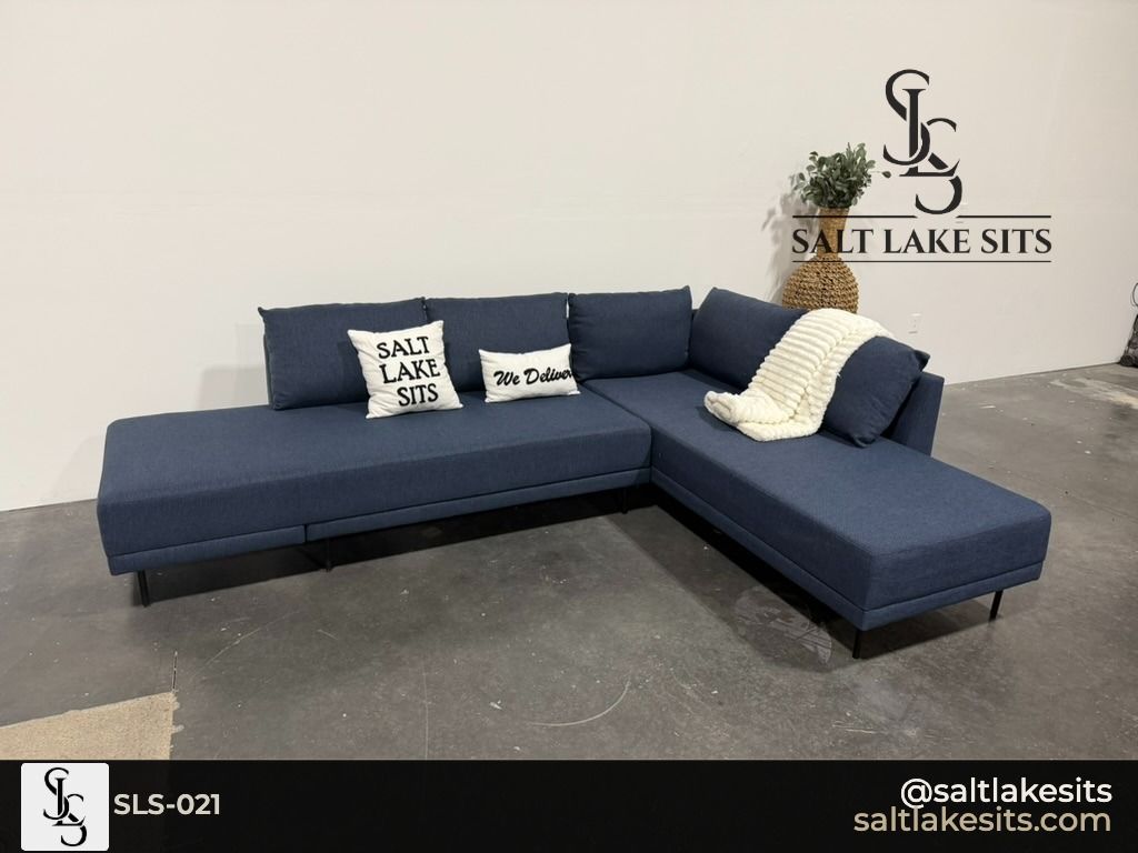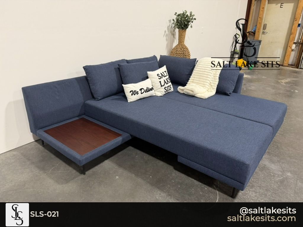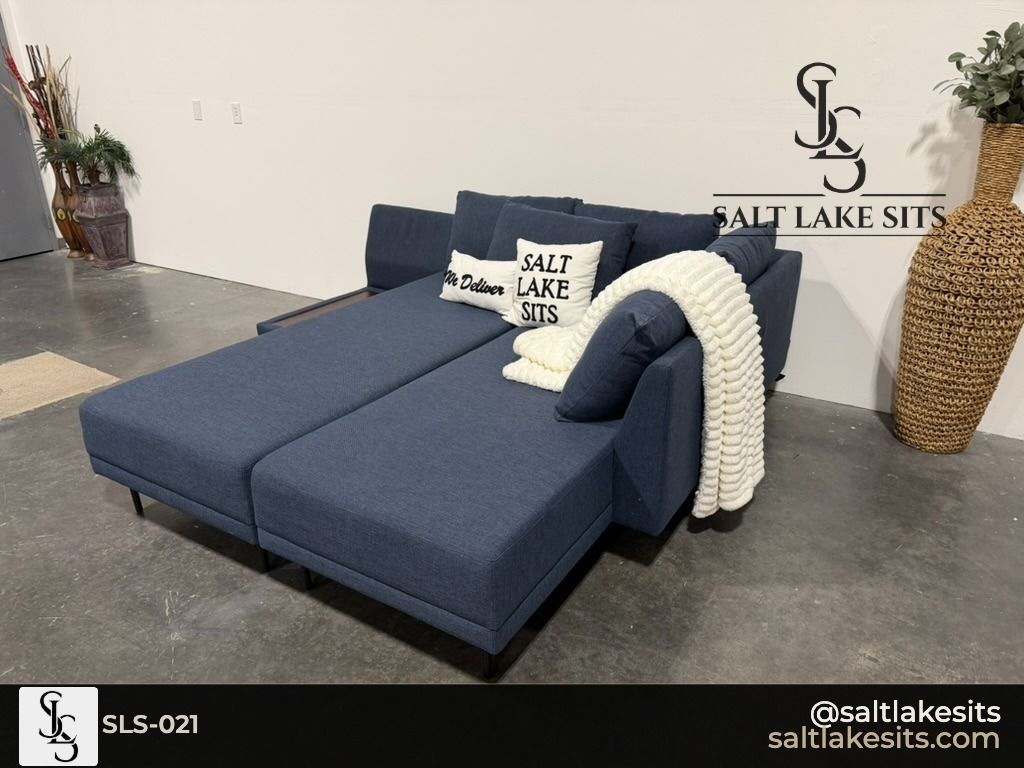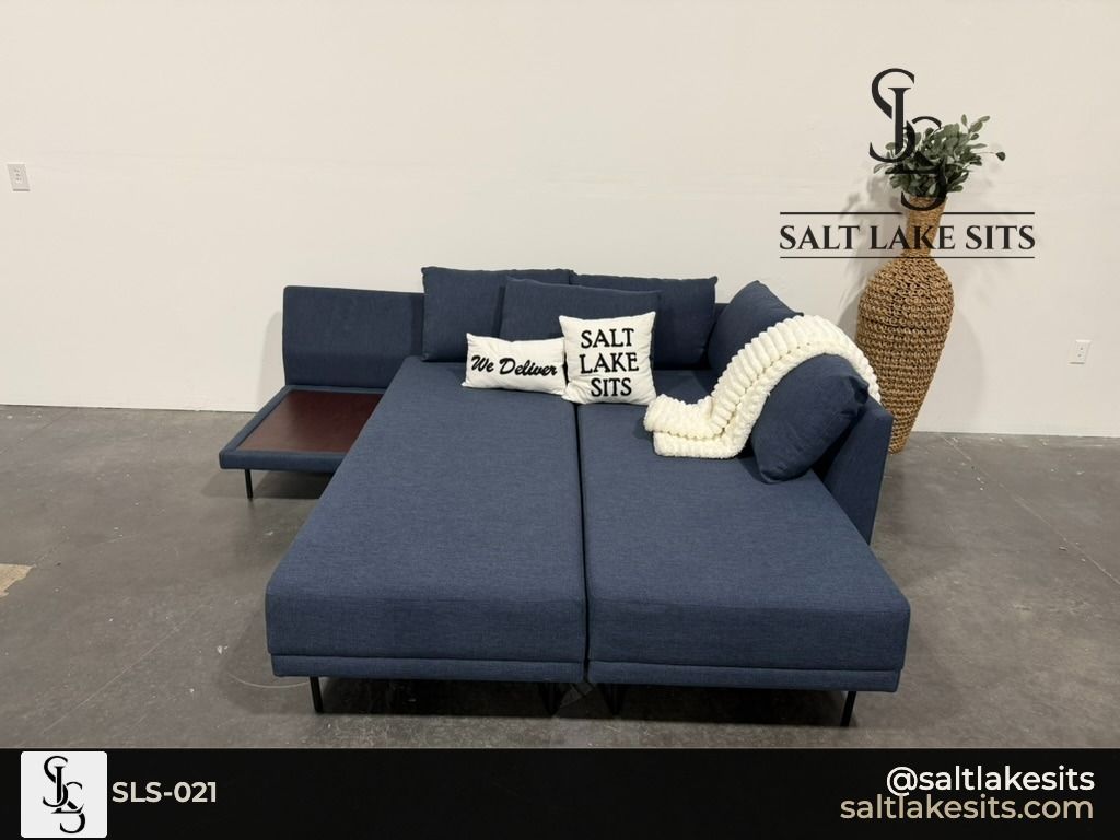 Navy Blue Sleeper Sectional — Modern, low profile design with sleek black metal legs. Deep navy blue fabric with a clean contemporary look. Pulls out into a sleeper — perfect for guests. Includes built-in side table on the chaise end. Good condition, professionally cleaned. Dimensions in photos.