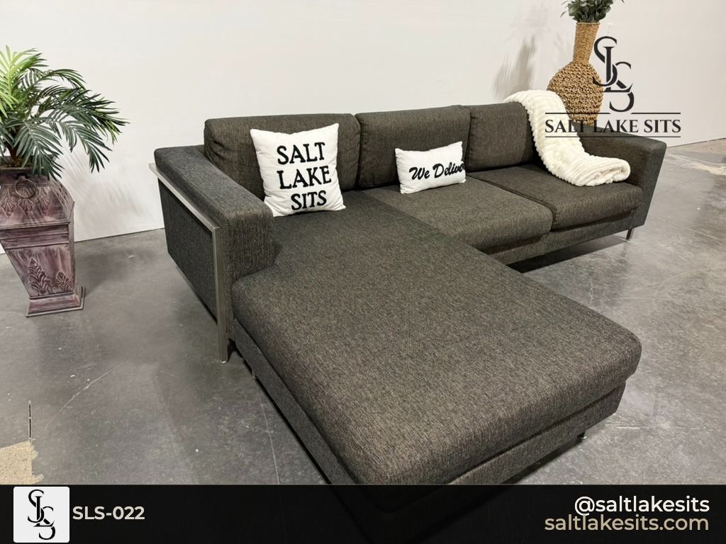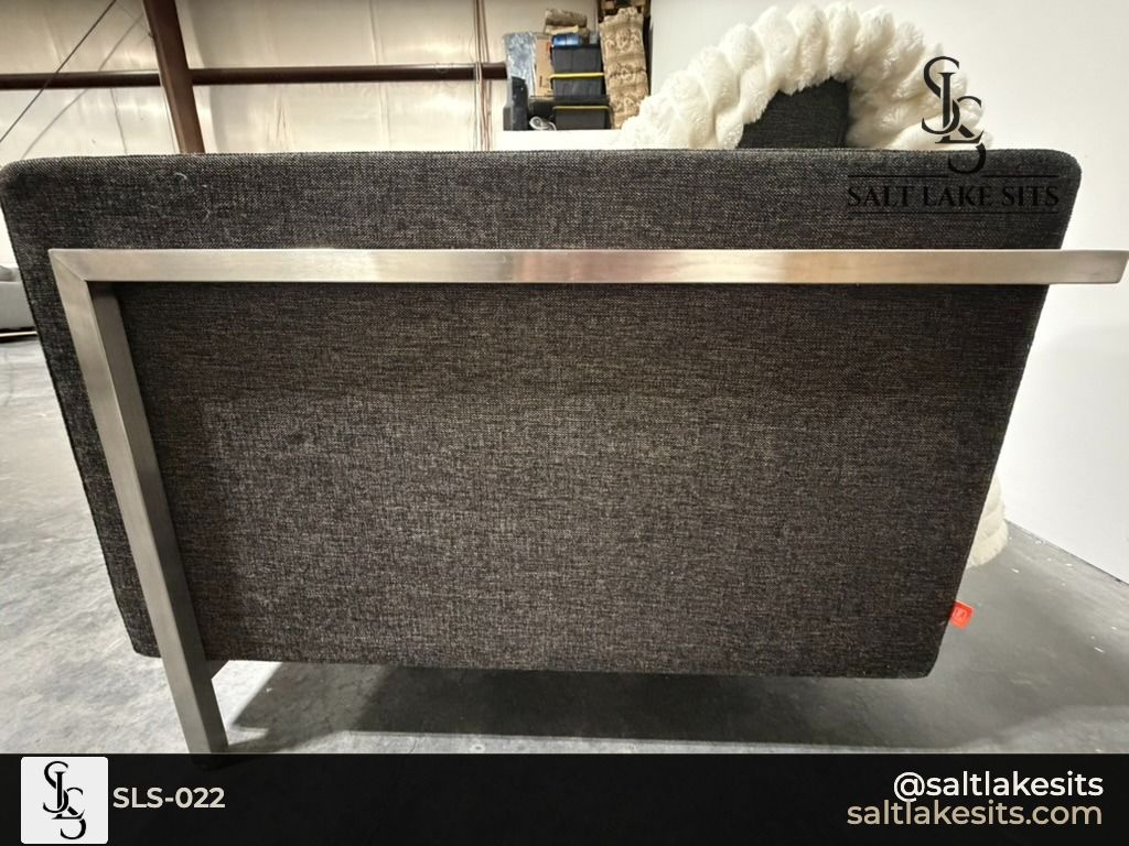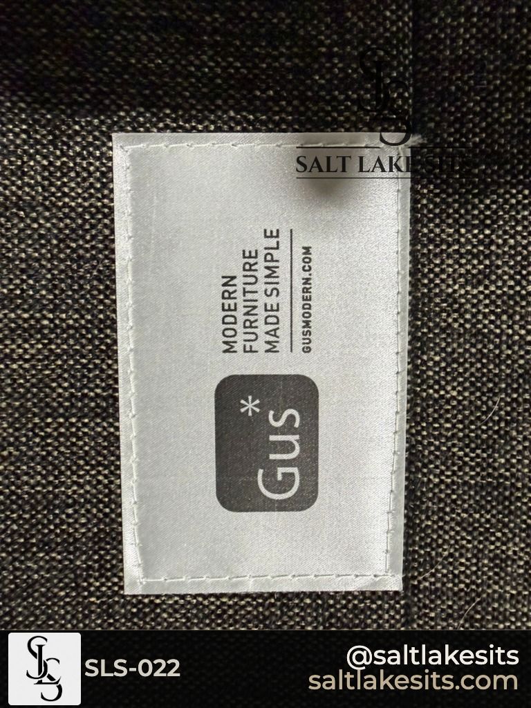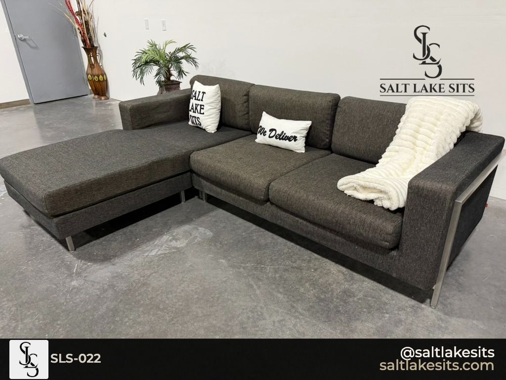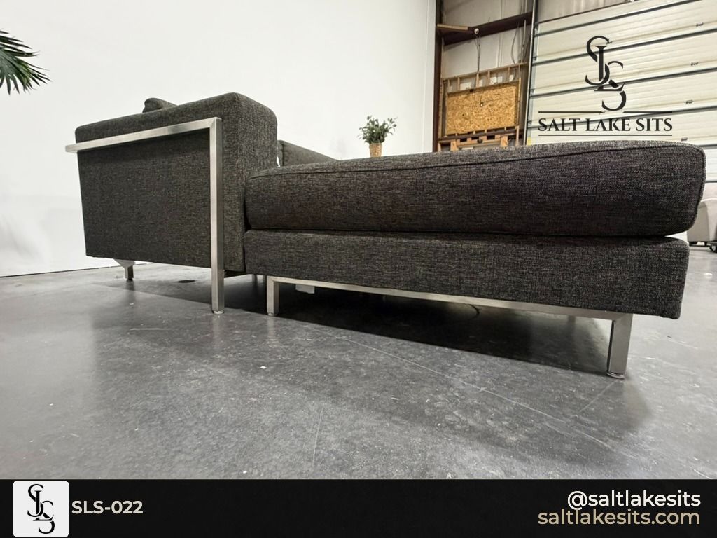 Gus Modern Chaise Sectional — One of the most respected names in modern furniture design. Clean lines, low profile, dark charcoal fabric with sleek metal legs. This is a designer piece at a fraction of the price. Good condition, professionally cleaned. Dimensions in photos.