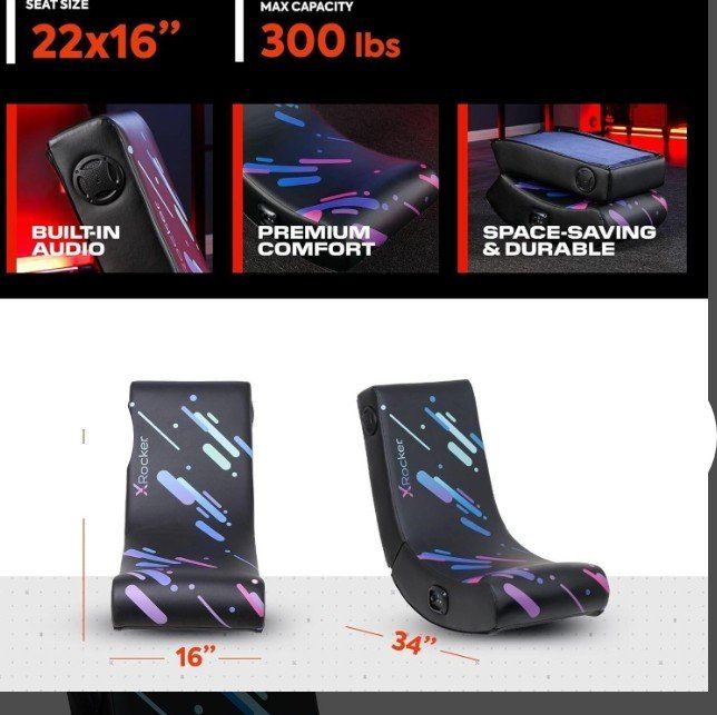 VenmoBUILT-IN SPEAKERS | Features 2 headrest mounted speakers to create maximum, high-quality surround sound audio for an immersive experience with no noticeable latency ROCKS & RECLINES | Unique floor rocker design for rocking and reclining allows you to find the perfect position for extended game play with maximum comfort MULTI-PLATFORM COMPATIBILITY | Connects via wireless Bluetooth, or wired option, to all of your favorite gaming consoles (PS5, Xbox Series X/S, Xbox One, PlayStation 4, Nintendo Switch), TVs, PC Computers, and smart devices. An additional digital audio transmitter may be needed depending on your TV outputs (sold separately) COMFORT & DURABILITY | Durable vegan leather padded seat is designed to withstand hours of high-performance gaming or movie marathons for adults and teens COMPACT & FOLDABLE | Easy to assemble and folds down for storage when not in play to easily carry and store. A perfect compact floor rocker design for smaller spaces. Open dimensions 33 x 26 x 17