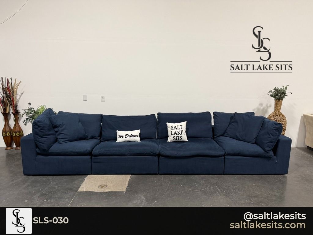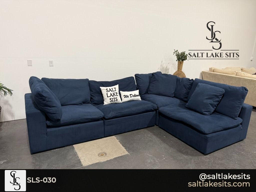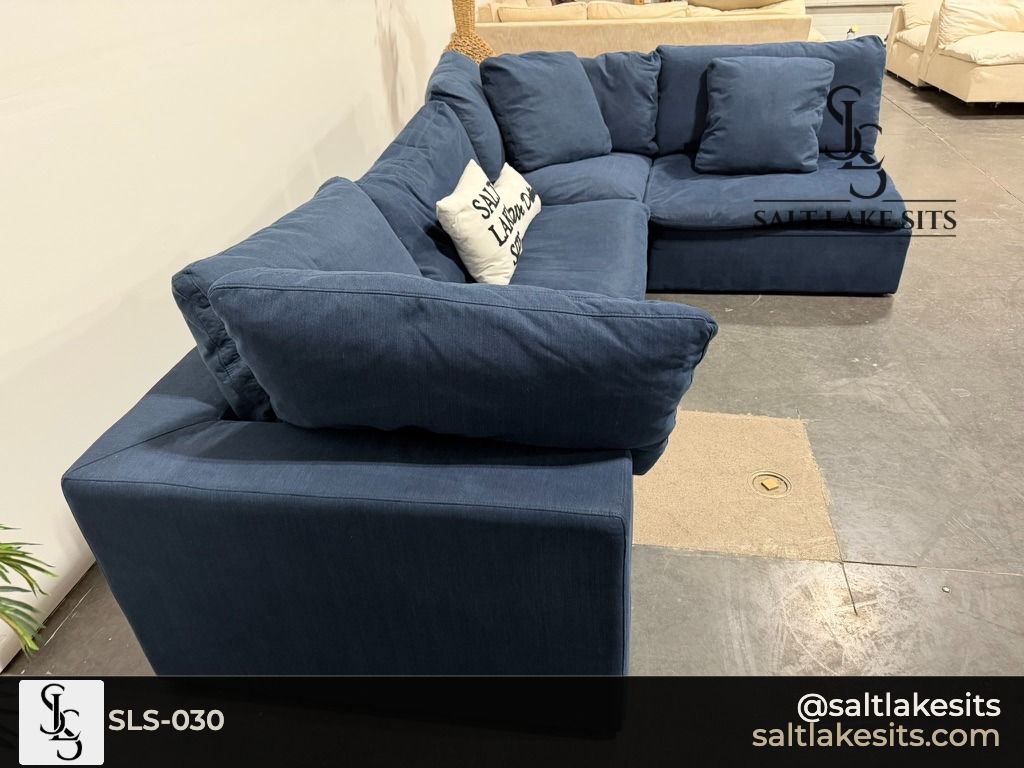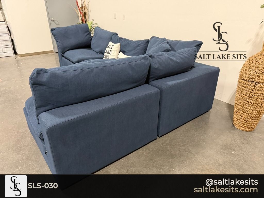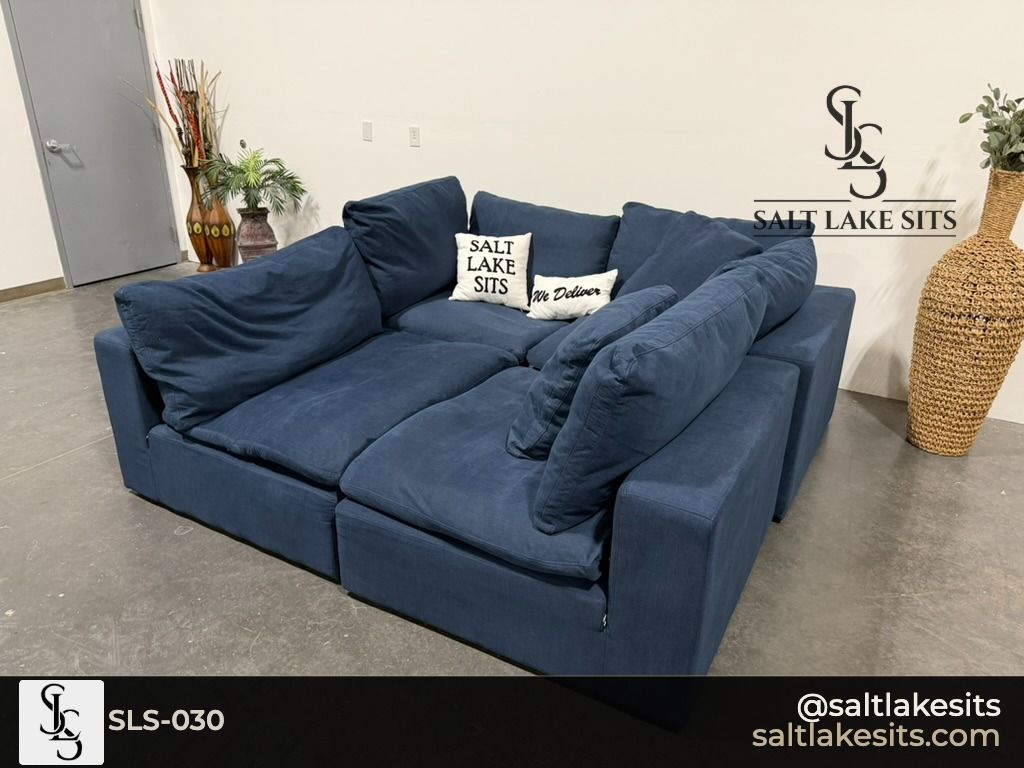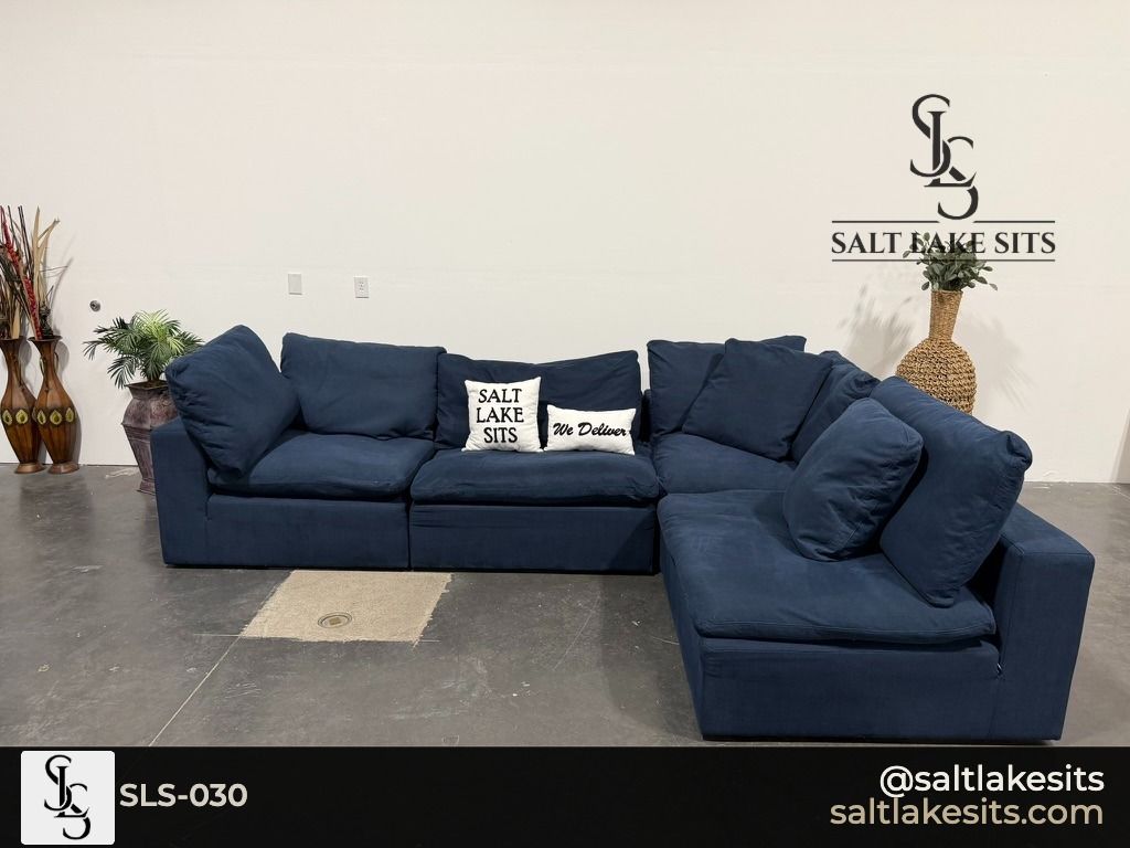 Down East Feather Modular Luxe Sectional — Navy Blue. This is the cloud couch everyone wants. Fully modular, feather filled cushions that sink you in from the moment you sit down. Great condition, professionally cleaned. Dimensions in photos.