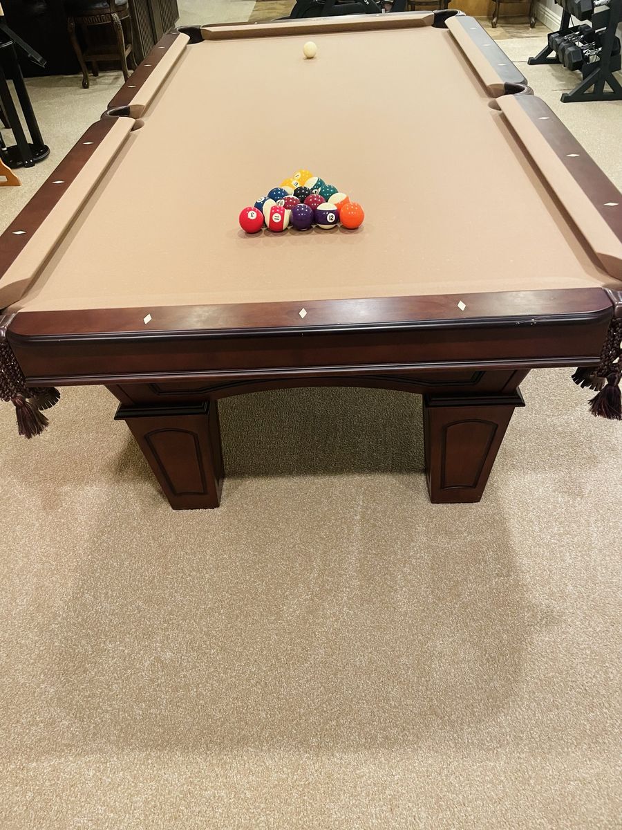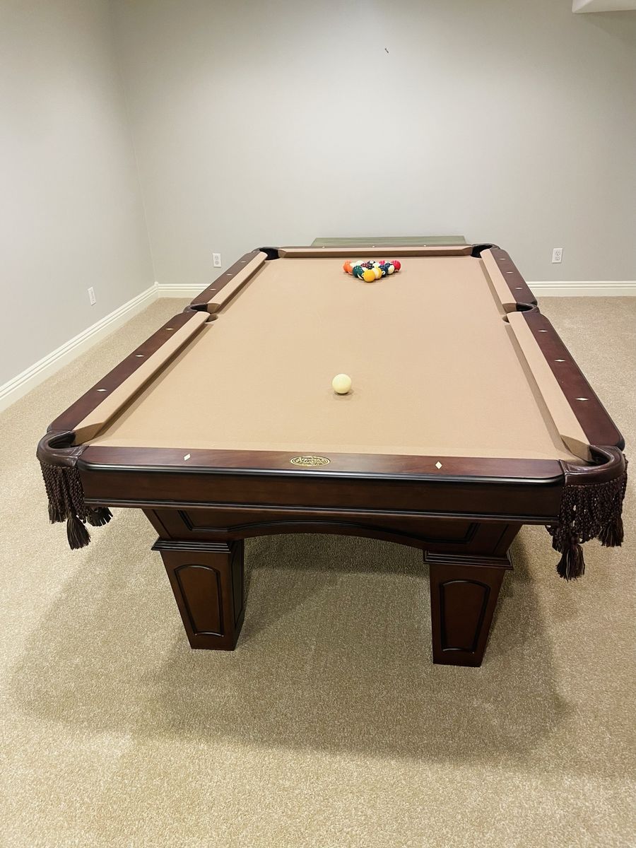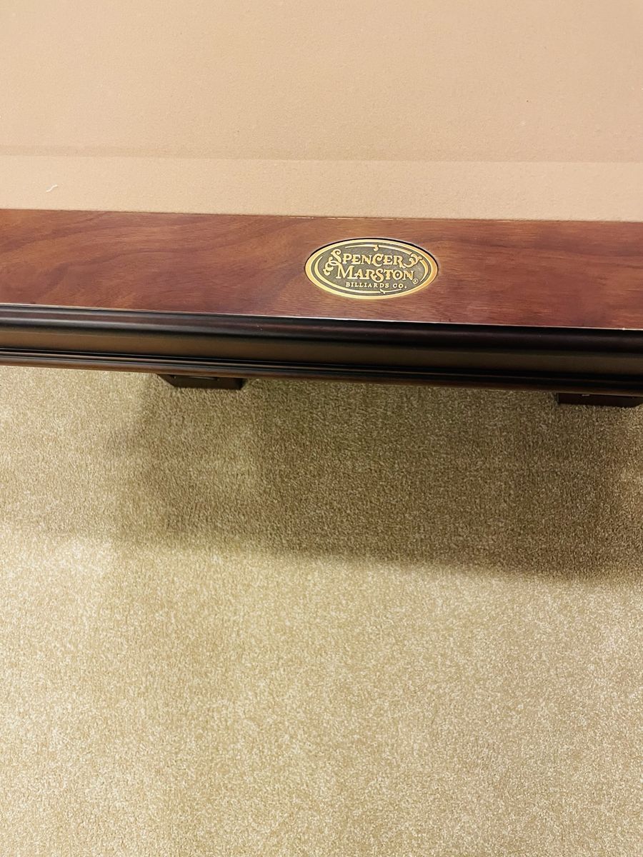 High-quality slate table with a rich wood finish and classic leather pockets with tassels—timeless, high-end look.
