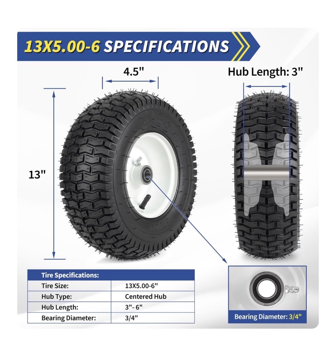 VenmoGICOOL 13×5.00-6 Rubber Lawn Mower Tire and Wheel, 2 Pcs Replacement 13×5- 6nhs Riding Mowers Lawn Pneumatic Tire with Bearing Bore 3/4" & 5/8", 3" - 4.5" Centered Hub Brand New