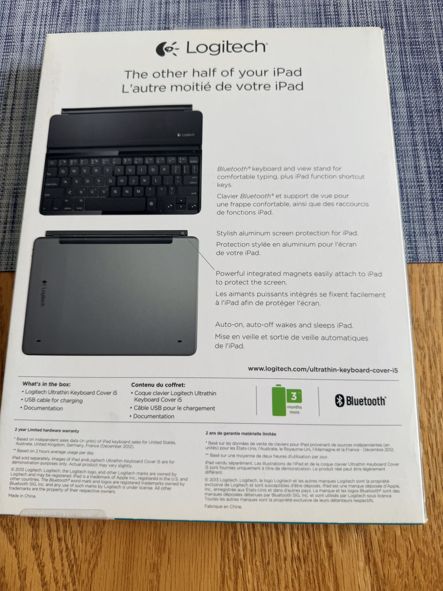 Brand New, never used and in the original box, this Logitech Ultrathin Keyboard Cover (Model i5) is for the original iPad Air. It’s a combined protective cover and Bluetooth keyboard that transforms the tablet into a functional workspace.