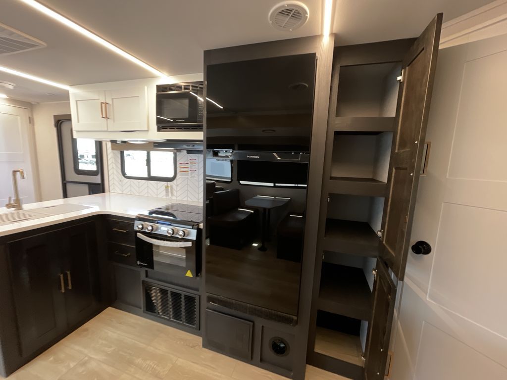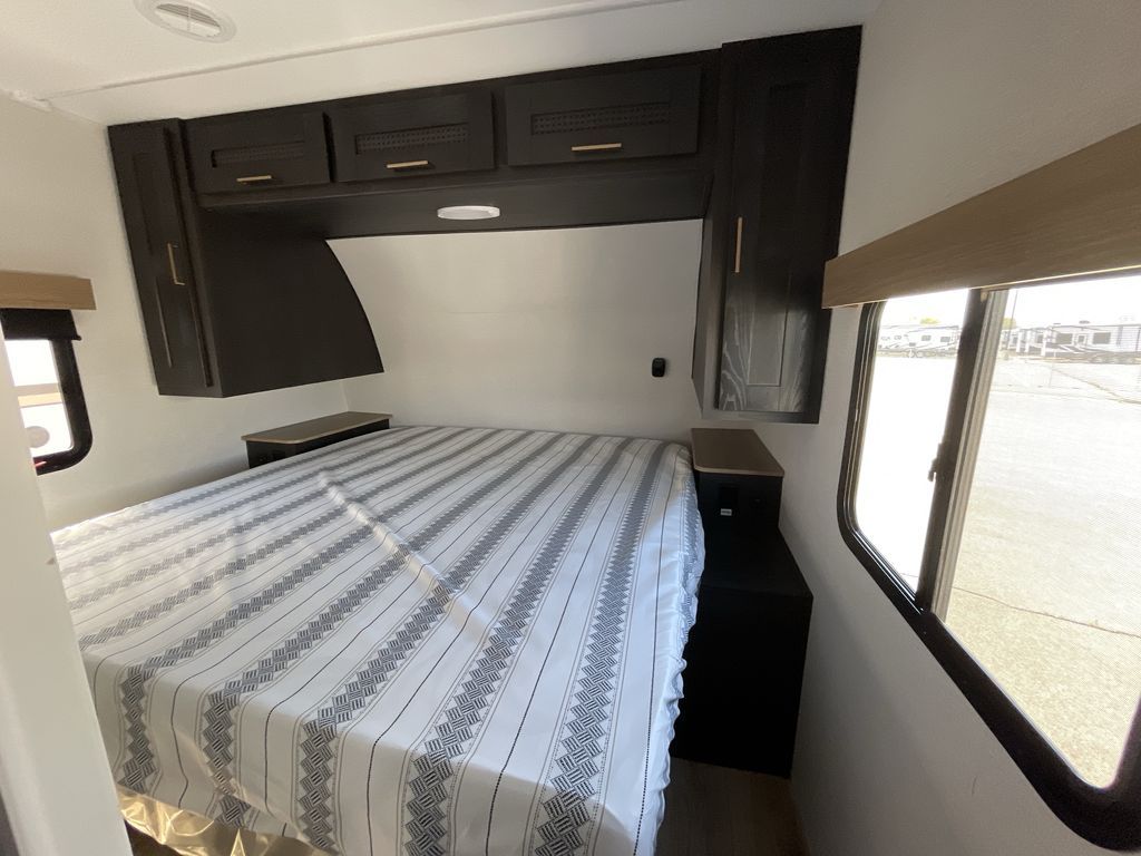 You'll love camping with friends and family in this dual entry travel trailer! One of the doors leads to the full bath so you can easily access it when you're visiting outdoors with friends. There are double-size bunks where the little ones or your guests can sleep, while you take the king bed in the front private bedroom. Everyone can meet in the combined kitchen and living room in the morning while the cook makes breakfast on the three burner cooktop. There is a booth dinette and sofa here for seating and sleeping space, although you might just want to sit under the 19' awning if breakfast is being made at the exterior kitchen!